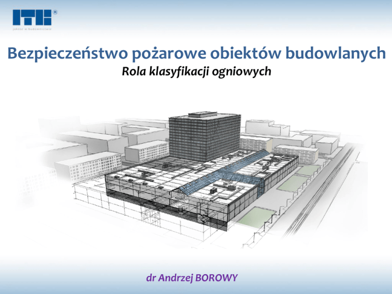 Bezpieczeństwo pożarowe obiektów budowlanych Rola klasyfikacji ogniowych dr Andrzej BOROWY KLASYFIKACJE OGNIOWE • REAKCJA NA OGIEŃ • ODPORNOŚĆ OGNIOWA I DYMOSZCZELNOŚĆ • KLASYFIKACJE ELEMENTÓW SKŁADOWYCH SYSTEMÓW WENTYLACJI • ODPORNOŚĆ DACHÓW NA ODDZIAŁYWANIE OGNIA ZEWNĘTRZNEGO • ROZPRZESTRZENIANIE OGNIA • REAKCJA NA OGIEŃ KABLI ELEKTRYCZNYCH 2 KLASYFIKACJA OGNIOWA (1) ODPORNOŚĆ OGNIOWA DYMOSZCZELNOŚĆ ROZPRZESTRZENIANIE OGNIA 3 KLASYFIKACJA OGNIOWA (2) STOPIEŃ PALNOŚCI (REAKCJA NA OGIEŃ) TOKSYCZNOŚĆ DYMOTWÓRCZOŚĆ PŁONĄCE KROPLE I ODPADY 4 KLASYFIKACJA OGNIOWA (3) ZAPEWNIENIE DOSTAW ENERGII FUNKCJONOWANIE W WARUNKACH POŻARU 5 KLASYFIKACJA OGNIOWA (4) ELEMENTY BUDYNKU ODPORNOŚĆ OGNIOWA DYMOSZCZELNOŚĆ ROZPRZESTRZENIANIE OGNIA DODATKOWO: STOPIEŃ PALNOŚCI REAKCJA NA OGIEŃ CZĘŚCI SKŁADOWE ELEMENTÓW, WYKOŃCZENIE, WYPOSAŻENIE STOPIEŃ PALNOŚCI REAKCJA NA OGIEŃ TOKSYCZNOŚĆ DYMOTWÓRCZOŚĆ PŁONĄCE KROPLE I ODPADY 6 KLASYFIKACJA OGNIOWA (5) URZĄDZENIA ZADZIAŁANIE W OKREŚLONYM CZASIE FUNKCJONOWANIE PRZEZ OKREŚLONY CZAS ZACHOWANIE KSZTAŁTU INSTALACJE ELEKTRYCZNE ZAPEWNIENIE DOSTAW ENERGII DODATKOWO ROZPRZESTRZENIANIE OGNIA / REAKCJA NA OGIEŃ 7 KLASYFIKACJA OGNIOWA (6) ODPORNOŚĆ OGNIOWA KONSTRUKCJA ELEMENTY PODZIAŁU (ściany, stropy, podłogi podniesione, sufity podwieszone) ZAMKNIĘCIA OTWORÓW PRZEPUSTY INSTALACYJNE PRZEWODY WENTYLACYJNE 8 KLASYFIKACJA OGNIOWA (7) DYMOSZCZELNOŚĆ ZAMKNIĘCIA OTWORÓW ROZPRZESTRZENIANIE OGNIA ŚCIANY ZEWNĘTRZNE, OCIEPLENIA DACHY PRZEWODY INSTALACYJNE, IZOLACJE PRZEWODÓW TOKSYCZNOŚĆ, DYMOTWÓRCZOŚĆ MATERIAŁY WYKOŃCZENIOWE 9 KLASYFIKACJA OGNIOWA (8) PŁONĄCE KROPLE I ODPADY SUFITY OKŁADZINY SUFITOWE FUNKCJONOWANIE KURTYNY DYMOWE KLAPY DYMOWE WENTYLATORY ODDYMIAJĄCE 10 NORMY USTALAJĄCE KLASYFIKACJE OGNIOWE • REAKCJA NA OGIEŃ PN-EN 13501-1 • ODPORNOŚĆ OGNIOWA PN-EN 13501-2, -3 • ELEMENTY SKŁADOWE SYSTEMÓW WENTYLACJI PN-EN 13501-4 • ODPORNOŚĆ DACHÓW NA ODDZIAŁYWANIE OGNIA ZEWNĘTRZNEGO PN-EN 13501-5 • REAKCJA NA OGIEŃ KABLI PN-EN 13501-6 • ROZPRZESTRZENIANIE OGNIA (ŚCIANY) PN-B-02867 • URZĄDZENIA PN-EN 12101 normy wyrobów np. 11 KLASYFIKACJA W ZAKRESIE REAKCJI NA OGIEŃ W POLSCE Wyroby budowlane klasyfikuje się w Polsce dotychczas wg następujących cech: - niepalność, - stopień palności, - stopień rozprzestrzeniania ognia. 12 STOPIEŃ PALNOŚCI (REAKCJA NA OGIEŃ) NIEPALNY NIEZAPALNY TRUDNOZAPALNY ŁATWOZAPALNY 13 STOPIEŃ PALNOŚCI (REAKCJA NA OGIEŃ) DYMOTWÓRCZOŚĆ TOKSYCZNOŚĆ PŁONĄCE KROPLE/ODPADY SAMOGAŚNIĘCIE 14 REAKCJA NA OGIEŃ I ROZPRZESTRZENIANIE OGNIA DWA SCENARIUSZE • POŻAR WEWNĄTRZ BUDYNKU ELEMENTY WEWNĘTRZNE, W TYM ŚCIANY ZEWNĘTRZNE EUROKLASY • POŻAR NA ZEWNĄTRZ BUDYNKU ZEWNĘTRZNE POWIERZCHNIE ŚCIAN ZEWNĘTRZNYCH NORMY KRAJOWE – NIE MA NORMY EUROPEJSKIEJ 15 ROZPRZESTRZENIANIE OGNIA – WEDŁUG PRZEPISÓW POLSKICH Z uwagi na stopień rozprzestrzeniania ognia należy oceniać takie elementy obiektów budowlanych jak: • ściany wewnętrzne i zewnętrzne przy działaniu ognia od strony pomieszczenia, • ściany zewnętrzne przy działaniu ognia od strony elewacji, • okładziny ścienne wewnętrzne i zewnętrzne na podłożu z materiałów niepalnych przy działaniu ognia od strony okładzin, • dachy przy działaniu ognia od strony pokrycia i od strony okapu, • izolacje rur i kanałów. 16 ROZPRZESTRZENIANIE OGNIA Pod względem stopnia rozprzestrzeniania ognia elementy budowli klasyfikuje się jako: • nierozprzestrzeniające ognia, które w obszarze działania źródła ognia mogą ulec spaleniu, a poza tym obszarem nie ulegają spaleniu; nie dopuszcza się spalania po czasie badania, ani też występowania płonących kropli lub odpadów stałych, • słabo rozprzestrzeniające ogień, które mogą ulegać spalaniu poza obszarem działania źródła ognia w zakresie określonym w kryteriach oceny badania; nie dopuszcza się spalania po czasie badania, ani też występowania płonących kropli i odpadów stałych, • silnie rozprzestrzeniające ogień, które ulegają spalaniu: poza obszarem działania źródła ognia, poza zakresem określonym w kryteriach oceny przyjętym dla elementów słabo rozprzestrzeniających ogień, po czasie badania lub z występowaniem płonących kropli lub odpadów stałych. 17 ŚCIANY, OCIEPLENIA, DACHY, PRZEWODY INSTALACYJNE, IZOLACJE PRZEWODÓW Nierozprzestrzeniające ognia, NRO Słabo rozprzestrzeniające ogień, SRO Silnie rozprzestrzeniające ogień 18 19 WYROBY BUDOWLANE – BEZ POSADZEK Oznaczenie Określenie podstawowe Określenie uzupełniające Niepalne ― Niezapalne ― Trudno zapalne ― Łatwo zapalne ― ― Niekapiące ― Samogasnące ― Intensywnie dymiące ― Klasyfikacja wg PN-EN 13501-1 Klasy dodatkowe Klasa Wydzielanie Płonące podstawowa dymu krople/cząstki A1 ― ― A2 s1, s2, s3 d0 A2 s1, s2, s3 d1, d2 B s1, s2, s3 d0, d1, d2 C s1, s2, s3 d0, d1, d2 D D E E A1 A2, B, C, D co najmniej E A2, B, C, D E E F s1 d0, d1, d2 s2, s3 d0, d1, d2 ― ― ― d2 ― ― s1, s2, s3 d0 ― ― s3 d0, d1, d2 ― ― ― d2 20 Właściwości nieokreślone 20 KLASYFIKACJA W ZAKRESIE REAKCJI NA OGIEŃ – POSADZKI Oznaczenie Klasyfikacja wg PN-EN 13501-1 Określenie podstawowe Określenie dodatkowe Niepalne ― Trudno zapalne ― Klasa podstawowa Klasa dodatkowa w zakresie wydzielania dymu A1fl ― A2fl s1, s2 Bfl s1, s2 Cfl s1, s2 Dfl s1, s2 Efl ― Łatwo zapalne ― ― Intensywnie dymiące A2fl, Bfl, Cfl, Dfl s2 Efl ― ― ― Ffl Właściwości nieokreślone 21 ELEMENTY NIEROZPRZESTRZENIAJĄCE OGNIA Klasy dodatkowe Klasa podstawowa w zakresie wydzielania dymu w zakresie występowania płonących kropli/cząstek A1 - - A2 s1, s2, s3 d0 B s1, s2, s3 d0 22 ELEMENTY SŁABO ROZPRZESTRZENIAJĄCE OGIEŃ Klasy dodatkowe Klasa podstawowa w zakresie wydzielania dymu w zakresie występowania płonących kropli/cząstek C s1, s2, s3 d0 D s1 d0 23 KLASY WYROBÓW W LINIOWYCH E