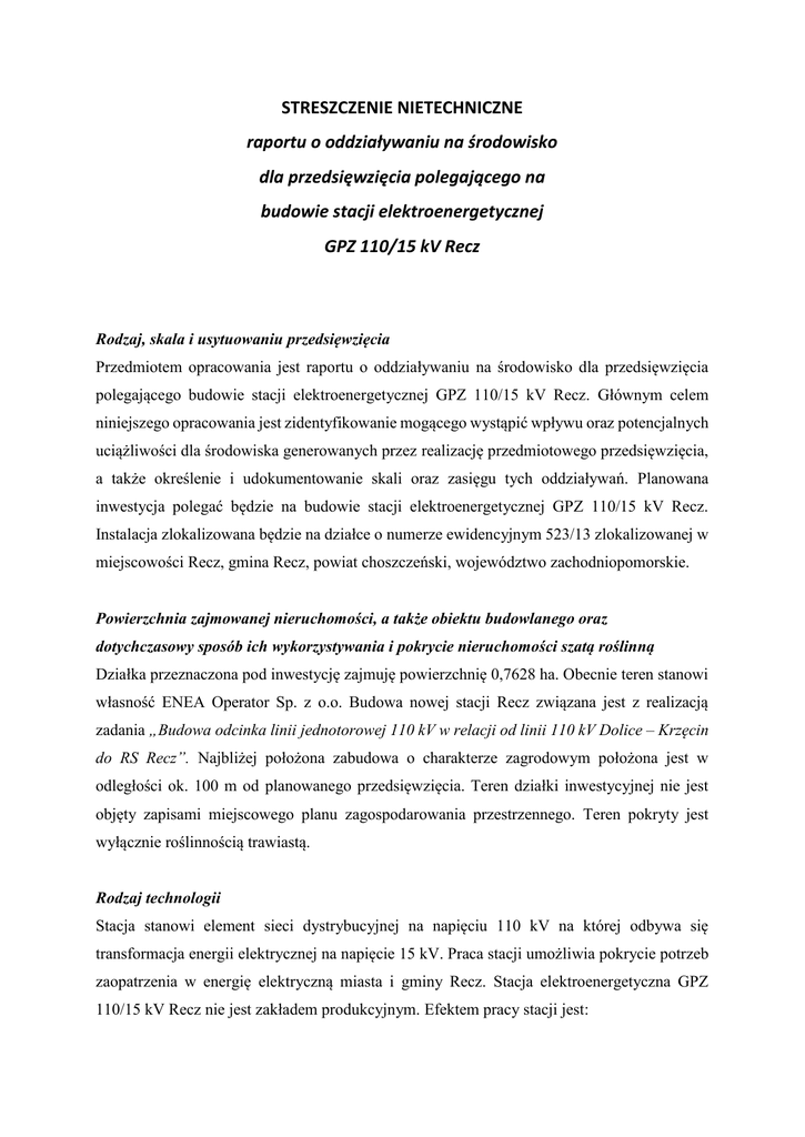 STRESZCZENIE NIETECHNICZNE raportu o oddziaływaniu na środowisko dla przedsięwzięcia polegającego na budowie stacji elektroenergetycznej GPZ 110/15 kV Recz Rodzaj, skala i usytuowaniu przedsięwzięcia Przedmiotem opracowania jest raportu o oddziaływaniu na środowisko dla przedsięwzięcia polegającego budowie stacji elektroenergetycznej GPZ 110/15 kV Recz. Głównym celem niniejszego opracowania jest zidentyfikowanie mogącego wystąpić wpływu oraz potencjalnych uciążliwości dla środowiska generowanych przez realizację przedmiotowego przedsięwzięcia, a także określenie i udokumentowanie skali oraz zasięgu tych oddziaływań. Planowana inwestycja polegać będzie na budowie stacji elektroenergetycznej GPZ 110/15 kV Recz. Instalacja zlokalizowana będzie na działce o numerze ewidencyjnym 523/13 zlokalizowanej w miejscowości Recz, gmina Recz, powiat choszczeński, województwo zachodniopomorskie. Powierzchnia zajmowanej nieruchomości, a także obiektu budowlanego oraz dotychczasowy sposób ich wykorzystywania i pokrycie nieruchomości szatą roślinną Działka przeznaczona pod inwestycję zajmuję powierzchnię 0,7628 ha. Obecnie teren stanowi własność ENEA Operator Sp. z o.o. Budowa nowej stacji Recz związana jest z realizacją zadania „Budowa odcinka linii jednotorowej 110 kV w relacji od linii 110 kV Dolice – Krzęcin do RS Recz”. Najbliżej położona zabudowa o charakterze zagrodowym położona jest w odległości ok. 100 m od planowanego przedsięwzięcia. Teren działki inwestycyjnej nie jest objęty zapisami miejscowego planu zagospodarowania przestrzennego. Teren pokryty jest wyłącznie roślinnością trawiastą. Rodzaj technologii Stacja stanowi element sieci dystrybucyjnej na napięciu 110 kV na której odbywa się transformacja energii elektrycznej na napięcie 15 kV. Praca stacji umożliwia pokrycie potrzeb zaopatrzenia w energię elektryczną miasta i gminy Recz. Stacja elektroenergetyczna GPZ 110/15 kV Recz nie jest zakładem produkcyjnym. Efektem pracy stacji jest: · odebranie energii elektrycznej dostarczanej liniami przesyłowymi 110 kV, · przetworzenie odebranej energii z napięcia 110 kV na napięcie 15 kV w transformatorze mocy, · przekazanie przetworzonej energii do przyłączonych linii dystrybucyjnych 15 kV. Przetworzenie energii z napięcia 110 kV na napięcie 15 kV odbywa się z wykorzystaniem zjawisk fizycznych, a nie procesów produkcyjnych. Ewentualne warianty przedsięwzięcia Przy analizie wariantowej wzięto pod uwagę wariant technologiczny. Rozpatrzono także wariant realizacyjny wraz z jego wpływem na środowisko i uzasadnieniem wyboru. Opisano także przyczyny z jakich odstąpiono od wyznaczenia racjonalnego wariantu alternatywnego. Przewidywane ilości wykorzystywanej wody, surowców, materiałów, paliw oraz energii oraz rodzaj i przewidywana ilości wprowadzanych do środowiska substancji lub energii przy zastosowaniu rozwiązań chroniących środowisko Stacja elektroenergetyczna będzie obiektem bezobsługowym zdalnie sterowanym. Pracownicy będą przebywali na terenie stacji jedynie na wypadek okresowych przeglądów, a także w razie awarii Stacji. Pracownicy będą przebywali w budynku technicznym wyposażonym w zaplecze socjalne. Przewiduje się, że przedsięwzięcie potencjalnie może być źródłem: · emisji hałasu w zakresie słyszalnym, związany z pracą stacji transformatorowej; · odpadów; · oddziaływania elektromagnetycznego; · ścieków bytowych – związanych z obecnością pracowników obsługujących stację, jak również pracowników pracujących przy budowie stacji. Rozwiązania chroniące środowisko Faza budowy stacji spowoduje lokalnie zwiększenie wielkości emisji hałasu oraz zanieczyszczeń gazowych i pyłowych związanych z pracą sprzętu budowlanego. Mimo okresowości oddziaływania zostaną podjęte środki minimalizujące wpływ fazy budowy stacji na środowisko poprzez: · zastosowanie maszyn i urządzeń sprawnych technicznie celem minimalizacji ryzyka skażenia związkami ropopochodnymi, · ograniczanie czasu pracy sprzętu do niezbędnego minimum, · prowadzenie uciążliwych prac budowlanych wyłącznie w porze dziennej pomiędzy godzina 6.00 – 22.00, · prowadzenie prac w sposób powodujący w jak najmniejszym stopniu wtórne pylenie (zraszanie powierzchni nieutwardzonych przydługo trwałych suszach w okresie letnim), · ograniczenia prędkości pojazdów w celu minimalizacji oddziaływania akustycznego, powstające odpady będą zbierane w sposób selektywny magazynowa w miejscach do tego przystosowanych, a następnie przekazywane wyspecjalizowanym firmom do odzysku lub unieszkodliwienia. Na etapie eksploatacji Stacji w celu minimalizacji oddziaływania instalacji na środowisko przyrodnicze transformatory mocy zostaną ustawione na fundamentach wyposażonych w szczelne misy olejowe zabezpieczające środowisko gruntowo – wodne w sytuacji awaryjnego wycieku oleju. Misa olejowa będzie posiadała pojemność dostosowaną do przejęcia 100% ilości oleju wraz z wodą gaśniczą z 5 minutowej akcji gaśniczej. Wody opadowe z terenu Stacji będą zbierane systemem kanalizacji deszczowej. Wody te, zbierane z fundamentów pod transformatory przed wprowadzeniem do odbiornika zostaną podczyszczone na separatorze. Natomiast wody z dachów obiektów są odprowadzane do gruntu – nie przewiduje się zmian w tym zakresie. Separator będzie systematycznie czyszczony przez specjalistyczne firmy. Powstające ścieki bytowe będą odprowadzane do bezodpływowego zbiornika – szamba. Ponadto na terenie stacji będzie prowadzony stały monitoring techniczny pracujących urządzeń. Możliwe transgraniczne oddziaływanie na środowisko Ze względu na lokalizacje i charakter przedsięwzięcia nie zakłada się transgranicznego oddziaływania