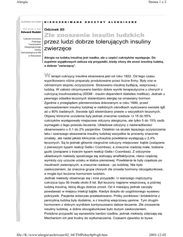 Alergia Strona 1 z 2 ALERGIA 4/15 2002 Prof. dr hab. n. med. Edward Rudzki Członek honorowy Polskiego Towarzystwa Alergologicznego Klinika Dermatologiczna AM w Warszawie N I E O C Z E K I W A N E O D C Z Y N Y A L E R G I C Z N E Odcinek XII Złe znoszenie insulin ludzkich przez ludzi dobrze tolerujących insuliny zwierzęce Alergia na ludzką insulinę jest rzadka, ale u części cukrzyków występuje. Do zupełnie wyjątkowych zalicza się przypadki, kiedy chory źle znosi insulinę ludzką, a dobrze "zwierzęcą". W terapii cukrzycy insulina stosowana jest od roku 1922. Od tego czasu wypróbowano różne preparaty produkowane przez liczne firmy. Były one w odmiennym stopniu oczyszczone. Stosowano insulinę bydlęcą, wieprzową i ludzką. W całości otrzymywano bardzo dobre wyniki terapeutyczne u chorych z cukrzycą insulinozależną (IDDM - insulin-dependent diabetes mellitus). Jednak u pewnego odsetka leczonych stwierdzano alergię na omawiany hormon. Zgodnie z przeglądem piśmiennictwa dokonanym w roku 1999, przed wprowadzeniem insuliny ludzkiej w niektórych ośrodkach wykrywano swoiste IgE aż u 80% badanych. Swoiste IgG stwierdzano prawie u wszystkich leczonych. Objawy kliniczne uczulenia były jednak znacznie rzadsze. U 15 do 55% cukrzyków występowały miejscowe odczyny alergiczne, ale tylko 5 do 15% osób wymagało z tego powodu leczenia. Układowe odczyny z nadwrażliwości obserwowano u 0,1 do 2% pacjentów. Ostatnio na skutek lepszego oczyszczenia leku i szerszego stosowania insuliny ludzkiej wszystkie te procenty znacznie zmalały, ale nadal jakieś klinicznie uchwytne powikłania występują u 2,4% leczonych. Są to jednak głównie niegroźne odczyny miejscowe: bąble (związane z pierwszym typem reakcji Gella i Coombsa), a znacznie rzadziej małe, bolesne guzki (związane z trzecim typem reakcji Gella i Coombsa). Z odczynów układowych niekiedy spostrzega się wstrząsy anafilaktyczne, nieco częściej wymioty czy uczucie ucisku w klatce piersiowej. Powikłania te były częstsze po insulinach zwierzęcych, a znacznie rzadsze - po ludzkiej. Nie było zaskoczeniem, że znaczna grupa chorych źle znosiła hormony obcogatunkowe, a mogła być leczona hormonem ludzkim. Jednak niekiedy obserwuje się i inne przypadki. U starszego mężczyzny cukrzyca typu IIb trwała około 8 lat. Był leczony najpierw wieprzową, a później ludzką insuliną, którą długo dobrze znosił. Od 4 miesięcy jednak zaczęły powstawać w miejscu iniekcji bąble. Kiedyś doszło do uogólnionego wysiewu pokrzywki. Pacjenta wówczas przetestowano. Próby punktowa i śródskórna z penicyliną ludzką były dodatnie, a z insuliną wieprzową ujemne. Tym drugim hormonem z dobrym wynikiem kontynuowano dalsze leczenie. Złe znoszenie insuliny ludzkiej, a dobre obcogatunkowe było dużym zaskoczeniem. Podobne przypadki są wprawdzie bardzo rzadkie, jednak niekiedy zdarzają się. Mechanizm ich jest trudny do wytłumaczenia. Czasami zjawisko to bywa file://K:\www\alergia\archiwum\02_04\TMPebzc8p9vgb.htm 2003-12-02 Alergia Strona 2 z 2 następstwem zanieczyszczeń, co nie tłumaczy jednak wszystkich powikłań. Zakłada się wówczas, że albo w czasie przygotowania hormonu zachodzą zmiany w czwartorzędowej strukturze insuliny, albo powstają agregaty cząsteczek tego hormonu, ale problem powyższy nadal nie jest przekonująco wyjaśniony. Dodatkowo komplikuje zagadnienie fakt, że część cukrzyków dobrze tolerujących insuliny zwierzęce źle znosi tylko jedną ludzką insulinę, a inni " wszystkie dostępne preparaty tego leku. • file://K:\www\alergia\archiwum\02_04\TMPebzc8p9vgb.htm 2003-12-02