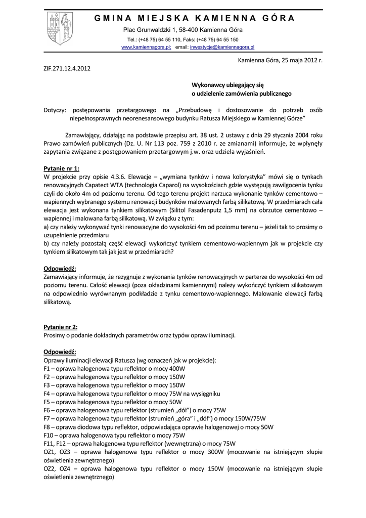 GMINA MIEJSKA KAMIENNA GÓRA Plac Grunwaldzki 1, 58-400 Kamienna Góra Tel.: (+48 75) 64 55 110, Faks: (+48 75) 64 55 150 www.kamiennagora.pl; email: [email protected] Kamienna Góra, 25 maja 2012 r. ZIF.271.12.4.2012 Wykonawcy ubiegający się o udzielenie zamówienia publicznego Dotyczy: postępowania przetargowego na „Przebudowę i dostosowanie do potrzeb osób niepełnosprawnych neorenesansowego budynku Ratusza Miejskiego w Kamiennej Górze” Zamawiający, działając na podstawie przepisu art. 38 ust. 2 ustawy z dnia 29 stycznia 2004 roku Prawo zamówień publicznych (Dz. U. Nr 113 poz. 759 z 2010 r. ze zmianami) informuje, że wpłynęły zapytania związane z postępowaniem przetargowym j.w. oraz udziela wyjaśnień. Pytanie nr 1: W projekcie przy opisie 4.3.6. Elewacje – „wymiana tynków i nowa kolorystyka” mówi się o tynkach renowacyjnych Capatect WTA (technologia Caparol) na wysokościach gdzie występują zawilgocenia tynku czyli do około 4m od poziomu terenu. Od tego terenu projekt narzuca wykonanie tynków cementowo – wapiennych wybranego systemu renowacji budynków malowanych farbą silikatową. W przedmiarach cała elewacja jest wykonana tynkiem silikatowym (Silitol Fasadenputz 1,5 mm) na obrzutce cementowo – wapiennej i malowana farbą silikatową. W związku z tym: a) czy należy wykonywać tynki renowacyjne do wysokości 4m od poziomu terenu – jeżeli tak to prosimy o uzupełnienie przedmiaru b) czy należy pozostałą część elewacji wykończyć tynkiem cementowo-wapiennym jak w projekcie czy tynkiem silikatowym tak jak jest w przedmiarach? Odpowiedź: Zamawiający informuje, że rezygnuje z wykonania tynków renowacyjnych w parterze do wysokości 4m od poziomu terenu. Całość elewacji (poza okładzinami kamiennymi) należy wykończyć tynkiem silikatowym na odpowiednio wyrównanym podkładzie z tynku cementowo-wapiennego. Malowanie elewacji farbą silikatową. Pytanie nr 2: Prosimy o podanie dokładnych parametrów oraz typów opraw iluminacji. Odpowiedź: Oprawy iluminacji elewacji Ratusza (wg oznaczeń jak w projekcie): F1 – oprawa halogenowa typu reflektor o mocy 400W F2 – oprawa halogenowa typu reflektor o mocy 150W F3 – oprawa halogenowa typu reflektor o mocy 150W F4 – oprawa halogenowa typu reflektor o mocy 75W na wysięgniku F5 – oprawa halogenowa typu reflektor o mocy 50W F6 – oprawa halogenowa typu reflektor (strumień „dół”) o mocy 75W F7 – oprawa halogenowa typu reflektor (strumień „góra” i „dół”) o mocy 150W/75W F8 – oprawa diodowa typu reflektor, odpowiadająca oprawie halogenowej o mocy 50W F10 – oprawa halogenowa typu reflektor o mocy 75W F11, F12 – oprawa halogenowa typu reflektor (wewnętrzna) o mocy 75W OZ1, OZ3 – oprawa halogenowa typu reflektor o mocy 300W (mocowanie na istniejącym słupie oświetlenia zewnętrznego) OZ2, OZ4 – oprawa halogenowa typu reflektor o mocy 150W (mocowanie na istniejącym słupie oświetlenia zewnętrznego) OZ5 – oprawa halogenowa typu reflektor o mocy 75W FL – oprawa typu LASER, obrotowa Pytanie nr 3: W przedmiarach brak jest pozycji związanych z kosztami składowania gruzu, ziemi oraz kosztami zajęcia chodnika. Prosimy o uzupełnienie przedmiaru. Odpowiedź: Koszty składowania gruzu należy uwzględnić w cenie wywiezienia odpadów powstałych przy skuwaniu tynków i wykuwania bruzd. Uzyskanie zgody zarządcy drogi na zajęcie pasa drogowego dla potrzeb wykonania prac elewacyjnych oraz ponoszenie opłat z tym związanych należy do obowiązków Wykonawcy (cz. III SIWZ, Istotne postanowienia umowy). Koszt ww. opłat należy uwzględnić w cenie oferty. Pytanie nr 4: Czy zamawiający liczy się z utrudnieniami w pracy urzędu ze względu na prowadzone roboty związane np. z założeniem przewodów systemu sygnalizacji włamania (przekucia, przebicia, tynkowanie bruzd, malowanie)? Czy zamawiający będzie wymagał aby prace te były prowadzone w godzinach popołudniowych? Odpowiedź: Zamawiający wymaga, by prace w pomieszczeniach biurowych były prowadzone po godzinie 15.30 po uprzednim poinformowaniu o tym, osób wskazanych do kontaktu z Wykonawcą. Roboty instalacyjne w pomieszczeniach wieży, poddasza i piwnic mogą być prowadzone bez ograniczeń. Jednocześnie wyjaśniamy, że w przypadku prowadzenia prac w pomieszczeniach biurowych po godz. 15.30, po zakończonych pracach w danym dniu pomieszczenia biurowe należy posprzątać. Z poważaniem: Z up. Burmistrza Miasta Kamiennej Góry Zastępca Burmistrza /-/ Kazimierz Kawa Sprawę prowadzi: Urząd Miasta Kamienna Góra Wydział Zamówień Publicznych, Inwestycji i Funduszy Zewnętrznych Piotr Kepesz, pok. 308 tel. 75 64 55 125 e-mail: [email protected] Otrzymują: 1. Adresat 2. a/a 2