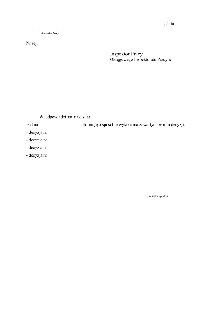 , dnia ...................................... pieczątka firmy Nr rej. Inspektor Pracy Okręgowego Inspektoratu Pracy w W odpowiedzi na nakaz nr ]GQLD informuję o sposobie wykonania zawartych w nim decyzji: - decyzja nr - decyzja nr - decyzja nr - decyzja nr ..................................... pieczątka i podpis
