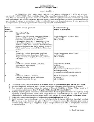OBWIESZCZENIE BURMISTRZA KSIĄŻA WLKP. z dnia 3 lipca 2015 r. Na podstawie art. 16 § 1 ustawy z dnia 5 stycznia 2011 r. Kodeks wyborczy (Dz. U. Nr 21, poz.112 ze zm.) oraz Uchwały Nr XXIII/150/2012 Rady Miejskiej w Książu Wlkp. z dnia 15 października 2012 r. w sprawie podziału Gminy Książ Wlkp. na stałe obwody głosowania podaję do wiadomości publicznej wyborców informacje o numerach i granicach obwodów głosowania oraz siedzibie obwodowej komisji do spraw referendum dostosowanej do potrzeb osób niepełnosprawnych uprawnionych do udziału w referendum a także o możliwości głosowania korespondencyjnego i przez pełnomocnika do przeprowadzenia ogólnokrajowego referendum zarządzonego na dzień 6 września 2015 r. Numer obwodu głosowania 1 2 3 4 Granice obwodu głosowania Miasto: Książ Wlkp. Ulice: Dębniacka, Dr. M. Krybusa, Dworcowa, 22 Lipca, 23 Stycznia, F. Dąbrowskiego, Gen. J. Wybickiego, Gogolewska, Jana Pawła II, J. Kilińskiego, J. Krasickiego , Krótka, Ks. P. Wawrzyniaka, Leśna, Łąkowa, Niepodległości, Nowomiejska, Ogrodowa, Piaskowa, 1 Maja, Plac Kosynierów, Polna, Powstańców, Półwiejska, Radoszkowska, Stacha Wichury, Strzelecka, T. Kościuszki, Wiosny Ludów, Wolności, Zakrzewska, Żwirowa Wsie: Brzóstownia, Charłub, Gogolewko, Gogolewo, Kiełczyn, Kiełczynek, Radoszkowo, Radoszkowo Drugie, Sroczewo, Świączynek, Świączyń, Zaborowo, Zakrzewice Wsie: Chwałkowo Kościelne, Kołacin, Ługi, Mchy, Seb Sebastianowo, Włościejewice, Zabawa leśniczówka Wsie: Chrząstowo, Feliksowo, Jarosławki, Konarskie, Konarzyce, Łężek, Międzybórz, Obreda, Włościejewki, Zawory Siedziba obwodowej komisji ds. referendum Szkoła Podstawowa w Książu Wlkp., ul. Wichury 27 tel. 61 2822007 Szkoła Podstawowa w Książu Wlkp., ul. Wichury 27 tel. 61 2822888 Zespół Szkół w Mchach, Mchy 39 tel. 61 2819498 Lokal dostosowany do potrzeb wyborców niepełnosprawnych oraz do głosowania korespondencyjnego. Szkoła Podstawowa w Konarzycach, ul. Szkolna 6 tel. 61 2822620 1. Lokale wyborcze w dniu referendum tj. 6 września 2015 r. otwarte będą od godz. 6:00 do godz. 22:00. 2. Karty do głosowania wydawane będą wyłącznie po okazaniu dokumentu potwierdzającego tożsamość. 3. Spis wyborców udostępniony będzie do wglądu w Urzędzie Miejskim w Książu Wlkp., pokój nr 5 w godzinach urzędowania od dnia 17 sierpnia 2015 r. do dnia 04 września 2015 r. 4. Wyborcy niepełnosprawni o znacznym lub umiarkowanym stopniu niepełnosprawności oraz wyborcy, którzy najpóźniej w dniu głosowania kończą 75 lat, mogą składać do Urzędu Miejskiego w Książu Wlkp. wnioski o sporządzenie aktu pełnomocnictwa do głosowania w ich imieniu, w terminie do dnia 28 sierpnia 2015 r. 5. Zgłoszenie zamiaru głosowania korespondencyjnego do dnia 22 sierpnia 2015 r. 6. Każdy wyborca, (w tym niepełnosprawny) po złożeniu wniosku do Urzędu Miejskiego do dnia 1 września 2015 r. może zostać dopisany do spisu wyborców w wybranym przez siebie obwodzie głosowania na obszarze gminy właściwej ze względu na miejsce stałego zamieszkania, albo w której będzie przebywać w dniu referendum. Burmistrz /-/ Teofil Marciniak