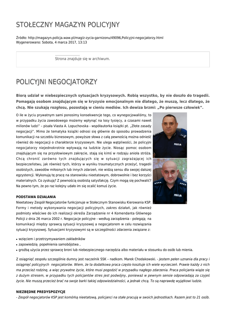 STOŁECZNY MAGAZYN POLICYJNY Źródło: http://magazyn.policja.waw.pl/mag/z-zycia-garnizonu/49096,Policyjni-negocjatorzy.html Wygenerowano: Sobota, 4 marca 2017, 13:13 Strona znajduje się w archiwum. POLICYJNI NEGOCJATORZY Biorą udział w niebezpiecznych sytuacjach kryzysowych. Robią wszystko, by nie doszło do tragedii. Pomagają osobom znajdującym się w kryzysie emocjonalnym nie dlatego, że muszą, lecz dlatego, że chcą. Nie szukają rozgłosu, pozostają w cieniu mediów. Ich dewiza brzmi: „Po pierwsze człowiek”. O ile w życiu prywatnym sami ponosimy konsekwencje tego, co wynegocjowaliśmy, to w przypadku życia zawodowego możemy wpłynąć na losy tysięcy, a czasami nawet milionów ludzi” – pisała Viasta A. Lopuchovska - współautorka książki pt. „Złote zasady negocjacji”. Mimo że tematyka książki odnosi się głównie do sposobu prowadzenia komunikacji na szczeblu biznesowym, powyższe słowa z całą pewnością można odnieść również do negocjacji o charakterze kryzysowym. Nie ulega wątpliwości, że policyjni negocjatorzy niejednokrotnie wpływają na ludzkie życie. Niosąc pomoc osobom znajdującym się na przysłowiowym zakręcie, stają się kimś w rodzaju anioła stróża. Chcą chronić zarówno tych znajdujących się w sytuacji zagrażającej ich bezpieczeństwu, jak również tych, którzy w wyniku traumatycznych przeżyć, tragedii osobistych, zawodów miłosnych lub innych zdarzeń, nie widzą sensu dla swojej dalszej egzystencji. Wykonują tę pracę na stanowisku nieetatowym, dobrowolnie i bez korzyści materialnych. Co zyskują? Z pewnością osobistą satysfakcję. Czym mogą się pochwalić? Na pewno tym, że po raz kolejny udało im się ocalić komuś życie. PODSTAWA DZIAŁANIA Nieetatowy Zespół Negocjatorów funkcjonuje w Stołecznym Stanowisku Kierowania KSP. Formy i metody wykonywania negocjacji policyjnych, zakres działań, jak również podmioty właściwe do ich realizacji określa Zarządzenie nr 4 Komendanta Głównego Policji z dnia 26 marca 2002 r. Negocjacje policyjne - według zarządzenia - polegają na komunikacji między sprawcą sytuacji kryzysowej a negocjatorem w celu rozwiązania sytuacji kryzysowej. Sytuacjami kryzysowymi są w szczególności zdarzenia związane z: ● wzięciem i przetrzymywaniem zakładników ● zapowiedzią popełnienia samobójstwa , ● groźbą użycia przez sprawcę broni lub niebezpiecznego narzędzia albo materiału w stosunku do osób lub mienia. Z osiągnięć zespołu szczególnie dumny jest naczelnik SSK – nadkom. Marek Chodakowski. - Jestem pełen uznania dla pracy i osiągnięć policyjnych negocjatorów. Wiem, że ta dodatkowa praca często kosztuje ich wiele wyrzeczeń. Prawie każdy z nich ma przecież rodzinę, a więc prywatne życie, które musi pogodzić w przypadku nagłego zdarzenia. Praca policjanta wiąże się z dużym stresem, w przypadku tych policjantów stres jest podwójny, ponieważ w pewnym sensie odpowiadają za czyjeś życie. Nie muszą przecież brać na swoje barki takiej odpowiedzialności, a jednak chcą. To są naprawdę wyjątkowi ludzie. NIEZBĘDNE PREDYSPOZYCJE - Zespół negocjatorów KSP jest komórką nieetatową, policjanci na stałe pracują w swoich jednostkach. Razem jest to 21 osób. Mają wyznaczone dyżury. W praktyce ich zadania sprowadzają się do ratowania życia ludzkiego osobom znajdującym się w kryzysie, które w skutek ciężkiej sytuacji życiowej, traumatycznych wydarzeń, zaburzeń psychicznych lub innych przyczyn chcą popełnić samobójstwo. Nasi negocjatorzy działają zawsze wspólnie z etatowym zespołem negocjatorów Biura Operacji Antyterrorystycznych KGP. Do podjęcia negocjacji potrzebny jest zespół co najmniej trzyosobowy. Na miejscu negocjatorzy ustalają, kto podejmuje działania. Specyfika pracy na pozór jest dosyć prosta – jechać na miejsce – podjąć rozmowę i zakończyć ją sukcesem. Negocjator ma doprowadzić rozmową do odstąpienia przez sprawcę sytuacji kryzysowej od zamierzonego celu. Z reguły pracują po cywilnemu, mogą oczywiście pracować w mundurze. Jeśli zachodzi taka potrzeba, mogą być również wyposażeni w kamizelki kuloodporne, hełmy lub inne środki ochrony. O zakończeniu negocjacji lub jej przerwaniu decyduje dowódca zabezpieczenia, nigdy nie dowodzi negocjator. Ważne są predyspozycje. Przede wszystkim powinni cechować się empatią, umiejętnością nawiązywania kontaktu, otwartością, bezstronnością i odpornością na stres. Muszą mieć nie tylko nerwy ze stali, ale wykazać się dużym opanowaniem i spokojem. Istotne jest, aby negocjator był w danym dniu zdolny do podjęcia działania, czuł się dobrze, był w dobrej formie psychicznej i fizycznej. Negocjatorzy, tak jak każdy, mają swoje życiowe problemy, dlatego przed wysłaniem negocjatora na miejsce, pytamy go, czy czuje się na siłach, by podjąć się negocjacji. Trzeba brać również pod uwagę doświadczenie zawodowe policjanta – dodaje koordynator zespołu mł. insp. Sławomir Kornatowski. ODPOWIEDZIALNA PRACA O tym, jak odpowiedzialną pracę wykonują negocjatorzy, najlepiej wiedzą oni sami. Jednak mimo stresu, świadomości, że w danym momencie odpowiada się za czyjeś życie, niosą pomoc ludziom znajdującym się w kryzysie. - Negocjator przystępując do rozmowy ma świadomość, że stoi za nim zespół, na który może liczyć. Pomaga drugiej osobie odnaleźć wewnętrzną harmonię i daje nadzieję – mówi Arek, były negocjator z komendy w Wołominie. – Negocjatorzy mają poczucie obowiązku, niosą bezinteresowną pomoc. Zawsze lubiłem pomagać ludziom, nigdy nie przeszedłem obojętnie obok osoby potrzebującej pomocy – dodaje Artur z Wydziału Wywiadowczo - Patrolowego KSP. - Zanim zostanie się negocjatorem, trzeba przejść szereg testów, badań, specjalne przeszkolenie. Samo ukończenie kursu nie oznacza, że zostanie się negocjatorem. Pierwsza negocjacja