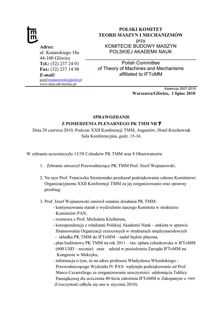 Adres: ul. Konarskiego 18a 44-100 Gliwice Tel.: (32) 237 24 01 Fax: (32) 237 14 98 E-mail: POLSKI KOMITET TEORII MASZYN I MECHANIZMÓW przy KOMITECIE BUDOWY MASZYN POLSKIEJ AKADEMII NAUK _________________________________________ Polish Committee of Theory of Machines and Mechanisms affiliated to IFToMM [email protected] www.tmm.ath.bielsko.pl Kadencja 2007-2010 Warszawa/Gliwice, 1 lipiec 2010 SPRAWOZDANIE Z POSIEDZENIA PLENARNEGO PK TMM NR 7 Dnia 28 czerwca 2010, Podczas XXII Konferencji TMM, Augustów, Hotel Krechowiak Sala Konferencyjna, godz. 15-16. W zebraniu uczestniczyło 13/58 Członków PK TMM oraz 8 Obserwatorów 1. Zebranie otworzył Przewodniczący PK TMM Prof. Józef Wojnarowski. 2. Na ręce Prof. Franciszka Siemieniako przekazał podziękowania całemu Komitetowi Organizacyjnemu XXII Konferencji TMM za jej zorganizowanie oraz sprawny przebieg. 3. Prof. Józef Wojnarowski omówił ostatnie działania PK TMM: - kontynuowanie starań o wydzielenie naszego Komitetu w strukturze Komitetów PAN, - rozmowa z Prof. Michałem Kleiberem, - korespondencja z władzami Polskiej Akademii Nauk – ankieta w sprawie finansowania Organizacji zrzeszonych w strukturach międzynarodowych - składka PK TMM do IFToMM – nadal będzie płacona, - plan budżetowy PK TMM na rok 2011 – tzn. opłata członkowska w IFToMM (600 USD – rocznie) oraz udział w posiedzeniu Zarządu IFToMM na Kongresie w Meksyku, - informacja o tym, że na adres profesora Władysława Włosińskiego Przewodniczącego Wydziału IV PAN wpłynęło podziękowanie od Prof. Marco Cecarreliego za zorganizowanie uroczystości odsłonięcia Tablicy Pamiątkowej dla uczczenia 40-lecia założenia IFToMM w Zakopanym w 1969 (Uroczystość odbyła się ona w styczniu 2010). 4. Dr Stanisław Zawiślak omówił sprawozdanie z poprzedniego posiedzenia PK TMM nr 6 w Politechnice Radomskiej. Sprawozdanie zostanie umieszczone na stronie www PK TMM (www.tmm.ath.bielsko.pl). 5. Nowe LOGO PK TMM. Zaaprobowano nowe logo PK TMM z dopiskiem IFToMM Poland – jak to robią zwyczajowo inne kraje. Logo zostanie rozesłane do wszystkich członków PK TMM. 6. Prof. Franciszek Siemieniako w imieniu Organizatorów podał kilka danych o trwającej konferencji: łącznie przyjęto 63 referaty 97 Autorów (i Współ-Autorów), było 66 Uczestników – referaty opublikowano w trzech czasopismach: - International Journal of Applied Mechanics and Engineering (9 pkt.), (www.ijame.uz.zgora.pl/) - Acta Mechanica et Automatica (6 pkt.) (www.actawm.pb.edu.pl) oraz - Pneumatyka (E-mail: [email protected] )......(? pkt) 7. Sprawa Dydaktyki PK TMM: propozycja opracowania listu od PK TMM do Dziekanów Polskich Uczelni, aby uwzględniano treści z zakresu TMM w programach studiów (odpowiedzialni Prof. F. Siemieniako oraz S. Zawiślak). 8. Prof. Gronowicz – opinie o konferencji: - artykuły publikowane nie w materiałach, ale w czasopismach, - czasopisma punktowane – w rankingach MNiSW, - podać linki do redakcji – co uczyniono powyżej, - zmiana nazwy konferencji: np. Konferencja Teorii Maszyn i Układów Mechatronicznych – TMuM*, - w uzasadnieniu propozycji podkreślił że: rozważano tę zmianę już 2 lata temu na konferencji w Szczyrku, treści wielu referatów dotyczą zagadnień z zakresu mechatroniki, powstały już kierunki studiów „Mechatronika” na kilku Uczelniach w Polsce . 9. Propozycja po krótkiej dyskusji została przyjęta przez aklamację. 10. Kolejne Posiedzenie Plenarne w kadencji 2007-2010 – zaproponowano termin 25 października 2010 (poniedziałek)**, prawdopodobnie w Warszawie – Gospodarz i miejsce zostaną ustalone i rozesłane do wiadomości wszystkich PT Członków i Obserwatorów. 11. Sprawa Organizatora konferencji TMuM 2012. Zgłoszono propozycję: Politechnika Koszalińska, Organizator Prof. Bil, Termin koniec czerwca 2012, przy czym sprawę decyzji przesunięto na ostatnie posiedzenie w październiku, czekając na ewentualne inne propozycje. 12. Sprawa organizacji ŚWIATOWEGO KONGRESU IFToMM w 2010 roku. Należy na Kongres w 2011 w Meksyku przygotować pełną oficjalną propozycję z dokumentami i prezentacją: Oferta powinna zawierać: - termin, - miejsce, - zaplecze konferencyjne (wiele sal/równoległe sesje), - zaplecze hotelowe, - zabezpieczenie / patronat ze strony Władz (np. Rządu PR, Ministerstwa oraz Polskiej Akademii Nauk). - zaplecze logistyczne – lotniska, połączenia kolejowe, autobusowe, drogowe, zapewniane przez organizatorów (np. w Besancon busy na trasie – dworzec kolejowy - centrum kongresowe); Wstępnie zgłoszono ofertę: Gdańsk/Politechnika Gdańska - Prof. Krzysztof Kaliński (jako organizator GAMM2009). Postawiono jednak pytanie czy nie rozważać jednak Zakopanego – jako miejsca założenia IFToMM? Sprawę odłożono do rozstrzygnięcia na kolejnym posiedzeniu w październiku 2010. Przewodniczący PK TMM (-) Prof. Józef Wojnarowski * Sekretarz PK TMM (-) Dr Stanisław Zawiślak Propozycja Sekretarza – aby skrót konferencji był TMuM, zamiast TMiUM. Litera ‘u’ mniejszą czcionką, aby TMM był eksponowany, dla przypomnienia poprzedniego skrótu. ** Termin i miejsce kolejnego Zebrania PK TMM może ulec zmianie. Komunikat zostanie rozesłany z pewnym wyprzedzeniem.