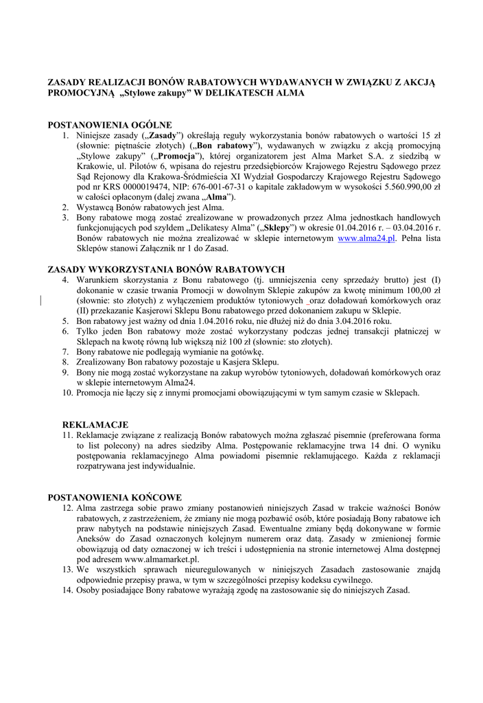 ZASADY REALIZACJI BONÓW RABATOWYCH WYDAWANYCH W ZWIĄZKU Z AKCJĄ PROMOCYJNĄ „Stylowe zakupy” W DELIKATESCH ALMA POSTANOWIENIA OGÓLNE 1. Niniejsze zasady („Zasady”) określają reguły wykorzystania bonów rabatowych o wartości 15 zł (słownie: piętnaście złotych) („Bon rabatowy”), wydawanych w związku z akcją promocyjną „Stylowe zakupy” („Promocja”), której organizatorem jest Alma Market S.A. z siedzibą w Krakowie, ul. Pilotów 6, wpisana do rejestru przedsiębiorców Krajowego Rejestru Sądowego przez Sąd Rejonowy dla Krakowa-Śródmieścia XI Wydział Gospodarczy Krajowego Rejestru Sądowego pod nr KRS 0000019474, NIP: 676-001-67-31 o kapitale zakładowym w wysokości 5.560.990,00 zł w całości opłaconym (dalej zwana „Alma”). 2. Wystawcą Bonów rabatowych jest Alma. 3. Bony rabatowe mogą zostać zrealizowane w prowadzonych przez Alma jednostkach handlowych funkcjonujących pod szyldem „Delikatesy Alma” („Sklepy”) w okresie 01.04.2016 r. – 03.04.2016 r. Bonów rabatowych nie można zrealizować w sklepie internetowym www.alma24.pl. Pełna lista Sklepów stanowi Załącznik nr 1 do Zasad. ZASADY WYKORZYSTANIA BONÓW RABATOWYCH 4. Warunkiem skorzystania z Bonu rabatowego (tj. umniejszenia ceny sprzedaży brutto) jest (I) dokonanie w czasie trwania Promocji w dowolnym Sklepie zakupów za kwotę minimum 100,00 zł (słownie: sto złotych) z wyłączeniem produktów tytoniowych oraz doładowań komórkowych oraz (II) przekazanie Kasjerowi Sklepu Bonu rabatowego przed dokonaniem zakupu w Sklepie. 5. Bon rabatowy jest ważny od dnia 1.04.2016 roku, nie dłużej niż do dnia 3.04.2016 roku. 6. Tylko jeden Bon rabatowy może zostać wykorzystany podczas jednej transakcji płatniczej w Sklepach na kwotę równą lub większą niż 100 zł (słownie: sto złotych). 7. Bony rabatowe nie podlegają wymianie na gotówkę. 8. Zrealizowany Bon rabatowy pozostaje u Kasjera Sklepu. 9. Bony nie mogą zostać wykorzystane na zakup wyrobów tytoniowych, doładowań komórkowych oraz w sklepie internetowym Alma24. 10. Promocja nie łączy się z innymi promocjami obowiązującymi w tym samym czasie w Sklepach. REKLAMACJE 11. Reklamacje związane z realizacją Bonów rabatowych można zgłaszać pisemnie (preferowana forma to list polecony) na adres siedziby Alma. Postępowanie reklamacyjne trwa 14 dni. O wyniku postępowania reklamacyjnego Alma powiadomi pisemnie reklamującego. Każda z reklamacji rozpatrywana jest indywidualnie. POSTANOWIENIA KOŃCOWE 12. Alma zastrzega sobie prawo zmiany postanowień niniejszych Zasad w trakcie ważności Bonów rabatowych, z zastrzeżeniem, że zmiany nie mogą pozbawić osób, które posiadają Bony rabatowe ich praw nabytych na podstawie niniejszych Zasad. Ewentualne zmiany będą dokonywane w formie Aneksów do Zasad oznaczonych kolejnym numerem oraz datą. Zasady w zmienionej formie obowiązują od daty oznaczonej w ich treści i udostępnienia na stronie internetowej Alma dostępnej pod adresem www.almamarket.pl. 13. We wszystkich sprawach nieuregulowanych w niniejszych Zasadach zastosowanie znajdą odpowiednie przepisy prawa, w tym w szczególności przepisy kodeksu cywilnego. 14. Osoby posiadające Bony rabatowe wyrażają zgodę na zastosowanie się do niniejszych Zasad.