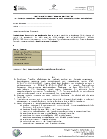 UMOWA UCZESTNICTWA W PROJEKCIE pt. Inkluzja zawodowa - kompleksowe wsparcie osób pozostających bez zatrudnienia numer Umowy ……………….…………………………… z dnia ………………………………………………………….. zawarta pomiędzy Stronami: Instytutem Turystyki w Krakowie Sp. z o. o. z siedzibą w Krakowie 30-614 przy ul. Łężce 23, wpisanym do KRS pod nr 0000160041, NIP 679-000-51-17, REGON 351502209, Reprezentowanym przez Tadeusza Burzyńskiego pełniącego funkcję Prezesa Zarządu, zwanym dalej „Realizatorem Projektu”, a Panią/Panem Imię i nazwisko Uczestniczki/ Uczestnika Projektu zamieszkałą/łym w (pełny adres) o numerze PESEL zwaną/ym dalej Uczestniczką/Uczestnikiem Projektu. §1 1. Realizator Projektu oświadcza, że realizuje projekt pn. Inkluzja zawodowa kompleksowe wsparcie osób pozostających bez zatrudnienia numer WNDRPSL.07.01.03-24-01AB/15 (zwany dalej jako Projekt), na podstawie umowy o dofinansowanie nr RPSL.07.01.03-24-01AB/15-00 w ramach Regionalnego Programu Operacyjnego Województwa Śląskiego na lata 2014-2020, Oś priorytetowa: VII. Regionalny rynek pracy, Działanie: 7.1. Aktywne formy przeciwdziałania bezrobociu, Poddziałanie: 7.1.3. Poprawa zdolności do zatrudnienia osób poszukujących pracy i pozostających bez zatrudnienia. 2. Umowa zostaje zawarta na czas realizacji Projektu, nie dłużej niż do dnia 30.09.2017 r. 3. Przedmiotem umowy jest uczestnictwo Uczestniczki/Uczestnika Projektu w usługach oferowanych w ramach Projektu. Udział w Projekcie jest w 100% bezpłatny. 4. Usługi oferowane w ramach projektu mają następujące formy: a) analiza motywacji i predyspozycji potencjalnych Uczestniczek/Uczestników Projektu – 1-2 godziny/osobę; b) budowa Ścieżki Kariery (IPD) – ok. 7 godzin/osobę; c) mentoring indywidualny – ok. 2 godziny/osobę/miesiąc + wsparcie ad hoc; d) szkolenia komputerowe z certyfikacją – 80 godzin/osobę; e) szkolenia językowe z certyfikacją –120 godzin/osobę; f) szkolenia zawodowe z certyfikacją – ok. 80-120 godzin/osobę; g) staże zawodowe – 3 miesiące/osobę; h) pośrednictwo pracy – ok. 3 godziny/osobę; i) poradnictwo zawodowe – ok. 2 godziny/osobę. Instytut Turystyki w Krakowie Sp. z o. o. ul. Łężce 23, 30-614 Kraków tel. (12) 423 66 90 www.itk.krakow.pl I www.facebook.com/instytut.turystyki.w.krakowie 5. Uczestniczka/Uczestnik Projektu w Regulaminie Projektu. 1. 2. 3. 4. 5. otrzymuje wsparcie na zasadach określonych §2 Postanowienia szczegółowe Wsparcie udzielane przez Realizatora Projektu przyznawane jest na podstawie deklaracji uczestnictwa w Projekcie. Usługi świadczone w ramach Projektu będą realizowane od poniedziałku do piątku, z częstotliwością ok. 5 razy w tygodniu, ok. 8 godzin zegarowych dziennie. W szczególnych przypadkach usługi świadczone w ramach Projektu mogą odbywać się w soboty i niedziele oraz w większym wymiarze godzinowym dziennie. Harmonogram szkoleń i warsztatów jest ustalany przez Realizatora Projektu i zostanie przekazany Uczestniczkom/Uczestnikom Projektu najpóźniej na 1 dzień przed zajęciami. W harmonogramie można dokonać zmian po ich uzgodnieniu z grupą, prowadzącymi szkolenie i Realizatorem Projektu. Uczestniczka/Uczestnik Projektu potwierdza swoją obecność na zajęciach własnoręcznym podpisem na liście obecności lub karcie doradczej. Uczestniczka/Uczestnik Projektu jest zobowiązany do uczestnictwa w min. 80% zajęć, aby spełnić wymóg ukończenia szkolenia i 100% zajęć, aby spełnić wymóg ukończenia doradztwa. Niespełnienie tego wymogu może skutkować skreśleniem z listy Uczestniczek/Uczestników Projektu oraz zwrotem środków przeznaczonych na wsparcie Uczestniczki/Uczestnika Projektu. §3 Obowiązki Uczestniczki/Uczestnika Projektu 1. Uczestniczka/Uczestnik Projektu oświadcza, że spełnia kryteria kwalifikowalności, zgodnie z formularzem zgłoszeniowym do Projektu, upoważniające do udziału w Projekcie oraz zobowiązuje się do uczestnictwa w zajęciach w miejscu i terminie potwierdzonym przez Realizatora Projektu. 2. Uczestniczka/Uczestnik Projektu zobowiązuje się do potwierdzenia własnoręcznym podpisem odbioru materiałów szkoleniowych oraz korzystania z cateringu podczas trwania kursu. 3. Uczestniczka/Uczestnik Projektu zobowiązany jest do: a) uczestnictwa w zajęciach, stażu i doradztwie, w tym na spotkaniu z doradcą zawodowym i psychologiem na etapie rekrutacji, oraz potwierdzania swojego uczestnictwa podpisem na liście obecności lub w inny sposób określony przez Realizatora Projektu, b) ukończenia szkoleń (frekwencja min. 80% na każdym rodzaju szkoleń i 100% w doradztwie) oraz stażu, c) każdorazowego uprzedzenia Realizatora Projektu o braku możliwości uczestnictwa w zajęciach z powodu choroby lub z innych przyczyn losowych, d) pisemnego odbioru materiałów szkoleniowych i cateringu, e) zgłoszenia się i podejścia do testów, egzaminów, badań lekarskich, f) przestrzegania Regulaminu projektu, g) wypełniania ankiet ewaluacyjnych, w tym także ankiet na potrzeby sprawozdawczości EFS również po zakończeniu kursów i Projektu, zgodnie z wymogami EFS, h) przestrzegania zasad porządkowych obowiązujących na terenie Biura Projektu, sali szkoleniowej, w miejscu odbywania stażu oraz zasad BHP, w szczególności: utrzymywania porządku i czystości w biurze projektu, salach szkoleniowych podczas trwania zajęć, Instytut Turystyki w Krakowie Sp. z o. o. ul. Łężce 23, 30-614 Kraków tel. (12) 423 66 90 www.itk.krakow.pl I www.facebook.com/instytut.turystyki.w.krakowie 4. 5. 6. 7. 8. niedopuszczenia do sytuacji uszkodzenia lub zniszczenia sprzętu komputerowego, wyposażenia Biura Projektu i sali szkoleniowej w trakcie trwania kursu, przestrzegania zasady, że przy sprzęcie komputerowym nie wolno pić i jeść. i) powiadomienia Realizatora Projektu o jakichkolwiek zmianach dotyczących jego osoby (m. in. zmiana adresu za