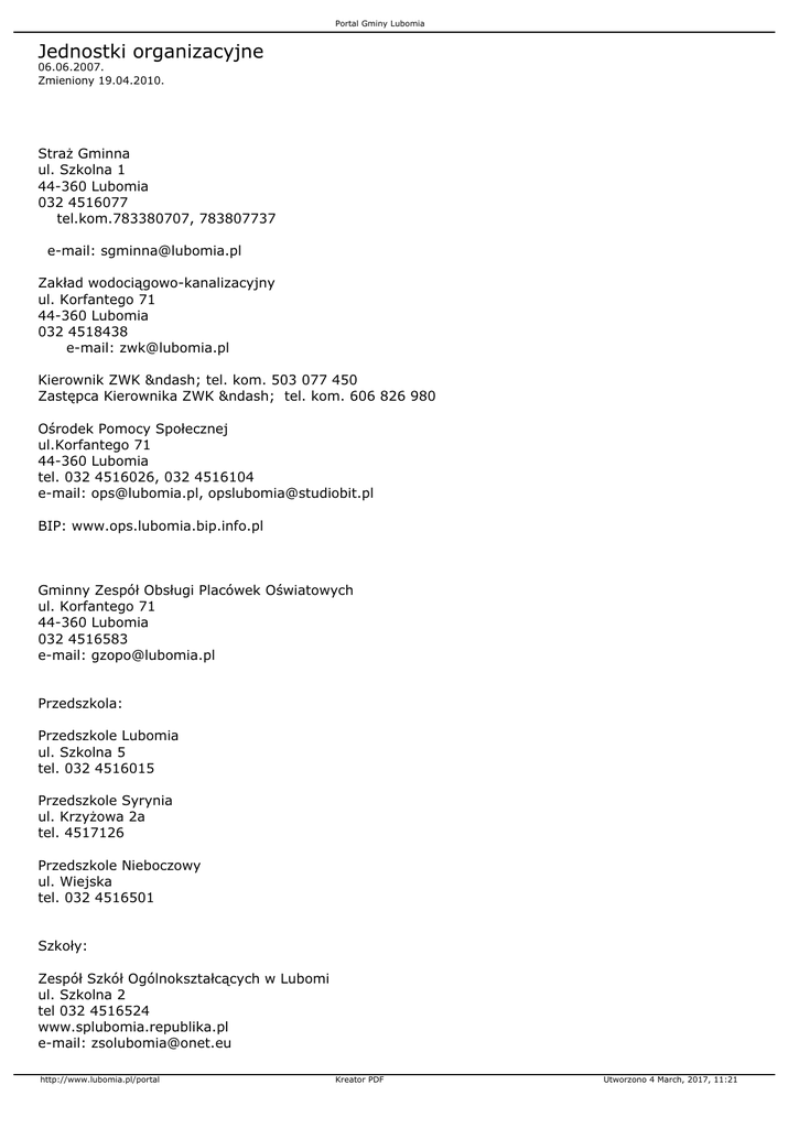 Portal Gminy Lubomia Jednostki organizacyjne 06.06.2007. Zmieniony 19.04.2010. Straż Gminna ul. Szkolna 1 44-360 Lubomia 032 4516077 tel.kom.783380707, 783807737 e-mail: [email protected] Zakład wodociągowo-kanalizacyjny ul. Korfantego 71 44-360 Lubomia 032 4518438 e-mail: [email protected] Kierownik ZWK – tel. kom. 503 077 450 Zastępca Kierownika ZWK – tel. kom. 606 826 980 Ośrodek Pomocy Społecznej ul.Korfantego 71 44-360 Lubomia tel. 032 4516026, 032 4516104 e-mail: [email protected], [email protected] BIP: www.ops.lubomia.bip.info.pl Gminny Zespół Obsługi Placówek Oświatowych ul. Korfantego 71 44-360 Lubomia 032 4516583 e-mail: [email protected] Przedszkola: Przedszkole Lubomia ul. Szkolna 5 tel. 032 4516015 Przedszkole Syrynia ul. Krzyżowa 2a tel. 4517126 Przedszkole Nieboczowy ul. Wiejska tel. 032 4516501 Szkoły: Zespół Szkół Ogólnokształcących w Lubomi ul. Szkolna 2 tel 032 4516524 www.splubomia.republika.pl e-mail: [email protected] http://www.lubomia.pl/portal Kreator PDF Utworzono 4 March, 2017, 11:21 Portal Gminy Lubomia Zespół Szkół Ogólnokształcących w Syryni ul. Powstańców Śląskich 26 tel. 032 4517353 www.zso.syrynia.pl e-mail: [email protected] Gminna Biblioteka Publiczna w Lubomi ul. Mickiewicza 4 tel. 032 4516155 Parafie: Parafia p.w. Św. Marii Magdaleny w Lubomi ul. Pogrzebieńska 2 tel 032 4516211 Parafia p.w. Św. Antoniego Padewskiego w Syryni ul. Powstańców Śląskich 46 tel. 032 4517124 Parafia p.w. Św. Józefa Robotnika w Nieboczowach ul. Wiejska 68 tel. 032 4516641 Parafia p.w. M.B. Nieustającej Pomocy w Bukowie ul. Główna 24 tel. 032 4544010 Banki: Bank Spółdzielczy w Lubomi ul. Szkolna 1 tel. 032 4516010 Bank Spółdzielczy w Syryni ul. 3-go Maja 30 tel. 032 4517594 Ośrodki Zdrowia: Ośrodek Zdrowia w Lubomi ul. Parkowa 48 tel. 032 4516566 Ośrodek Zdrowia w Syryni ul. Krzyżowa 9 tel. 032 4517129 Apteki: Lubomia ul. Korfantego 34 tel. 032 4516656 Syrynia ul. Krzyżowa 9 tel 032 4517783 http://www.lubomia.pl/portal Kreator PDF Utworzono 4 March, 2017, 11:21 Portal Gminy Lubomia Poczta Lubomia ul. Szkolna 1 tel. 032 4516098 Gminny Ośrodek Kultury w Lubomi ul.Mickiewicza 4 tel. 032 4516094 Wiejski Dom Kultury w Syryni ul. 3-go Maja 65 tel. 032 4517221 http://www.lubomia.pl/portal Kreator PDF Utworzono 4 March, 2017, 11:21