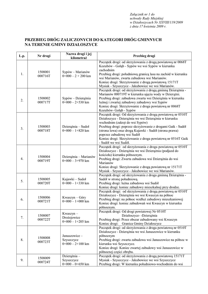 Załącznik nr 1 do uchwały Rady Miejskiej w Działoszycach Nr XXVIII/119/2009 z dnia 17 kwietnia 2009 r. PRZEBIEG DRÓG ZALICZONYCH DO KATEGORI DRÓG GMINNYCH NA TERENIE GMINY DZIAŁOSZYCE L.p. Nr drogi Nazwa drogi i jej kilometraż 1. 1508001 000716T Sypów – Marianów 0+000 – 2 + 200 km 2. 1508002 000717T Sypów – Dzierążnia 0+000 – 2+530 km 3. 1508003 000718T Dzierążnia – Sudoł 0+000 – 1+820 km 4. 1508004 000719T Dzierążnia – Marianów 0+000 – 3+970 km 5. 1508005 000720T Kujawki – Sudoł 0+000 – 1+330 km 6. 1508006 000721T Kwaszyn – Góry 0+000 – 1+000 km 7. 1508007 000722T Kwaszyn – Drożejowice 0+000 – 1+205 km 8. 1508008 000723T Januszowice – Szyszczyce 0+000 – 2+100 km 9. 1508009 000724T Dzierążnia – Szyszczyce 0+000 – 0+650 km Przebieg drogi Początek drogi: od skrzyżowania z drogą powiatową nr 0068T Kozubów - Gołąb - Sypów we wsi Sypów w kierunku zachodnim Przebieg drogi: południową granicą lasu na zachód w kierunku wsi Marianów, zwarta zabudowa wsi Marianów. Koniec drogi: Skrzyżowanie z drogą powiatową 15171T Mysiak - Szyszczyce - Jakubowice we wsi Marianów. Początek drogi: od skrzyżowania z drogą gminną Dzierążnia Marianów 000719T w kierunku ujęcia wody w Dzierążni. Przebieg drogi: zabudowa zwarta wsi Dzierążnia w kierunku luźnej i zwartej zabudowy zabudowy wsi Sypów Koniec drogi: Skrzyżowanie z droga powiatową nr 0068T Kozubów- Gołąb - Sypów Początek drogi: Od skrzyżowania z drogą powiatową nr 0510T Działoszyce - Dzierążnia we wsi Dzierążnia w kierunku wschodnim (zakręt do wsi Sypów) Przebieg drogi: poprzez skrzyżowanie z drogami Gaik - Sudół (strona lewa) oraz drogą Kujawki - Sudół (strona prawa) poprzez zabudowę wsi Sudół Koniec drogi: Skrzyżowanie z droga powiatową nr 0516T Gaik - Sudół we wsi Sudół. Początek drogi: od skrzyżowania z droga powiatową nr 0510T Działoszyce - Dzierążnia we wsi Dzierążnia (podjazd do kościoła) kierunku północnym. Przebieg drogi: Zwarta zabudowa wsi Dzierążnia do wsi Marianów Koniec drogi: Skrzyżowanie z drogą powiatową nr 15171T Mysiak - Szyszczyce - Jakubowice we wsi Marianów. Początek drogi: od skrzyżowania z droga gminną Dzierążnia Sudół w stronę południową. Przebieg drogi: luźna zabudowa wsi Sudół Koniec drogi: koniec zabudowy mieszkalnej przy drodze. Początek drogi: od skrzyżowania z drogą powiatową nr 0510T Działoszyce - Dzierążnia we wsi Kwaszyn na północ Przebieg drogi: na północ wzdłuż zabudowy mieszkaniowej Koniec drogi: koniec zabudowań wsi Kwaszyn w kierunku północnym. Początek drogi: Od drogi powiatowej Nr 0510T Działoszyce- -Dzierążnia Przebieg drogi: Przez obszar zabudowany wsi Kwaszyn Koniec drogi: Granica Gminy Działoszyce Początek drogi: od skrzyżowania z droga powiatową nr 0510T Działoszyce - Dzierążnia we wsi Januszowice w kierunku północnym Przebieg drogi: zwarta zabudowa wsi Januszowice na północ w kierunku wsi Szyszczyce. Koniec drogi: Koniec zwartej zabudowy wsi Januszowice w północnej części obrębu. Początek drogi: od skrzyżowania z drogą powiatową 15171T Mysiak - Szyszczyce - Jakubowice we wsi Szyszczyce Przebieg drogi: W kierunku południowo-wschodnim do wsi Załącznik nr 1 do uchwały Rady Miejskiej w Działoszycach Nr XXVIII/119/2009 z dnia 17 kwietnia 2009 r. 10. 1508010 000725T Jakubowice – Jastrzębniki 0+000 – 0+840 km 11. 1508011 000726T Ksawerów – Jastrzębniki 0+000 – 2+400 km 12. 1508012 000727T Ksawerów – Opatkowice 0+000 – 0+250 km 13. 1508013 000728T Ksawerów - Dębowiec – Szyszczyce 0+000 – 1+200 km `14. 1508014 000729T Bronów – Wolica 0+000 – 1+670 km 15. 1508015 000730T Dziewięczyce – Przecławka 0+000 – 1+540 km 16. 1508016 000731T Przecławka - Zagórze – Lipówka 0+000 – 2+260 km 17. 1508017 000732T Lipówka - Świerczyna - Nowiny – Teodorów 0+000 – 2+080 km 18. 1508018 000733T Lipówka - Świerczyna - Stępocice – Teodorów 0+000 – 4+365 km 19 20. 1508019 000734T 1508020 Stępocice – Wyrwa 0+000 – 0+200 km Świerczyna - Żółta Dzierążnia. Koniec drogi: za końcem zwartej zabudowy wsi Szyszczyce 0+650 km Początek drogi: od skrzyżowania z drogą gminną Ksawerów Jastrzębniki w kierunku południowo - wschodnim Przebieg drogi: kierunek południowo wschodni - w kierunku wsi Jakubowice wzdłuż zabudowań mieszkalnych Koniec drogi: Koniec zabudowań mieszkalnych. Początek drogi: Od skrzyżowania z drogą powiatową nr 0512T Dziewięczyce - Działoszyce we wsi Ksawerów w kierunku wschodnim Przebieg drogi: przez grunty wsi Jakubowice do zwartej zabudowy wsi Jastrzębniki Koniec drogi: Północna granica zabudowy wsi Jastrzębniki. Początek drogi: od skrzyżowania z drogą powiatową nr 0512T Dziewięczyce - Działoszyce w kierunku zachodnim Przebieg drogi: od zwartej zabudowy wsi Ksawerów w kierunku zachodnim. Koniec drogi: Koniec zwartej obudowy wsi Ksawerów w jej zachodniej części. Początek drogi: od skrzyżowania z droga powiatową nr 0512T Dziewięczyce - Działoszyce w kierunku wschodnim. Przebieg drogi: przez zabudowania wsi Ksawerów, Dębowiec w kierunku wsi Szyszczyce. Koniec drogi: za zabudowaniami wsi Dębowiec w kierunku wsi Szyszczyce. Początek drogi: od skrzyżowania z drogą powiatową nr 0512T Dziewięczyce- Działoszyce w kierunku zachodnim Przebieg drogi: Wieś Bronów i Wolica (koło cmentarza parafialnego) Koniec drogi: Skrzyżowanie z droga powiatową nr 0511T Lipówka - Wolica - Szyszczyce. Początek drogi: od skrzyżowania z droga powiatową nr 0511T Lipówka - Wolica - Szyszczyce w kierunku północnym Przebieg drogi: luźna zabudowa mieszkaniowa wsi Dziewięczyce Koniec drogi: Skrzyżowanie z droga powiatową nr 0180T Zagajów - Góry - Wolica (granica Gminy Działoszyce). Początek drogi: Granica Gminy (wieś Przecławka) Przebieg drogi: Teren zabudowany wsi Zagórze Koniec drogi: Wschodnia strona drogi wojewódzkiej Nr 768 Jędrzejów - 