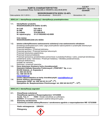 KARTA CHARAKTERYSTYKI Na podstawie Rozp. Komisji (UE) nr 453/2010 z dnia 20.05.2010r G.Z.N.F. „FOSFORY” Sp. z o.o. GDAŃSK WODOROSIARCZYN SODU 32-40% Data wydania: 30.11.2010 r. Data aktualizacji: 29.05.2015 Strona/stron: 1/9 SEKCJA 1: Identyfikacja substancji i identyfikacja przedsiębiorstwa 1.1. Identyfikator produktu WODOROSIARCZYN SODU 32-40% Nr CAS Nr WE Nr indeks Nr rejestracyjny: 7631-90-5 231-548-0 016-064-00-8 01-2119524563-42-0009 Inne nazwy: WODOROSIARCZAN (IV) SODU 1.2. 1.3. 1.4. Istotne zidentyfikowane zastosowania substancji oraz zastosowania odradzane Produkcja wodorosiarczynu sodu i jego przemysłowe wykorzystanie w przemyśle chemicznym Przemysł fotograficzny, Przemysł tekstylny / Przemysł skórzany, Przemysł gumowy / Przemysł tworzyw sztucznych, Przemysł celulozowo-papierniczy, Przemysł drzewny/meblarski, Przemysł spoŜywczy (przetwórstwo pomocnicze w produkcji fruktozy i cukru, przemysł skrobiowy), Uzdatnianie wody / Górnictwo / Przemysł metalowy / Obróbka powierzchniowa, Przemysł włókienniczy, Dodatki do cementu, Rolnictwo i przemysł nawozów, Dane dotyczące dostawcy karty charakterystyki Gdańskie Zakłady Nawozów Fosforowych „FOSFORY” Sp. z o.o. 80-550 Gdańsk, ul. Kujawska 2 tel. 058 343 82 93 fax. 058 303 85 55 www.fosfory.pl osoba odpowiedzialna za kartę charakterystyki: [email protected] Numer telefonu alarmowego 00 00 Dyspozytor GZNF: tel. 058 343 83 33 (14 - 7 ) 00 00 Specjalista ds. Bezpieczeństwa Chemicznego: tel. 058 343 84 07(7 – 15 ) SEKCJA 2: Identyfikacja zagroŜeń 2.1. 2.2. Klasyfikacja substancji Klasyfikacja zgodnie z Rozporządzeniem 1272/2008 Acute. Tox. 4 H302 - Działa szkodliwie po połknięciu. EUH031- W kontakcie z kwasami uwalnia toksyczne gazy. Elementy oznakowania Substancja została zaklasyfikowana i oznakowana zgodnie z rozporządzeniem WE 1272/2008 Hasło ostrzegawcze Piktogramy UWAGA KARTA CHARAKTERYSTYKI Na podstawie Rozp. Komisji (UE) nr 453/2010 z dnia 20.05.2010r G.Z.N.F. „FOSFORY” Sp. z o.o. GDAŃSK WODOROSIARCZYN SODU 32-40% Data wydania: 30.11.2010 r. Data aktualizacji: 29.05.2015 Strona/stron: 2/9 Zwrot wskazujący rodzaj zagroŜenia Klasyfikacja zgodnie z Rozporządzeniem 1272/2008 2.3. H302 - Działa szkodliwie po połknięciu. EUH031- W kontakcie z kwasami uwalnia toksyczne gazy. Zwroty wskazujące środki ostroŜności Zapobieganie P264 Dokładnie umyć ręce po uŜyciu. P270 Nie jeść, nie pić i nie palić podczas uŜywania produktu. Reagowanie P301 + P312 W PRZYPADKU POŁKNIĘCIA: W przypadku złego samopoczucia skontaktować się z OŚRODKIEM ZATRUĆ lub lekarzem. P305+P351+P338 W PRZYPADKU DOSTANIA SIĘ DO OCZU: OstroŜnie płukać wodą przez kilka minut. Wyjąć soczewki kontaktowe, jeŜeli są i moŜna je łatwo usunąć. Nadal płukać. P330 Wypłukać usta. Inne zagroŜenia Brak danych. SEKCJA 3: Skład/informacja o składnikach 3.1. Substancje Nazwa substancji wodorosiarczan(IV) sodu Wzór chemiczny: Masa cząsteczkowa: Wzór strukturalny: Identyfikator Nr CAS 7631-90-5 Nr WE 231-548-0 Nr indeks. 016-064-00-8 % wag 32-40 H2O3S.Na + H2O 104.0609 Wymienione składniki nie posiadają w chwili obecnej numeru rejestracyjnego, poniewaŜ podlegają przepisom okresu przejściowego zgodnie z rozporządzeniem REACH. SEKCJA 4: Środki pierwszej pomocy 4.1. Opis środków pierwszej pomocy Następstwa wdychania: • Wyprowadzić poszkodowaną osobę na świeŜe powietrze. • Przy długotrwałym kaszlu zapewnić pomoc lekarską. Następstwa połknięcia: • Przepłukać usta wodą. Podać do wypicia 2 - 3 szklanki wody. • Sprowokować wymioty. • Zapewnić pomoc lekarską. KARTA CHARAKTERYSTYKI Na podstawie Rozp. Komisji (UE) nr 453/2010 z dnia 20.05.2010r G.Z.N.F. „FOSFORY” Sp. z o.o. GDAŃSK WODOROSIARCZYN SODU 32-40% Data wydania: 30.11.2010 r. Data aktualizacji: 29.05.2015 Strona/stron: 3/9 Kontakt z oczami: • Usunąć szkła kontaktowe. • Przemyć zanieczyszczone oczy większą ilością letniej wody przez 15-20 minut, przy wywiniętych powiekach. • Skontaktować się z okulistą. Kontakt ze skórą: • Zdjąć zanieczyszczone ubranie i buty. • Oczyścić mechanicznie zanieczyszczoną skórę, przemyć duŜą ilością wody a następnie wodą z łagodnym mydłem. • W przypadku, gdy wystąpi podraŜnienie skóry, które nie przemija, skonsultować się z lekarzem dermatologiem 4.2. NajwaŜniejsze ostre i opóźnione objawy oraz skutki naraŜenia Nie są znane. 4.3. Wskazania dotyczące wszelkiej natychmiastowej pomocy lekarskiej i szczególnego postępowania z poszkodowanym W miejscu pracy powinny być dostępne środki umoŜliwiające natychmiastową pomoc. SEKCJA 5: Postępowanie w przypadku poŜaru 5.1. Środki gaśnicze Odpowiednie środki gaśnicze do gaszenia poŜarów w sąsiedztwie: rozproszona woda, ditlenek węgla CO2, proszki gaśnicze, piana gaśnicza. Niewłaściwe środki gaśnicze: Nie stosować zwartych strumieni wody na powierzchnię palącego się obiektu. 5.2. Szczególne zagroŜenia związane z substancją Produkty spalania: Rozkład termiczny moŜe prowadzić do uwalniania draŜniących gazów i par zawierających ditlenek siarki. ZagroŜenia wybuchowe: Brak. 5.3. Informacje dla straŜy poŜarnej Substancja niepalna. Stosować standardowe metody gaszenia poŜarów chemicznych. Pojemniki naraŜone na działanie wysokiej temperatury chłodzić wodą i w miarę moŜliwości usunąć z zagroŜonego obszaru. Opary produktu strącać rozproszonymi strumieniami wody. Sprzęt ochronny straŜaków: Ubrania odporne na działanie wysokich temperatur. NiezaleŜne aparaty izolujące drogi oddechowe. SEKCJA 6: Postępowanie w przypadku niezamierzonego uwolnienia do środowiska 6.1. Indywidualne środki ostroŜności, wyposaŜenie ochronne i procedury w sytuacjach awaryjnych Zapewnić właściwą wentylację. Obowiązują zasady dobrej praktyki przemysłowej. Osoby zaangaŜowane w akcję awaryjną powinny posiadać: • ubrania ochronne ze zwartej tkaniny, • 