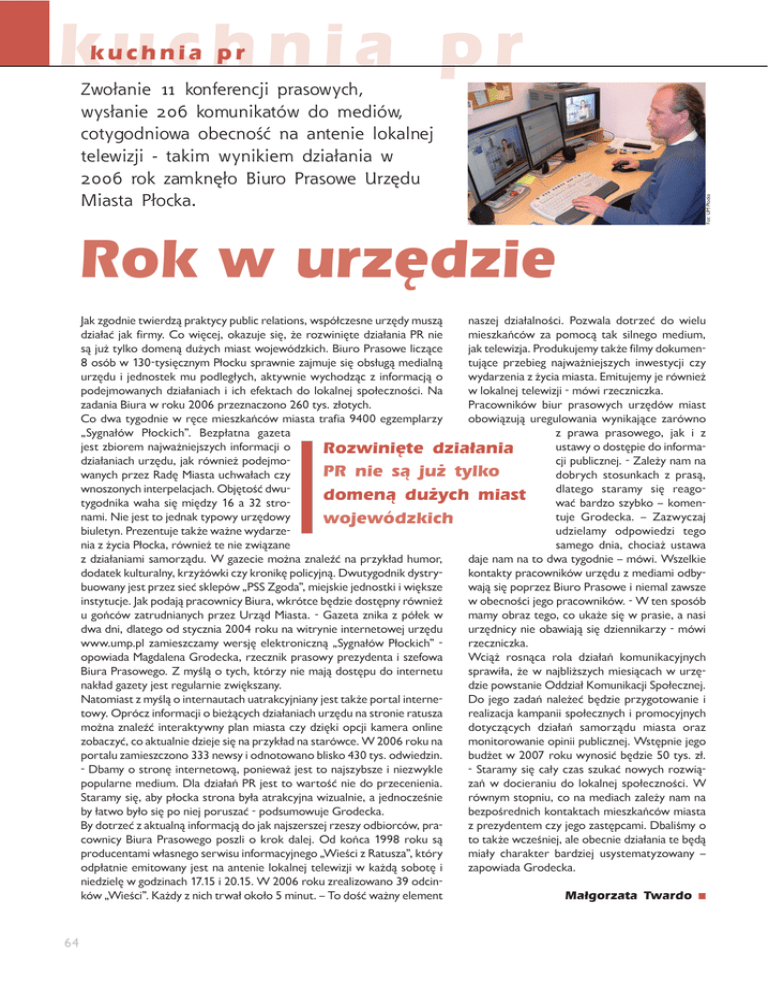 kuchnia pr Zwołanie 11 konferencji prasowych, wysłanie 206 komunikatów do mediów, cotygodniowa obecność na antenie lokalnej telewizji ‑ takim wynikiem działania w 2006 rok zamknęło Biuro Prasowe Urzędu Miasta Płocka. Fot: UM Płocka kuchnia pr Rok w urzędzie Jak zgodnie twierdzą praktycy public relations, współczesne urzędy muszą naszej działalności. Pozwala dotrzeć do wielu działać jak firmy. Co więcej, okazuje się, że rozwinięte działania PR nie mieszkańców za pomocą tak silnego medium, są już tylko domeną dużych miast wojewódzkich. Biuro Prasowe liczące jak telewizja. Produkujemy także filmy dokumen8 osób w 130-tysięcznym Płocku sprawnie zajmuje się obsługą medialną tujące przebieg najważniejszych inwestycji czy urzędu i jednostek mu podległych, aktywnie wychodząc z informacją o wydarzenia z życia miasta. Emitujemy je również w lokalnej telewizji ‑ mówi rzeczniczka. podejmowanych działaniach i ich efektach do lokalnej społeczności. Na zadania Biura w roku 2006 przeznaczono 260 tys. złotych. Pracowników biur prasowych urzędów miast Co dwa tygodnie w ręce mieszkańców miasta trafia 9400 egzemplarzy obowiązują uregulowania wynikające zarówno „Sygnałów Płockich”. Bezpłatna gazeta z prawa prasowego, jak i z jest zbiorem najważniejszych informacji o ustawy o dostępie do informaRozwinięte działania cji publicznej. ‑ Zależy nam na działaniach urzędu, jak również podejmoPR nie są już tylko wanych przez Radę Miasta uchwałach czy dobrych stosunkach z prasą, wnoszonych interpelacjach. Objętość dwudlatego staramy się reagodomeną dużych miast tygodnika waha się między 16 a 32 strować bardzo szybko – komennami. Nie jest to jednak typowy urzędowy tuje Grodecka. – Zazwyczaj wojewódzkich biuletyn. Prezentuje także ważne wydarzeudzielamy odpowiedzi tego nia z życia Płocka, również te nie związane samego dnia, chociaż ustawa z działaniami samorządu. W gazecie można znaleźć na przykład humor, daje nam na to dwa tygodnie – mówi. Wszelkie dodatek kulturalny, krzyżówki czy kronikę policyjną. Dwutygodnik dystrykontakty pracowników urzędu z mediami odbybuowany jest przez sieć sklepów „PSS Zgoda”, miejskie jednostki i większe wają się poprzez Biuro Prasowe i niemal zawsze w obecności jego pracowników. ‑ W ten sposób instytucje. Jak podają pracownicy Biura, wkrótce będzie dostępny również u gońców zatrudnianych przez Urząd Miasta. ‑ Gazeta znika z półek w mamy obraz tego, co ukaże się w prasie, a nasi urzędnicy nie obawiają się dziennikarzy ‑ mówi dwa dni, dlatego od stycznia 2004 roku na witrynie internetowej urzędu www.ump.pl zamieszczamy wersję elektroniczną „Sygnałów Płockich” ‑ rzeczniczka. opowiada Magdalena Grodecka, rzecznik prasowy prezydenta i szefowa Wciąż rosnąca rola działań komunikacyjnych Biura Prasowego. Z myślą o tych, którzy nie mają dostępu do internetu sprawiła, że w najbliższych miesiącach w urzęnakład gazety jest regularnie zwiększany. dzie powstanie Oddział Komunikacji Społecznej. Natomiast z myślą o internautach uatrakcyjniany jest także portal interneDo jego zadań należeć będzie przygotowanie i towy. Oprócz informacji o bieżących działaniach urzędu na stronie ratusza realizacja kampanii społecznych i promocyjnych można znaleźć interaktywny plan miasta czy dzięki opcji kamera online dotyczących działań samorządu miasta oraz zobaczyć, co aktualnie dzieje się na przykład na starówce. W 2006 roku na monitorowanie opinii publicznej. Wstępnie jego portalu zamieszczono 333 newsy i odnotowano blisko 430 tys. odwiedzin. budżet w 2007 roku wynosić będzie 50 tys. zł. ‑ Dbamy o stronę internetową, ponieważ jest to najszybsze i niezwykle ‑ Staramy się cały czas szukać nowych rozwiąpopularne medium. Dla działań PR jest to wartość nie do przecenienia. zań w docieraniu do lokalnej społeczności. W Staramy się, aby płocka strona była atrakcyjna wizualnie, a jednocześnie równym stopniu, co na mediach zależy nam na by łatwo było się po niej poruszać ‑ podsumowuje Grodecka. bezpośrednich kontaktach mieszkańców miasta By dotrzeć z aktualną informacją do jak najszerszej rzeszy odbiorców, praz prezydentem czy jego zastępcami. Dbaliśmy o cownicy Biura Prasowego poszli o krok dalej. Od końca 1998 roku są to także wcześniej, ale obecnie działania te będą producentami własnego serwisu informacyjnego „Wieści z Ratusza”, który miały charakter bardziej usystematyzowany – odpłatnie emitowany jest na antenie lokalnej telewizji w każdą sobotę i zapowiada Grodecka. niedzielę w godzinach 17.15 i 20.15. W 2006 roku zrealizowano 39 odcinków „Wieści”. Każdy z nich trwał około 5 minut. – To dość ważny element Małgorzata Twardo 64