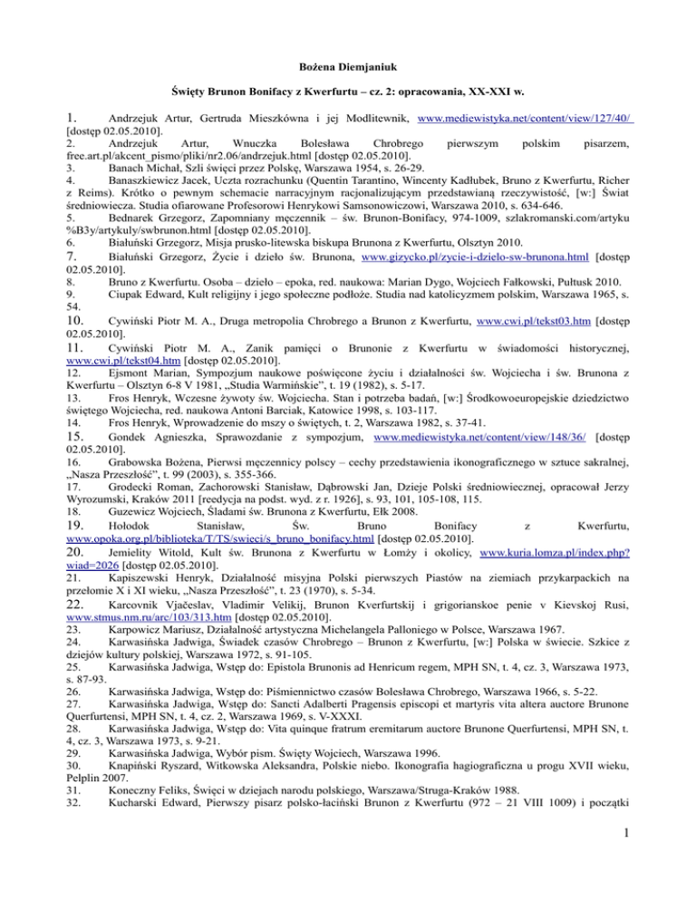 Bożena Diemjaniuk Święty Brunon Bonifacy z Kwerfurtu – cz. 2: opracowania, XX-XXI w. 1. Andrzejuk Artur, Gertruda Mieszkówna i jej Modlitewnik, www.mediewistyka.net/content/view/127/40/ [dostęp 02.05.2010]. 2. Andrzejuk Artur, Wnuczka Bolesława Chrobrego pierwszym polskim pisarzem, free.art.pl/akcent_pismo/pliki/nr2.06/andrzejuk.html [dostęp 02.05.2010]. 3. Banach Michał, Szli święci przez Polskę, Warszawa 1954, s. 26-29. 4. Banaszkiewicz Jacek, Uczta rozrachunku (Quentin Tarantino, Wincenty Kadłubek, Bruno z Kwerfurtu, Richer z Reims). Krótko o pewnym schemacie narracyjnym racjonalizującym przedstawianą rzeczywistość, [w:] Świat średniowiecza. Studia ofiarowane Profesorowi Henrykowi Samsonowiczowi, Warszawa 2010, s. 634-646. 5. Bednarek Grzegorz, Zapomniany męczennik – św. Brunon-Bonifacy, 974-1009, szlakromanski.com/artyku %B3y/artykuly/swbrunon.html [dostęp 02.05.2010]. 6. Białuński Grzegorz, Misja prusko-litewska biskupa Brunona z Kwerfurtu, Olsztyn 2010. 7. Białuński Grzegorz, Życie i dzieło św. Brunona, www.gizycko.pl/zycie-i-dzielo-sw-brunona.html [dostęp 02.05.2010]. 8. Bruno z Kwerfurtu. Osoba – dzieło – epoka, red. naukowa: Marian Dygo, Wojciech Fałkowski, Pułtusk 2010. 9. Ciupak Edward, Kult religijny i jego społeczne podłoże. Studia nad katolicyzmem polskim, Warszawa 1965, s. 54. 10. Cywiński Piotr M. A., Druga metropolia Chrobrego a Brunon z Kwerfurtu, www.cwi.pl/tekst03.htm [dostęp 02.05.2010]. 11. Cywiński Piotr M. A., Zanik pamięci o Brunonie z Kwerfurtu w świadomości historycznej, www.cwi.pl/tekst04.htm [dostęp 02.05.2010]. 12. Ejsmont Marian, Sympozjum naukowe poświęcone życiu i działalności św. Wojciecha i św. Brunona z Kwerfurtu – Olsztyn 6-8 V 1981, „Studia Warmińskie”, t. 19 (1982), s. 5-17. 13. Fros Henryk, Wczesne żywoty św. Wojciecha. Stan i potrzeba badań, [w:] Środkowoeuropejskie dziedzictwo świętego Wojciecha, red. naukowa Antoni Barciak, Katowice 1998, s. 103-117. 14. Fros Henryk, Wprowadzenie do mszy o świętych, t. 2, Warszawa 1982, s. 37-41. 15. Gondek Agnieszka, Sprawozdanie z sympozjum, www.mediewistyka.net/content/view/148/36/ [dostęp 02.05.2010]. 16. Grabowska Bożena, Pierwsi męczennicy polscy – cechy przedstawienia ikonograficznego w sztuce sakralnej, „Nasza Przeszłość”, t. 99 (2003), s. 355-366. 17. Grodecki Roman, Zachorowski Stanisław, Dąbrowski Jan, Dzieje Polski średniowiecznej, opracował Jerzy Wyrozumski, Kraków 2011 [reedycja na podst. wyd. z r. 1926], s. 93, 101, 105-108, 115. 18. Guzewicz Wojciech, Śladami św. Brunona z Kwerfurtu, Ełk 2008. 19. Hołodok Stanisław, Św. Bruno Bonifacy z Kwerfurtu, www.opoka.org.pl/biblioteka/T/TS/swieci/s_bruno_bonifacy.html [dostęp 02.05.2010]. 20. Jemielity Witold, Kult św. Brunona z Kwerfurtu w Łomży i okolicy, www.kuria.lomza.pl/index.php? wiad=2026 [dostęp 02.05.2010]. 21. Kapiszewski Henryk, Działalność misyjna Polski pierwszych Piastów na ziemiach przykarpackich na przełomie X i XI wieku, „Nasza Przeszłość”, t. 23 (1970), s. 5-34. 22. Karcovnik Vjačeslav, Vladimir Velikij, Brunon Kverfurtskij i grigorianskoe penie v Kievskoj Rusi, www.stmus.nm.ru/arc/103/313.htm [dostęp 02.05.2010]. 23. Karpowicz Mariusz, Działalność artystyczna Michelangela Palloniego w Polsce, Warszawa 1967. 24. Karwasińska Jadwiga, Świadek czasów Chrobrego – Brunon z Kwerfurtu, [w:] Polska w świecie. Szkice z dziejów kultury polskiej, Warszawa 1972, s. 91-105. 25. Karwasińska Jadwiga, Wstęp do: Epistola Brunonis ad Henricum regem, MPH SN, t. 4, cz. 3, Warszawa 1973, s. 87-93. 26. Karwasińska Jadwiga, Wstęp do: Piśmiennictwo czasów Bolesława Chrobrego, Warszawa 1966, s. 5-22. 27. Karwasińska Jadwiga, Wstęp do: Sancti Adalberti Pragensis episcopi et martyris vita altera auctore Brunone Querfurtensi, MPH SN, t. 4, cz. 2, Warszawa 1969, s. V-XXXI. 28. Karwasińska Jadwiga, Wstęp do: Vita quinque fratrum eremitarum auctore Brunone Querfurtensi, MPH SN, t. 4, cz. 3, Warszawa 1973, s. 9-21. 29. Karwasińska Jadwiga, Wybór pism. Święty Wojciech, Warszawa 1996. 30. Knapiński Ryszard, Witkowska Aleksandra, Polskie niebo. Ikonografia hagiograficzna u progu XVII wieku, Pelplin 2007. 31. Koneczny Feliks, Święci w dziejach narodu polskiego, Warszawa/Struga-Kraków 1988. 32. Kucharski Edward, Pierwszy pisarz polsko-łaciński Brunon z Kwerfurtu (972 – 21 VIII 1009) i początki 1 piśmiennictwa w Polsce, [w:] Kucharski Edward, Między teorią a historią literatury, wybór i opracowanie Artura Hutnikiewicza, Warszawa 1986, s. 227-229. 33. Kucharski Edward, Tak zwana Passio Sancti Adalperti a św. Bruno z Kwerfurtu, [w:] Kucharski Edward, Między teorią a historią literatury, wybór i opracowanie Artura Hutnikiewicza, Warszawa 1986, s. 221-226. 34. Kumor Bolesław, Praktyka misyjna Kościoła w X wieku, „Nasza Przeszłość”, t. 69 (1988), s. 23-37. 35. „Martyria”. Nr 6 (217) 2009. 36. Meysztowicz Walerian, Św. Brun na Litwie w 1009 roku, Lituano-Slavica Posnaniensia. Studia Historica, t. 13 (2008), s. 9-22. 37. Michałowska Teresa, Autobiografia średniowieczna – poszukiwania (Bruno z Kwerfurtu), [w:] Od średniowiecza ku współczesności. Prace ofiarowane Jerzemu Starnawskiemu w pięćdziesięciolecie doktoratu, pod red. Jana Okonia przy współpracy Michała Kurana, Łódź 2000, s. 95-104. 38. Michałowska Teresa, Twórczość Brunona z Kwerfurtu, [w:] T. Michałowska, Średniowiecze, Warszawa 2002, s. 82-89. 39. „Miejsca Święte”. Nr 3 (147) 2009. 40. Misztal Henryk, Procedura kanonizacyjna pierwszego tysiąclecia, [w:] Kanonizacja św. Wojciecha i dziedzictwo jego kultu, Lublin 2001. 41. Moroz Walerian, Świętość nieśli polskiej ziemi, Warszawa-Kraków 1988, s. 28, 54. 42. Nowak Władysław, Św. Bruno z Kwerfurtu i jego kult w diecezji warmińskiej, „Studia Warmińskie”, t. 19 (1982), s. 61-93. 43. O świętym Brunonie w roku jubileuszowym. Panel dyskusyjny w Wilnie 23 kwietnia 2