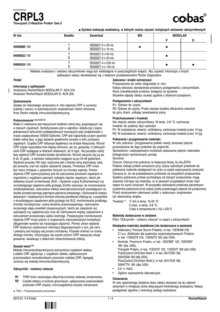 05112761001V6 CRPL3 Tina-quant C-Reactive Protein Gen.3 Symbol wskazuje analizatory, w których można używać niniejszych zestawów odczynnikowych Nr kat. Butelka 902 Zawartość MODULAR P 04956885 190 1 2 REAGENT 6 REAGENT 6 x 20 mL x 10 mL 04956923 190 1 2 REAGENT 6 REAGENT 6 x 63 mL x 33 mL D 1 REAGENT 4 x 235 mL 2 REAGENT 4 x 116 mL Niektóre analizatory i zestawy odczynnikowe mogą być niedostępne w poszczególnych krajach. Aby uzyskać informacje o innych aplikacjach należy skontaktować się z lokalnym przedstawicielem Roche Diagnostics. Polski Zalecenia i środki ostrożności Przeznaczone do celów diagnostyki in vitro. Informacja o aplikacjach Należy stosować standardowe procedury postępowania z odczynnikami. Analizatory Roche/Hitachi MODULAR P: ACN 210. Karta charakterystyki produktu dostępna na życzenie. Analizator Roche/Hitachi MODULAR D: ACN 200. Wszelkie odpady należy usuwać zgodnie z lokalnymi przepisami. 04995554 190 Zastosowanie Zestaw do ilościowego oznaczania in vitro stężenia CRP w surowicy ludzkiej i osoczu w automatycznych analizatorach chemii klinicznej firmy Roche metodą immunoturbidymetryczną. Podsumowanie1,2,3,4,5,6,7,8 Białko C-reaktywne jest klasycznym białkiem ostrej fazy, pojawiającym się w stanach zapalnych. Syntetyzowane jest w wątrobie i składa się z pięciu jednakowych łańcuchów polipeptydowych tworzących pięć podjednostek o masie cząsteczkowej 105000 Daltonów. CRP jest najbardziej czułym spośród białek ostrej fazy, a jego stężenie gwałtownie wzrasta w toku procesów zapalnych. Cząstka CRP aktywuje dopełniacz na drodze klasycznej. Wzrost CRP często wyprzedza inne objawy kliniczne, jak np. gorączkę. U zdrowych osób CRP występuje w ilościach śladowych, do 5 mg/L. Na początku ostrej fazy stężenie CRP wzrasta bardzo dynamicznie. Wzrost zaczyna się już po 6 do 12 godz., a wartości maksymalne osiągane są po 24-48 godzinach. Stężenie powyżej 100 mg/L kojarzone jest z bardzo silną stymulacją, taką jak poważny uraz lub ciężkie zakażenie (sepsa). Produkcja CRP może być nieco mniejsza u pacjentów chorych na choroby wątroby. Pomiar stężenia CRP wykorzystywany jest do wykrywania procesów zapalnych w organiźmie z wyjątkiem pewnych rodzajów stanów zapalnych, takich jak układowy toczeń rumieniowaty (SLE = Systemic Lupus Erythematosus) czy wrzodziejącego zapalenia jelita grubego (Colitis ulcerosa), do monitorowania antybiotykoterapii, wykrywania infekcji wewnątrzmacicznych powstających na skutek przedwczesnego pęknięcia pęcherza płodowego, różnicowania między aktywnymi i nieaktywnymi formami choroby powikłanej infekcją np. u pacjentów z wrzodziejącym zapaleniem jelita grubego lub SLE, monitorowania przebiegu choroby reumatycznej i oceny leczenia przeciwzapalnego, wykrywania wczesnego etapu powikłań pooperacyjnych, takich jak zakażenia ran, zakrzepica czy zapalenia płuc oraz do różnicowania między zakażeniem a odrzuceniem przeszczepu szpiku kostnego. Pooperacyjne monitorowanie stężenia CRP może pomóc w rozpoznaniu nieoczekiwanych komplikacji (długotrwałe wysokie lub narastające stężenie). Pomiar zmian stężenia CRP dostarcza użytecznych informacji diagnostycznych o tym, jak ostry i poważny jest toczący się proces chorobowy. Pozwala również na ocenę etiologii choroby. Utrzymujący się wysoki poziom CRP zazwyczaj rokuje poważnie, świadcząc o obecności niekontrolowanej infekcji. Zasada testu9,10 Metoda immunoturbidymetryczna wzmocniona cząstkami lateksu. Ludzkie CRP aglutynuje z cząstkami lateksu opłaszczonymi przeciwciałami monoklonalnymi przeciwko ludzkiej CRP. Agregaty oznacza się metodą immunoturbidymetryczną. Odczynniki - roztwory robocze R1 R2 TRISa bufor zawierający albuminę surowicy wołowej; konserwanty. Cząstki lateksu w buforze glicynowym, opłaszczone przeciwciałami przeciwko CRP (mysie), immunoglobuliny (mysie); konserwant. a) TRIS = Tri(hydroksymetylo)-aminometan 2012-01, V 6 Polski Postępowanie z odczynnikami R1: Gotowe do użycia. R2: Gotowe do użycia. Przed użyciem butelkę kilkukrotnie odwrócić do góry dnem, unikając powstawania piany. Przechowywanie i trwałość Nie otwarty zestaw odczynnikowy: W temp. 2-8 ℃ zachowuje trwałość do podanej daty ważności R1: W analizatorze, otwarty i schłodzony, zachowuje trwałość przez 14 tyg. R2: W analizatorze, otwarty i schłodzony, zachowuje trwałość przez 14 tyg. Pobieranie i przygotowanie materiału W celu pobrania i przygotowania próbek należy stosować jedynie przeznaczone do tego probówki lub pojemniki. Sprawdzono i zaakceptowano możliwość stosowania jedynie materiałów biologicznych wymienionych poniżej. Surowica Osocze: Osocze krwi pobranej na heparynę litową, K2-/K3-EDTA . Podane rodzaje próbek oznaczono przy użyciu wybranych probówek do pobierania materiału dostępnych na rynku w czasie wykonywania oznaczeń. Oznacza to, że nie przetestowano probówek od wszystkich producentów. Systemy pobierania próbek pochodzące od różnych producentów mogą zawierać różniące się materiały, co w pewnych przypadkach może mieć wpływ na wynik oznaczeń. W przypadku stosowania probówek pierwotnych (systemów pobierania krwi) należy ściśle przestrzegać zaleceń ich producenta. Przed oznaczeniem odwirować próbki z widocznym zmętnieniem lub obecnością strątów. Trwałość:11 11 dni w temp. 15-25 ℃ 2 mies. w temp. 2-8 ℃ 3 lata w temperaturze (-15)–(-25)°C Materiały dostarczone w zestawie Patrz "Odczynniki - roztwory robocze" w części o odczynnikach Niezbędne materiały dodatkowe (nie dostarczone w zestawie) • Kalibratory: Preciset Serum Proteins, nr kat. 11876406 216; C.f.a.s. (Kalibrator dla systemów zautomatyzowanych) Proteins, nr kat. 11355279 216, 11355279 160 (dla USA) • Kontrole: Precinorm Protein, nr kat. 10557897 122, 10557897 160 (dla USA); Precipath Protein, nr kat. 11333127 122, 11333127 160 (dla USA) PreciControl