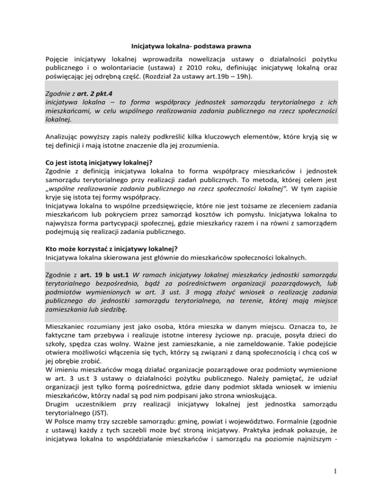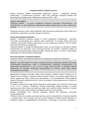 Inicjatywa lokalna- podstawa prawna Pojęcie inicjatywy lokalnej wprowadziła nowelizacja ustawy o działalności pożytku publicznego i o wolontariacie (ustawa) z 2010 roku, definiując inicjatywę lokalną oraz poświęcając jej odrębną część. (Rozdział 2a ustawy art.19b – 19h). Zgodnie z art. 2 pkt.4 inicjatywa lokalna – to forma współpracy jednostek samorządu terytorialnego z ich mieszkańcami, w celu wspólnego realizowania zadania publicznego na rzecz społeczności lokalnej. Analizując powyższy zapis należy podkreślić kilka kluczowych elementów, które kryją się w tej definicji i mają istotne znaczenie dla jej zrozumienia. Co jest istotą inicjatywy lokalnej? Zgodnie z definicją inicjatywa lokalna to forma współpracy mieszkańców i jednostek samorządu terytorialnego przy realizacji zadań publicznych. To metoda, której celem jest „wspólne realizowanie zadania publicznego na rzecz społeczności lokalnej”. W tym zapisie kryje się istota tej formy współpracy. Inicjatywa lokalna to wspólne przedsięwzięcie, które nie jest tożsame ze zleceniem zadania mieszkańcom lub pokryciem przez samorząd kosztów ich pomysłu. Inicjatywa lokalna to najwyższa forma partycypacji społecznej, gdzie mieszkańcy razem i na równi z samorządem podejmują się realizacji zadania publicznego. Kto może korzystać z inicjatywy lokalnej? Inicjatywa lokalna skierowana jest głównie do mieszkańców społeczności lokalnych. Zgodnie z art. 19 b ust.1 W ramach inicjatywy lokalnej mieszkańcy jednostki samorządu terytorialnego bezpośrednio, bądź za pośrednictwem organizacji pozarządowych, lub podmiotów wymienionych w art. 3 ust. 3 mogą złożyć wniosek o realizację zadania publicznego do jednostki samorządu terytorialnego, na terenie, której mają miejsce zamieszkania lub siedzibę. Mieszkaniec rozumiany jest jako osoba, która mieszka w danym miejscu. Oznacza to, że faktyczne tam przebywa i realizuje istotne interesy życiowe np. pracuje, posyła dzieci do szkoły, spędza czas wolny. Ważne jest zamieszkanie, a nie zameldowanie. Takie podejście otwiera możliwości włączenia się tych, którzy są związani z daną społecznością i chcą coś w jej obrębie zrobić. W imieniu mieszkańców mogą działać organizacje pozarządowe oraz podmioty wymienione w art. 3 us.t 3 ustawy o działalności pożytku publicznego. Należy pamiętać, że udział organizacji jest tylko formą pośrednictwa, gdzie dany podmiot składa wniosek w imieniu mieszkańców, którzy nadal są pod nim podpisani jako strona wnioskująca. Drugim uczestnikiem przy realizacji inicjatywy lokalnej jest jednostka samorządu terytorialnego (JST). W Polsce mamy trzy szczeble samorządu: gminę, powiat i województwo. Formalnie (zgodnie z ustawą) każdy z tych szczebli może być stroną inicjatywy. Praktyka jednak pokazuje, że inicjatywa lokalna to współdziałanie mieszkańców i samorządu na poziomie najniższym - 1 gminnym. Wynika to z faktu, że podejmowane inicjatywy najczęściej dotyczą spraw mieszczących się w zadaniach gminy. Czego może dotyczyć inicjatywa lokalna? Inicjatywa lokalna dotyczy zadań publicznych, które dany samorząd ma do realizacji. Zakres zadań gminy, powiatu i województwa różni się od siebie. Niestety nie każdy pomysł mieszkańców może być objęty tą formą współpracy. Zgodnie z ustawą mamy do czynienia z poniższym, zamkniętym katalogiem zadań publicznych. Art. 19b ust.1 1) działalności, o której mowa w art. 4 ust. 1 pkt 13, obejmującej w szczególności budowę, rozbudowę lub remont dróg, kanalizacji, sieci wodociągowej, budynków oraz obiektów architektury stanowiących własność jednostek samorządu terytorialnego; 2) działalności, o której mowa w art. 4 ust. 1 pkt 3, 4, 5, 16 i 27; 3) edukacji, oświaty i wychowania, o których mowa w art. 4 ust. 1 pkt 14; 4) działalności w sferze kultury fizycznej i turystyki, o której mowa w art. 4 ust. 1 pkt 17 i 19; 5) ochrony przyrody, w tym zieleni w miastach i wsiach, o której mowa w art. 4 ust. 1 pkt 18; 6) porządku i bezpieczeństwa publicznego, o którym mowa w art. 4 ust. 1 pkt 20. Katalog ten jest zgodny z art. 4 ustawy. Oznacza to, że każda inicjatywa musi wpisać się w wyżej wymienione zadania. Wniosek o inicjatywę lokalną może dotyczyć (zgodnie z art. 19b ust. 1): Sfery pożytku publicznego – obszar zadań publicznych wskazanych w art. 4 ust. 1 (doprecyzowują one punkty z art. 19b ust. 1) 1) działalności, o której mowa w art. 4 ust. 1 pkt 13, obejmującej w szczególności budowę, rozbudowę lub remont dróg, kanalizacji, sieci wodociągowej, budynków oraz obiektów architektury stanowiących własność jednostek samorządu terytorialnego 13) działalność wspomagająca rozwój wspólnot i społeczności lokalnych 2) działalności, o której mowa w art. 4 ust. 1 pkt 3, 4, 5, 16 i 27 3) działalność charytatywna 4) podtrzymywanie i upowszechnianie tradycji narodowej, pielęgnowanie polskości oraz rozwój świadomości narodowej, obywatelskiej i kulturowej 5) działalność na rzecz mniejszości narodowych i etnicznych oraz języka regionalnego 16) kultura, sztuka, ochrona dóbr kultury i dziedzictwa narodowego 27) promocja i organizacja wolontariatu 2 3) edukacji, oświaty i wychowania, o których mowa w art. 4 ust. 1 pkt 14 14) nauka, szkolnictwo wyższe, edukacja, oświata i wychowanie 4) działalności w sferze kultury fizycznej i turystyki, o której mowa w art. 4 ust. 1 pkt. 17 i 19 17) wspieranie i upowszechnianie kultury fizycznej 19) turystyka i krajoznawstwo 5) ochrony przyrody, w tym zieleni w miastach i wsiach, o której mowa w art. 4 ust. 1 pkt 18 18) ekologia i ochrona zwierząt oraz ochrona dziedzictwa przyrodniczego 6) porządku i bezpieczeństwa publicznego, o którym mowa w art. 4 ust. 1 pkt 20 20) porządek i bezpieczeństwo publiczne Na podstawie publikacji „Jak korzystać z inicjatywy lokalnej?”-Łukasz Waszak, se