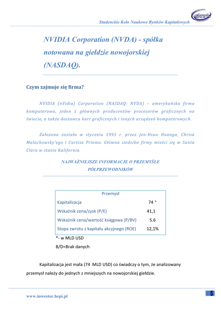 Studenckie Koło Naukowe Rynków Kapitałowych NVIDIA Corporation (NVDA) - spółka notowana na giełdzie nowojorskiej (NASDAQ). Czym zajmuje się firma? NVIDIA (nVidia) Corporation (NASDAQ: NVDA) – amerykańska firma komputerowa, jeden z głównych producentów procesorów graficznych na świecie, a także dostawca kart graficznych i innych urządzeń komputerowych. Założona została w styczniu 1993 r. przez Jen-Hsun Huanga, Chrisa Malachowsky'ego i Curtisa Priema. Główna siedziba firmy mieści się w Santa Clara w stanie Kalifornia. NAJWAśNIEJSZE INFORMACJE O PRZEMYŚLE PÓŁPRZEWODNIKÓW Przemysł Kapitalizacja Wskaźnik cena/zysk (P/E) 74 * 41,1 Wskaźnik cena/wartość księgowa (P/BV) 5.6 Stopa zwrotu z kapitału akcyjnego (ROE) 12,1% *- w MLD USD B/D=Brak danych Kapitalizacja jest mała (74 MLD USD) co świadczy o tym, że analizowany przemysł należy do jednych z mniejszych na nowojorskiej giełdzie. www.inwestor.hepi.pl 1 Studenckie Koło Naukowe Rynków Kapitałowych NAJWAśNIEJSZE INFORMACJE O SPÓŁCE Okres 2007 2006 2005 Przychody* 3,068.77 2,375.69 2,010.03 Zysk brutto* 1,300.45 910.03 647.56 Zysk netto** 448.83 301.18 88.62 Zysk na akcję EPS 1.15 0.82 0.25 Stopa dywidendy B/D B/D B/D 2007 rok Kapitalizacja* 11.87 Wskaźnik cena/zysk (P/E) 28,77 Stopa zwrotu z aktywów (ROA) 16.20% Stopa zwrotu z kapitału akcyjnego (ROE) 25,59% Dochód na akcje Kwartalny wzrost przychodów (YOY) EBIDA Kwartalny wzrost zysku (YOY) Wskaźnik Beta Roczna stopa zwrotu Data wypłaty dywidendy 8.708 38,70% 707.75** 67,90% 4.65 7,71% B/D W wtorek na giełdzie nowojorskiej akcje NVIDIA 0,78% i osiągnęły poziom 32.98 USD, dzięki czemu ich łączna wartość wyniosła 78.40 mld USD. Spółka NVIDIA jest w dobrej kondycji finansowej, co potwierdza wypracowany przez spółkę zysk netto w wysokości 448,83 MLN USD. Wzrost zysku netto spółki wykazuje tendencje wzrostową co jest informacją korzystną dla inwestorów. www.inwestor.hepi.pl 2 Studenckie Koło ło Naukowe Rynków Kapitałowych Wskaźnik cena/zysk Spółka Przemysł 32,96 24,1 Następną ważną informacją na którą trzeba zwrócić uwagę jest wartość wskaźnika Beta (4,65), ), którego akcje wykazują dużo większą zmienność w porównaniu z indeksem S&P 500 co oznacza, że NVIDIA jest walorem ofensywnym dla la inwestorów długoterminowych. Jeżeli indeks S&P 500 wzrośnie o 1% to analizowana alizowana spółka wzrośnie o 4,65%. %. Natomiast w sytuacji, gdy indeks S&P 500 spadnie o 1% to NVIDIA spadnie o 4,65%. Wartość wskaźnika ROE dla NVIDIA (25,59%) jest wyższa niż średnia wartość dla analizowanego przemysłu (12,1%) ( %) co oznacza, że spółka osiągnęła wyższą ższą stopę zwrotu z kapitału własnego niż średnia dla całego przemysłu co jest informacją pozytywną. Wskaźnik cena/zysk jaki odnotowała spółka (28,77) jest niższy szy w porównaniu z średnią dla pozostałych spółek (41,1) ( co jest informacją negatywną. Wnioski: Analizowana spółka charakteryzuje się dobrymi wskaźnikami co wpływa pozytywnie dla potencjalnych inwestorów długoterminowych. Wypracowany Wypra przez spółkę zysk netto oraz wysoki poziom wskaźnika cena/zysk wpływają korzystnie dla potencjalnych inwestorów. Jedynie niski poziom wskaźnika ROE wpływa negatywnie. Analizując powyższe dane można stwierdzić, że spółka wpływa pozytywnie dla inwestora długoterminowego. www.inwestor.hepi.pl 3 Studenckie Koło Naukowe Rynków Kapitałowych Zestawienie porównawcze Nazwa spółki NVDA AMD CREAF NVIDIA Corporation Advanced Micro Devices, Inc. Creative Technology Ltd. (ADR) Akcja której firmy będzie miała szacunkowo największy wzrost ceny? Cena obecna 33.01 13.53 5.91 42.20 B/D B/D 27.82% B/D B/D 47.14 B/D B/D 42.81% B/D B/D Cena na koniec roku finansowego Zmiana ceny w % Cena na przyszły rok finansowy Zmiana ceny w % Jaki poziom przychodów i zysku netto odnotowała spółka w ciągu ostatnich 12-miesięcy? Przychody* Zysk netto** 3.07 5.55 1.12 448.13 -961.52 -55.95 Jaki wzrost przychodów i zysku netto odnotowała spółka? Wzrost przychodów 29.20% -7.40% -0.80% Wzrost zysku netto 48.80% B/D 698.90% Jaki jest stosunek ceny akcji do zysku? Wskaźnik cena/zysk (P/E) 29.10 B/D B/D Jak kształtowała się cena akcji w ciągu ostatnich 12-miesięcy? Zmiana ceny w ciągu ostatnich 3- miesięcy 8.1% -14.3% -14.2% -4.7% -36.3% -13.3% 7.7% -58.5% -7.4% 707.75 600.69 3.28 Zmiana ceny w ciągu ostatnich 6- miesięcy Zmiana ceny w ciągu ostatnich 12- miesięcy EBIDA ** www.inwestor.hepi.pl 4 Studenckie Koło Naukowe Rynków Kapitałowych Zysk na akcję (EPS) 1.146 -1.874 -0.672 Pracownicy 4,083 16,500 6,600 38.70% -7.40% 8.60% 11.87 7.50 495.58** Kwartalna stopa wzrostu (YOY) Kapitalizacja * *= w MLD USD Łączna wartość akcji NVIDIA wynosi 11,87 mld USD. Kalifornijska spółka ma sporą przewagę nad pozostałymi spółkami, w skład której wchodzą: Advanced Micro Devices, Inc., amerykańskie przedsiębiorstwo produkujące procesory do komputerów PC oraz Creative Technology Limited - firma komputerowa. NVIDIA wyprzedza Advanced Micro i Creative pod względem wzrostu przychodów. W 2007 roku firma komputerowa NVIDIA zarobiła netto 448,13 mln USD. Przychody NVIDIA wyniosły 3,07 mld dolarów i były gorsze od wyniku lidera pod tym względem – Advanced Micro, która osiągnęła sprzedaż na poziomie 5,55 mld USD. Akcje spółki zyskały w ciągu ostatniego roku około 8%. Kalifornijska spółka sukcesywnie poprawia wyniki i konsekwentnie zwiększa swoje zyski. Miniony rok był trzecim z rzędu, w którym firma zwiększyła przychody jak i zysk netto. Wartość wskaźnika informująca inwestorów o wielkości zysku jaki przypada na jedną akcję (EPS) jest najwyższą wartością w powyższym zestawieniu, co jest informacją bardzo pozytywną. Wartość wskaźnika cena/zysk jest najwyższą wartością w porównaniu z pozostałymi spółkami co wpływa bardzo pozytywnie dla potencjalnych inwesto