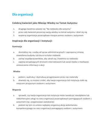 Dla organizacji Celebruj kwiecień jako Miesiąc Wiedzy na Temat Autyzmu: 1. 2. 3. drugiego kwietnia zaświeć się "Na niebiesko dla autyzmu" przez cały kwiecień poszerzaj swoją wiedzę na temat autyzmu i dziel się nią wspieraj organizacje pozarządowe niosące pomoc osobom z autyzmem Inspiracje dla organizacji i instytucji: Iluminacja a. skontaktuj się z osobą od spraw administracyjnych i zaproponuj zmianę oświetlenia budynku lub biura na kolor niebieski b. zachęć współpracowników, aby ubrali się 2 kwietnia na niebiesko c. zapytaj zarządzających stronami internetowymi lub social media o możliwość umieszczenia informacji o akcji Wiedza a. b. pobierz, wydrukuj i dystrybuuj przygotowane przez nas materiały dowiedz się, co możesz zrobić, aby twoja organizacja lub instytucja stała się miejscem przyjaznym osobom z autyzmem Wsparcie a. sprawdź, czy twoja organizacja lub instytucja może świadczyć nieodpłatne lub niekomercyjne usługi na rzecz organizacji pozarządowych pomagających osobom z autyzmem (np. zorganizować zwiedzanie) b. podziel się tym co umiesz najlepiej zorganizuj akcję wolontariatu kompetencyjnego na rzecz organizacji pomagającej osobom z autyzmem Dla osób indywidualnych Celebruj kwiecień jako Miesiąc Wiedzy na Temat Autyzmu: 1. 2. 3. drugiego kwietnia zaświeć się "Na niebiesko dla autyzmu" przez cały kwiecień poszerzaj swoją wiedzę na temat autyzmu i dziel się nią wspieraj organizacje pozarządowe niosące pomoc osobom z autyzmem Inspiracje dla osób indywidualnych: Iluminacja 1. 2. 3. ubierz się tego dnia na niebiesko lub dodaj niebieski element do swojego ubrania (niebieska może być tasiemka przy rowerze, ozdoba przy obroży Twojego pupila, kolor paznokci lub czapka) jeżeli masz talent kulinarny, to przygotuj niebieską potrawę na obiad i podziel się swoim przepisem kręć filmy i rób zdjęcia dokumentujące niebieską iluminację i umieszczaj je w social media Wiedza 1. 2. 3. bądź na bieżąco i zapisz się do naszego newslettera pobierz i wydrukuj przygotowane przez nas materiały, a potem poproś o ich publiczne eksponowanie w Twojej szkole, bibliotece lub ulubionej kawiarni lubisz oglądać filmy - zorganizuj pokaz filmów w których bohaterami są osoby z autyzmem Wsparcie 1. 2. 3. przekaż 1% podatku organizacjom pozarządowym niosącym pomoc osobom z autyzmem zostań darczyńcą i wpłać darowiznę finansową zgłoś się jako wolontariusz Dla firm Celebruj kwiecień jako Miesiąc Wiedzy na Temat Autyzmu: 1. 2. 3. drugiego kwietnia zaświeć się "Na niebiesko dla autyzmu" przez cały kwiecień poszerzaj swoją wiedzę na temat autyzmu i dziel się nią wspieraj organizacje pozarządowe niosące pomoc osobom z autyzmem Inspiracje dla firm: Iluminacja 1. 2. 3. skontaktuj się z zarządcą nieruchomości lub office managerem i zaproponuj zmianę oświetlenia budynku lub biura na kolor niebieski, skontaktuj się z office managerem i zaproponuj organizację blue wednesday wzorem casual friday, skontaktuj się z pr managerem lub it managerem i zaproponuj wstawienie informacji o akcji i zmianę kolorystyki na waszej stronie lub social media, Wiedza 1. 2. 3. pobierz, wydrukuj i dystrybuuj przygotowane przez nas materiały wyszukaj w internecie informacje dot. autyzmu i branży, w której pracujesz i podziel się nimi ze swoimi współpracownikami, dowiedz się o specyficznych umiejętnościach osób z autyzmem i zespołem Aspergera, które czynią je wyjątkowymi pracownikami Wsparcie 1. 2. 3. zorganizuj akcję wolontariatu pracowniczego na rzecz organizacji pozarządowej pomagającej osobom z autyzmem sprawdź, w jaki sposób Twoja firma wspiera inicjatywy wolontariatu pracowniczego, wybierz organizację zajmującą się autyzmem 4. 5. 6. zapytaj o jej potrzeby i chęć współpracy, zaproś do współpracy swoich współpracowników przeprowadźcie akcję Zrealizowałeś lub uczestniczyłeś w ciekawym wydarzeniu? Napisz nam o tym na [email protected] lub [email protected], a my umieścimy je na mapie niebieskich inicjatyw oraz w galerii zdjęć.