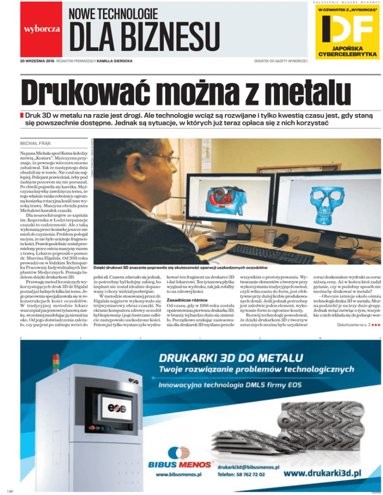 O G Ł O S Z E N I E NOWE TECHNOLOGIE W Ł A S N E W Y D A W C Y W CZWARTEK Z „WYBORCZĄ” DLA BIZNESU 20 WRZEŚNIA 2016 | REDAKTOR PROWADZĄCY KAMILLA SIEROCKA JAPOŃSKA CYBERCELEBRYTKA DODATEK DO GAZETY WYBORCZEJ Drukować można z metalu u Druk 3D w metalu na razie jest drogi. Ale technologie wciąż są rozwijane i tylko kwestią czasu jest, gdy staną MI CHAŁ FRĄK Na pana Michała spod Kutna koledzy mówią „Kosiara”. Mężczyzna przyznaje, że pewnego wieczoru mocno zabalował. Tak że następnego dnia obudził się w rowie. Nie czuł się najlepiej. Policjant powiedział, żeby pod żadnym pozorem się nie poruszał. Po chwili pojawiła się karetka. Mężczyzna ksywkę zawdzięcza temu, że tego właśnie ranka robotnicy ogromną kosiarką rotacyjną kosili tam wysoką trawę. Maszyna obcięła panu Michałowi kawałek czaszki. Dla neurochirurgów ze szpitala im. Kopernika w Łodzi trepanacje czaszki to codzienność. Ale z taką wykonaną przez kosiarkę jeszcze nie mieli do czynienia. Problem polegał na tym, że nie było uciętego fragmentu kości. Prawdopodobnie został przemielony przez ostrza maszyny razem z trawą. Lekarze poprosili o pomoc dr. Marcina Elgalala. Od 2011 roku prowadzi on w łódzkim Technoparku Pracownię Indywidualnych Implantów Medycznych. Pomaga ludziom dzięki drukarkom 3D. Przewagę metod leczniczych wykorzystujących druk 3D dr Elgalal poznał już ładnych kilka lat temu. Jego pracownia specjalizowała się w rekon strukcjach koś ci oczo do łów. W tra dycyj nej me to dzie le karz wszczepiał pacjentowi tytanową siatkę, wcześniej modelując ją niemal na oko. Od jego doświadczenia zależało, czy pacjent po zabiegu wróci do R 1 RP E TOMASZ STAŃCZAK / AGENCJA GAZETA się powszechnie dostępne. Jednak są sytuacje, w których już teraz opłaca się z nich korzystać Dzięki drukowi 3D znacznie poprawiła się skuteczność operacji uszkodzonych oczodołów pełni sił. Czasem zdarzało się jednak, że potrzebny był kolejny zabieg, bo implant nie został idealnie dopasowany i chory widział podwójnie. W metodzie stosowanej przez dr. Elgalala najpierw wykonywało się trójwymiarowy obraz czaszki. Na ekranie komputera zdrowy oczodół był kopiowany i jego lustrzane odbicie zastępowało uszkodzone kości. Potem już tylko wystarczyło wydruK kować ten fragment na drukarce 3D i dać lekarzowi. Ten tytanową płytkę wyginał na wydruku, tak jak robiłby to na zdrowej kości. Zasadnicze różnice Od czasu, gdy w 1986 roku została opatentowana pierwsza drukarka 3D, w branży tej bardzo dużo się zmieniło. Początkowo szukając zastosowania dla drukarek 3D myślano przede L wszystkim o prototypowaniu. Wytwarzanie elementów z tworzyw przy wykorzystaniu tradycyjnych metod, czyli wtłaczaniu do form, jest efektywne przy dużej liczbie produkowanych detali. Jeśli jednak potrzebny jest zaledwie jeden element, wykonywanie form to ogromne koszty. Rozwój technologii powodował, że dzięki drukarkom 3D z tworzyw sztucznych można było uzyskiwać A coraz doskonalsze wydruki za coraz niższą cenę. Aż w końcu ktoś zadał pytanie, czy w podobny sposób nie można by drukować w metalu? – Obecnie istnieje około ośmiu technologii druku 3D w metalu. Można podzielić je na trzy duże grupy. Jednak wciąż mówiąc o tym, wszystkie z nich wkłada się do jednego worDokończenie na s. 2 M A 33504169 2 Wtorek 20 września 2016 Gazeta Wyborcza wyborcza.pl NOWE TECHNOLOGIE DLA BIZNESU Drony nie tylko do zabawy. Pomagają w biznesie Ale trzeba uważać. Nie każdy i nie wszędzie może nimi latać. MICHAŁ FRĄK Są wszędzie. Na weselach, komuniach, imprezach sportowych i koncertach. Dzięki nim widzimy, jak rozwijają się miasta, gdzie są największe korki i jakie spustoszenia spowodowała ulewa. Drony wtargnęły w nasze życie i przestrzeń powietrzną. Najtańsze można kupić za kilkaset złotych. Najdroższe za kilkadziesiąt tysięcy. Mówiąc „dron”, zazwyczaj mamy na myśli multikoptery, czyli urządzenia wyposażone w kilka śmigieł, które potrafią zawisnąć w powietrzu. Są też drony przypominające samoloty, ale ich popularność jest znacznie mniejsza. To żaden problem kupić drona. Ale czy można nim latać bez żadnych ograniczeń? Wielu osobom wydaje się, że jeśli nie wzbijają się zbyt wysoko, to właściwie mogą latać wszędzie. Nic bardziej mylnego. – W lotach dronów obowiązuje nas prawo lotnicze. Przepisy od kilku lat są już do pra cowa ne, je śli cho dzi o używanie takiego sprzętu. Jesteśmy w wyjątkowym momencie. 23 sierpnia zostało opublikowane nowe rozporządzenie – mówi Justyna Siekierczak, dy rek tor za rzą dza ją ca www.aeroMind.pl. Kiedy można latać? Chcąc używać drona zgodnie z przepisami, powinniśmy przede wszystkim rozróżnić, w jakim celu latamy. Osoby, które robią to dla rekreacji iwłasnych potrzeb, mogą latać bez zezwoleń. Jeśli jednak zamierzamy na tym zarabiać, musimy zdać egzamin i uzyskać świadectwo kwalifikacji. Najczęstszym błędem amatorów jest nieznajomość przestrzeni powietrznej. Ludzie na co dzień nie za- stanawiają się na tym, co dzieje się na ich głowami. Tymczasem zasady poruszania się wpowietrzu są określone tak samo jak zasady ruchu drogowego. Nie jest to wiedza tajemna. Informacje na ten temat można znaleźć winternecie, ale odczytanie ich izrozumienie nie każdemu przyjdzie łatwo. Dlatego jeśli chcemy bawić się dronami nawet wyłącznie dla własnych potrzeb, warto rozważyć udział w szkoleniu. Kosztuje ono około tysiąca złotych netto, w zależności od szkoły. – Błędem jest myślenie, że możemy latać nisko przy ziemi, bo nikomu to nie szkodzi i nic się nie stanie. Przestrzeń powietrzna obowiązuje od poziomu ziemi. Jeśli jesteśmy bliżej niż 6 km od lotniska i mamy drona cięższego niż 0,6 kg, to według najnowszego rozporządzenia nie możemy się nawet oderwać od ziemi bez odpowiedniej zgody. 