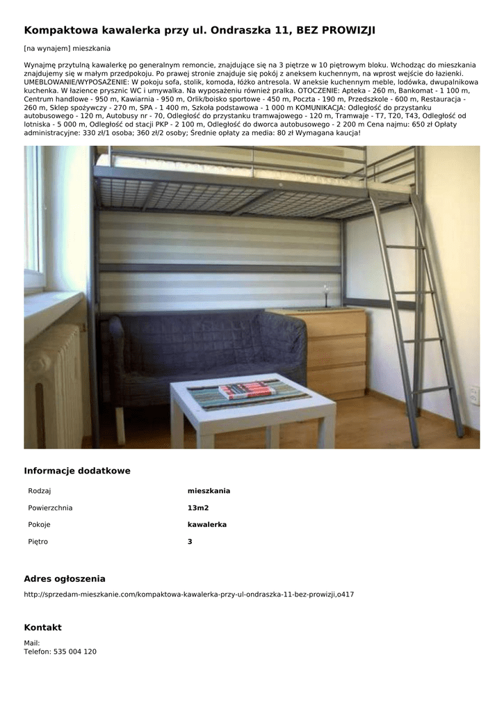 Kompaktowa kawalerka przy ul. Ondraszka 11, BEZ PROWIZJI [na wynajem] mieszkania Wynajmę przytulną kawalerkę po generalnym remoncie, znajdujące się na 3 piętrze w 10 piętrowym bloku. Wchodząc do mieszkania znajdujemy się w małym przedpokoju. Po prawej stronie znajduje się pokój z aneksem kuchennym, na wprost wejście do łazienki. UMEBLOWANIE/WYPOSAŻENIE: W pokoju sofa, stolik, komoda, łóżko antresola. W aneksie kuchennym meble, lodówka, dwupalnikowa kuchenka. W łazience prysznic WC i umywalka. Na wyposażeniu również pralka. OTOCZENIE: Apteka - 260 m, Bankomat - 1 100 m, Centrum handlowe - 950 m, Kawiarnia - 950 m, Orlik/boisko sportowe - 450 m, Poczta - 190 m, Przedszkole - 600 m, Restauracja 260 m, Sklep spożywczy - 270 m, SPA - 1 400 m, Szkoła podstawowa - 1 000 m KOMUNIKACJA: Odległość do przystanku autobusowego - 120 m, Autobusy nr - 70, Odległość do przystanku tramwajowego - 120 m, Tramwaje - T7, T20, T43, Odległość od lotniska - 5 000 m, Odległość od stacji PKP - 2 100 m, Odległość do dworca autobusowego - 2 200 m Cena najmu: 650 zł Opłaty administracyjne: 330 zł/1 osoba; 360 zł/2 osoby; Średnie opłaty za media: 80 zł Wymagana kaucja! Informacje dodatkowe Rodzaj mieszkania Powierzchnia 13m2 Pokoje kawalerka Piętro 3 Adres ogłoszenia http://sprzedam-mieszkanie.com/kompaktowa-kawalerka-przy-ul-ondraszka-11-bez-prowizji,o417 Kontakt Mail: Telefon: 535 004 120 Lokalizacja ul. Ondraszka 11, Katowice Śląskie (pl) Ogłoszenie dodano: 2016-10-03 19:47:18 Ogłoszenie wygasa: 2017-10-03 19:47:18 Powered by TCPDF (www.tcpdf.org)