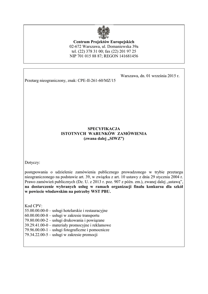 Centrum Projektów Europejskich 02-672 Warszawa, ul. Domaniewska 39a tel. (22) 378 31 00; fax (22) 201 97 25 NIP 701 015 88 87; REGON 141681456 Warszawa, dn. 01 września 2015 r. Przetarg nieograniczony, znak: CPE-II-261-60/MZ/15 SPECYFIKACJA ISTOTNYCH WARUNKÓW ZAMÓWIENIA (zwana dalej „SIWZ”) Dotyczy: postępowania o udzielenie zamówienia publicznego prowadzonego w trybie przetargu nieograniczonego na podstawie art. 39, w związku z art. 10 ustawy z dnia 29 stycznia 2004 r. Prawo zamówień publicznych (Dz. U. z 2013 r. poz. 907 z późn. zm.), zwanej dalej „ustawą”, na dostarczenie wybranych usług w ramach organizacji finału konkursu dla szkół w powiecie włodawskim na potrzeby WST PBU. Kod CPV: 55.00.00.00-0 – usługi hotelarskie i restauracyjne 60.00.00.00-8 – usługi w zakresie transportu 79.80.00.00-2 – usługi drukowania i powiązane 39.29.41.00-0 – materiały promocyjne i reklamowe 79.96.00.00-1 – usługi fotograficzne i pomocnicze 79.34.22.00-5 – usługi w zakresie promocji ROZDZIAŁ I. Opis przedmiotu zamówienia 1. 2. 3. 4. 5. 6. Przedmiotem zamówienia jest dostarczenie wybranych usług w ramach organizacji finału konkursu dla szkół w powiecie włodawskim w dniach 23-26 września w ramach Dnia Europejskiej Współpracy. Opis przedmiotu zamówienia znajduje się w załączonym projekcie umowy (załącznik nr 1 do SIWZ). Zamawiający nie dopuszcza składania ofert częściowych, nie dopuszcza składania ofert wariantowych, nie zamierza zawrzeć umowy ramowej, nie zamierza ustanowić dynamicznego systemu zakupów, nie przewiduje wyboru najkorzystniejszej oferty z zastosowaniem aukcji elektronicznej. Zamawiający przewiduje możliwość udzielania zamówień uzupełniających stanowiących nie więcej niż 20% wartości zamówienia podstawowego. Zamawiający przewiduje skorzystanie z prawa opcji. Zamawiający dopuszcza wykonanie przedmiotu zamówienia przy pomocy podwykonawców. Zgodnie z art. 36b ustawy Zamawiający żąda, aby Wykonawca wskazał w ofercie części zamówienia, których wykonanie powierzy podwykonawcom. ROZDZIAŁ II. Opis sposobu przygotowania oferty 1. 2. 3. 4. 5. 6. 7. 8. Oferta musi być złożona pod rygorem nieważności, w formie pisemnej, w formie oryginału, w języku polskim. Wzór oferty określony jest w załączniku nr 2 do SIWZ. Treść oferty musi odpowiadać treści SIWZ. Dokumenty sporządzane w języku obcym są składane wraz z tłumaczeniem na język polski. Oferta wraz z wymaganymi oświadczeniami powinna być podpisana przez osobę (osoby) mające prawo do stałego reprezentowania Wykonawcy na zewnątrz, składania w jego imieniu oświadczeń woli i zaciągania zobowiązań majątkowych. Ofertę mogą podpisać także inne osoby posiadające pełnomocnictwo do reprezentowania Wykonawcy w danym zamówieniu publicznym, dołączone do oferty w formie oryginału lub notarialnie poświadczonej kopii. Każda zapisana strona oferty wraz z załącznikami powinna być ponumerowana i podpisana lub parafowana. Wszelkie poprawki i zmiany w tekście oferty muszą być parafowane i datowane przez osobę podpisującą ofertę. Dokumenty w ofercie, stanowiące informację zastrzeżoną dla innych uczestników postępowania, tj. stanowiącą tajemnicę przedsiębiorstwa w rozumieniu art. 11 ust. 4 ustawy o zwalczaniu nieuczciwej konkurencji (Dz. U. z 2003 r. Nr 153 poz. 1503 z późn. zm.), powinny znajdować się w oddzielnej zamkniętej kopercie opatrzonej napisem „DOKUMENTY ZASTRZEŻONE”. Wszystkie dokumenty tworzące ofertę powinny być spięte (zszyte) w sposób trwały uniemożliwiający swobodne wysunięcie lub wyjęcie kartek. Wykonawcy wspólnie ubiegający się o udzielenie zamówienia, muszą ustanowić pełnomocnika do reprezentowania ich w postępowaniu o udzielenie niniejszego zamówienia lub do reprezentowania ich w postępowaniu oraz do zawarcia umowy o udzielenie przedmiotowego zamówienia publicznego. W takim przypadku, wraz z ofertą należy złożyć stosowne pełnomocnictwo określające sposób współdziałania Wykonawców wspólnie ubiegających się o zamówienie. W przypadku wyboru oferty Wykonawców wspólnie ubiegających się o udzielenie zamówienia, Zamawiający przed zawarciem umowy w sprawie zamówienia publicznego zażąda umowy regulującej współpracę tych Wykonawców. Przepisy ustawy dotyczące Wykonawcy stosuje się odpowiednio do Wykonawców wspólnie ubiegających się o udzielenie zamówienia. ROZDZIAŁ III. Termin wykonania zamówienia Termin wykonania zamówienia: od daty podpisania umowy do 30 września 2015 r. ROZDZIAŁ IV. Warunki udziału w postępowaniu, o których mowa w art. 22 ust. 1 i 2 ustawy oraz opis sposobu dokonywania oceny spełniania warunków udziału 1. O zamówienie mogą się starać Wykonawcy, którzy spełniają warunki dotyczące: 1) posiadania uprawnienia do wykonywania określonej działalności lub czynności, jeżeli przepisy nakładają obowiązek posiadania takich uprawnień: Zamawiający wymaga posiadania aktualnego wpisu do rejestru organizatorów turystyki i pośredników turystycznych. 2) posiadania wiedzy i doświadczenia: Zamawiający uzna warunek za spełniony, jeżeli Wykonawca przedstawi wykaz wykonanych należycie w okresie ostatnich trzech lat, przed upływem terminu składania ofert, a jeżeli okres prowadzenia działalności jest krótszy - w tym okresie: co najmniej dwóch usług polegających na zorganizowaniu spotkań/szkoleń/turniejów/wycieczek dla grupy minimum 60 osób każda, o wartości minimum 60 000 zł brutto każda, wraz z załączeniem dowodów, że została wykonana lub jest wykonywana należycie. 3) dysponowania odpowiednim potencjałem technicznym oraz osobami zdolnymi do wykonania zamówienia; 4) sytuacji ekonomicznej i finansowej. 2. Zamawiający zastrzega, że o zamówienie mogą się starać wyłącznie wykonawcy, u których ponad 50% zatrudnionych pracowników stanowią osoby niepełnosprawne w rozumieniu przepisów