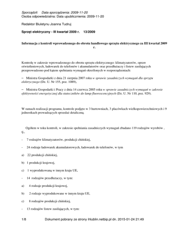 Sporządził: Data sporządzenia: 2009-11-20 Osoba odpowiedzialna: Data upublicznienia: 2009-11-20 Redaktor Biuletynu Joanna Tudruj Sprzęt elektryczny - III kwartał 2009 r. 13/2009 Informacja z kontroli wprowadzonego do obrotu handlowego sprzętu elektrycznego za III kwartał 2009 r. Kontrolę w zakresie wprowadzonego do obrotu sprzętu elektrycznego: klimatyzatorów, opraw oświetleniowych, ładowarek do telefonów i akumulatorów oraz przedłużaczy i listew zasilających przeprowadzono pod kątem spełniania wymagań określonych w rozporządzeniach: – Ministra Gospodarki z dnia 21 sierpnia 2007 roku w sprawie zasadniczych wymagań dla sprzętu elektrycznego (Dz. U. Nr 155, poz. 1089), – Ministra Gospodarki i Pracy z dnia 14 czerwca 2005 roku w sprawie zasadniczych wymagań w zakresie efektywności energetycznej dla stateczników do lamp fluorescencyjnych (Dz. U. Nr 110, poz. 929). W ramach realizacji programu, kontrole podjęto w 3 hurtowniach, 3 placówkach wielkopowierzchniowych i 9 jednostkach prowadzących sprzedaż detaliczną. Ogółem w toku kontroli, w zakresie spełniania zasadniczych wymagań zbadano 119 rodzajów wyrobów , tj., - 7 rodzajów klimatyzatorów, produkcji chińskiej, - 24 rodzaje ładowarek akumulatorowych, ładowarek do telefonów, w tym a) 22 produkcji chińskiej, b) 1 produkcji krajowej, c) 1 wyprodukowaną w innym kraju UE, - 14 rodzajów przedłużaczy, w tym: a) 4 rodzaje produkcji krajowej, b) 2 rodzaje wyprodukowane w innym kraju UE, c) 8 rodzajów produkcji chińskiej, 1/8 13 rodzajów listew zasilających, w tym: Dokument pobrany ze strony ihlublin.netbip.pl dn. 2015-01-24 21:49 a) 10 rodzajów produkcji krajowej, b) 3 rodzaje produkcji chińskiej, - 61 rodzajów opraw oświetleniowych, tym: a) 19 rodzajów produkcji krajowej, b) 15 rodzajów wyprodukowanych w innych krajach UE, c) 27 rodzajów produkcji chińskiej. Ustalenia kontroli w odniesieniu do poszczególnych zagadnień ujętych w programie kontroli przedstawiały się następująco: 1. Oznakowanie CE. Z uwagi na brak oznakowania CE zakwestionowano oprawę oświetleniową przenośną model OLIMPIA 069. Brak znaku CE zamieszczonego bezpośrednio na sprzęcie elektrycznym stwierdzono na oprawach oświetleniowych „Alfa” 00770 „Sikorka”, 3x60W. Producent opraw oświetleniowych „Alfa” 00770 „Sikorka” zamieścił oznakowanie CE bezpośrednio na wyrobach znajdujących się w jednostce kontrolowanej. Oświadczył, że dokonał sprawdzenia oznakowania pozostałych wprowadzonych do obrotu lamp podłogowych „Alfa” 00770 Sikorka i w przypadku braku oznakowania zostało ono zamieszczone przez serwisantów firmy. Osoby odpowiedzialne za oznakowanie sprzedawanych wyrobów w kontrolowanych jednostkach przesłuchano w charakterze sprawców wykroczenia w związku z naruszeniem § 11 ust. 1 i 2 rozporządzenia Ministra Gospodarki z dnia 21 sierpnia 2007 r. w sprawie zasadniczych wymagań dla sprzętu elektrycznego. Biorąc pod uwagę złożone wyjaśnienia oraz pojedyncze egzemplarze nieoznakowanych CE wyrobów, nie skierowano wniosków do sądu. Pozostały objęty kontrolą sprzęt elektryczny posiadał oznakowanie CE umieszczone w sposób czytelny i trwały, zgodnie ze wzorem określonym w załączniku do w/w rozporządzenia. Inne znaki umieszczone na wyrobie lub na jego opakowaniu nie zmniejszały widoczności i czytelności oznakowania CE. 2. Sprawdzenie zgodności wyrobów z wymaganiami zasadniczymi określonymi w § 5-7 rozporządzenia Ministra Gospodarki z dnia 21 sierpnia 2007r. w sprawie zasadniczych wymagań dla sprzętu elektrycznego (Dz. U. Nr 155, poz. 1089). Przedłużacze elektryczne i listwy zasilające. Podczas kontroli stwierdzono, że 2 rodzaje przedłużaczy z zabezpieczeniem przeciwprzepięciowym model EP6 EDV Nr 14731 i EP5 EDV Nr 14730, nie spełnia wymagań zasadniczych określonych w § 5 ust.1 w/w rozporządzenia, z uwagi na brak instrukcji obsługi oraz wyłącznie obcojęzyczne ostrzeżenia na etykietach. Do dystrybutora odpowiedzialnego za udostępnienie wyrobów po raz pierwszy na terytorium RP skierowano 2/8 Dokument pobrany ze strony ihlublin.netbip.pl dn. 2015-01-24 21:49 pismo informujące o możliwości podjęcia dobrowolnych działań naprawczych zmierzających do usunięcia stwierdzonych niezgodności. W udzielonej odpowiedzi dystrybutor poinformował tut. Inspektorat, że zaprzestał sprzedaży przedłużaczy z zabezpieczeniem przeciwprzepięciowym EP6 EDV Nr 14731 i EP5 EDV Nr 14730. Oświadczył, że nie posiada w magazynach firmy przedmiotowego przedłużacza. Jednocześnie przeprowadził działania monitoringowe mające na celu ustalenie liczby przedłużaczy model EP6 EDV Nr 14731 i EP5 EDV Nr 14730 znajdujących się w obrocie. Dystrybutor oświadczył, że w jednostkach, w których znajdowały się przedmiotowe przedłużacze niezgodności zostały usunięte. Do tut. Inspektoratu zostały nadesłane wzory instrukcji oraz zestawienia odbiorców przedłużaczy. W listwach KEMOT model URZ 3063, stwierdzono brak symbolu rodzaju prądu lub oznakowania częstotliwości znamionowej oraz brak oznaczenia prądu wymiennego bezpiecznika, co narusza § 5.1 w/w rozporządzenia. Producent poinformowany o stwierdzonych niezgodnościach podjął dobrowolne działania naprawcze zmierzające do ich wyeliminowania. Zobowiązał się do dostarczenia stosownych etykiet do kontrahentów, celem zamieszczenia ich na przedmiotowych listwach zasilających. Oprawy oświetleniowe Podczas przeprowadzonych kontroli stwierdzono, że poddane ocenie organoleptycznej n/w oprawy oświetleniowe nie spełniały wymagań zasadniczych określonych w § 5 ust. 1, § 6 ust.1 i § 7 ust.1, pkt 1 i 4,w/w rozporządzenia: • lampy stołowe: model DONA 9/84 K13, z uwagi na to, że dostępne dla dotyku części metalowe, stykają się z izolacją podstawową przewodów wewnętrznych, brak przepustów izolacyjnych wykonanych z materiału izolacyjnego w miejscach przechodzenia przewodu 