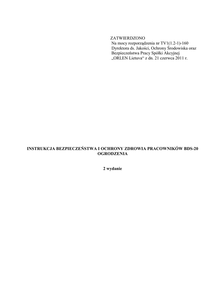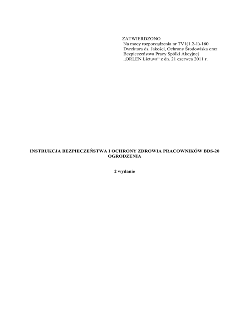 ZATWIERDZONO Na mocy rozporządzenia nr TV1(1.2-1)-160 Dyrektora ds. Jakości, Ochrony Środowiska oraz Bezpieczeństwa Pracy Spółki Akcyjnej „ORLEN Lietuva“ z dn. 21 czerwca 2011 r. INSTRUKCJA BEZPIECZEŃSTWA I OCHRONY ZDROWIA PRACOWNIKÓW BDS-20 OGRODZENIA 2 wydanie Spółka Akcyjna „ORLEN Lietuva“ Instrukcija bezpieczeństwa i ochrony zdrowia pracowników BDS-20 Ogrodzenia Strona 2 z 5 2 wydanie 1. CEL 1.1. Celem instrukcji jest ustalenie wymogów dla ostrzegania i ochrony pracowników przed ewentualnym zagrożeniem poprzez wykonanie ogrodzeń w Spółce Akcyjnej „ORLEN Lietuva“ (zwanej dalej – Spółką). 2. STOSOWANIE 2.1. Wymogi instrukcji obowiązują wszystkich pracowników Spółki oraz zgodnie z postanowieniami poszczególnych umów – pracownicy firmy wykonawczej wykonujący prace na obszarze Spółki. 3. ODPOWIEDZIALNOŚĆ 3.1. Za ogrodzenie miejsc zagrożonych oraz usunięcie ogrodzeń po zniknięciu zagrożenia odpowiada niniejszy obszar lub niniejsze urządzenie obsługujący personel. 3.2. W przypadku wykonywania remontu lub innych prac za ogrodzenie miejsc zagrożonych oraz usunięcie ogrodzenia po zakończeniu prac odpowiada kierownik robót, tj. osoba, której zlecono wykonanie (organizację) poszczególnych prac oraz zarządzanie wykonawcami niniejszych robót (np., kierownicy firmy wykonawczej, kierownicy robót, itp.). 3.3. Obszar lub urządzenie obsługujący personel oraz kierownicy robót powinni zapewnić ciągłość i schludność ogrodzenia na czas istnienia jakiegokolwiek zagrożenia lub ryzyka. 4. WYMAGANIA 4.1. Wymagania ogólne 4.1.1. Miejsca, w których pracownik może doznać urazu, zatrucia, itp. (np., w wyniku upadku, potknięcia się na nierównej powierzchni, w zaniedbanym miejscu pracy, poślizgnięcia się na mokrej, tłustej posadzce, wpadnięcia do wykopu, przedostania się do dróg oddechowych niebezpiecznych substancji chemicznych, pary lub gazów, i in.), należy ogrodzić oraz/lub oznakować. Do ogrodzenia zagrożonych miejsc stosuje się trwałych (sztywnych) ogrodzeń oraz/lub taśm ostrzegawczych, zaś do oznakowania – znaków ostrzegawczych (patrz Instrukcję stosowania znaków bezpieczeństwa i ochrony zdrowia BDS-41). 4.1.2. W przypadku ogrodzenia obszaru taśmą ostrzegawczą, zwłaszcza ścieżki, drogi, należy przewidzieć, a także w miarę potrzeby wykonać miejsca poruszania się dla ludzi i pojazdów. 4.1.3. Pracownik w razie konieczności może wchodzić na teren ogrodzony jedynie po uzyskaniu słownego zezwolenia pracowników pracujących na obszarze ogrodzonym. 4.1.4. Trwałe (sztywne) ogrodzenia ochronne, taśmy ostrzegawcze oraz znaki ostrzegawcze należy usunąć po usunięciu zagrożenia. W przypadku zmniejszenia terenu zagrożonego należy odpowiednio zmniejszyć obszar ogrodzony, aby nie stwarzał przeszkód do jego użytkowania, wykonania na nim prac remontowych oraz poruszania się ludzi. 4.2. Trwałe (sztywne) ogrodzenia ochronne 4.2.1. Trwałe (sztywne) ogrodzenia ochronne – przez co należy rozumieć zbierane ciągłe ogrodzenia, składające się z typowych metalowych, plastikowych lub drewnianych elementów oraz części połączeniowych, a także ciągłe ogrodzenia z siatki drucianej. Niniejsze ogrodzenia należy stosować do ogrodzenia miejsc zagrożonych podczas realizacji długotrwałych projektów, bowiem chronią one przed przedostaniem się postronnych pracowników do miejsc zagrożonych (np., wykopy w miejscach poruszania się ludzi i pojazdów, plac rozbiórki budowli, część terenu rozmieszczenia urządzenia, która na podstawie aktu została przekazana wykonawcy do realizacji projektu, itp.). Niniejsza kopia JEST NIEMONITOROWANYM dokumentem. Przed jego użyciem należy sprawdzić ważność niniejszego wydania. Spółka Akcyjna „ORLEN Lietuva“ Instrukcija bezpieczeństwa i ochrony zdrowia pracowników BDS-20 Ogrodzenia Strona 3 z 5 2 wydanie 4.2.2. Trwałe (sztywne) ogrodzenia ochronne powinny być oznaczone znakami bezpieczeństwa i ochrony zdrowia zakazującymi wchodzenie osobom postronnym na teren ogrodzony, ostrzegającymi pracownika przed obecnym oraz/lub ewentualnym zagrożeniem na terenie ogrodzonym, oraz kierunkowskazami wskazującymi kierunek lub kierunki obejścia lub objazdu ogrodzenia. 4.2.3. Trwałe (sztywne) ogrodzenia ochronne zamontowane w nieoświetlonych miejscach poruszania się pojazdów i pracowników o ciemnej porze dnia powinny być zaopatrzone w wyraźnie widoczne lampy ostrzegawcze, zaś zamontowane w miejscach oświetlonych powinny być oznakowane znakami odbijającymi światło, aby zapewnić dobrą widoczność ogrodzeń oraz ochronić pracowników i pojazdy przed uderzeniem w ogrodzenie. 4.3. Taśmy ostrzegawcze ogrodzeniowe 4.3.1. Taśmy ostrzegawcze ogrodzeniowe – przez co należy rozumieć plastikowe jedno lub wielokolorowe taśmy ostrzegawcze ogrodzeniowe przeznaczone do ogrodzenia oraz wyznaczenia pracownikom granicy miejsc zagrożonych. Niniejsze taśmy są stosowane do ogrodzenia miejsc zagrożonych podczas wykonywania krótkotrwałych robót oraz miejsc, w których w przypadku nieprzychylnych warunków lub z powodu niewłaściwej działalności pracowników istnieje tymczasowe zagrożenie. 4.3.2. Zawieszenie taśmy ostrzegawczej ogrodzeniowej jest dopuszczalne na wysokości 90-120 cm od nad powierzchnią ziemi. Taśmy ostrzegawcze ogrodzeniowe powinny być ciągłe oraz wyraźnie widoczne. 4.3.3. Do mocowania taśmy ostrzegawczej ogrodzeniowej należy używać do tego celu przeznaczonych stojaków, kozłów, w wyjątkowych przypadkach są dopuszczalne konstrukcje urządzeń, jeżeli są rozmieszczone w odpowiednich miejscach. 4.3.4. Spółka stosuje taśmę ostrzegawczą ogrodzeniową w kolorze czerwonym z napisem „STOP“ (zwaną dalej – czerwoną taśmą ostrzegawczą ogrodzeniową) oraz taśmę ostrzegawczą ogrodzeniową w kolorze żółtym z napisem „OSTROŻNIE“ (zwaną dalej – żółtą taśmą ostrzegawczą ogrodzeniow