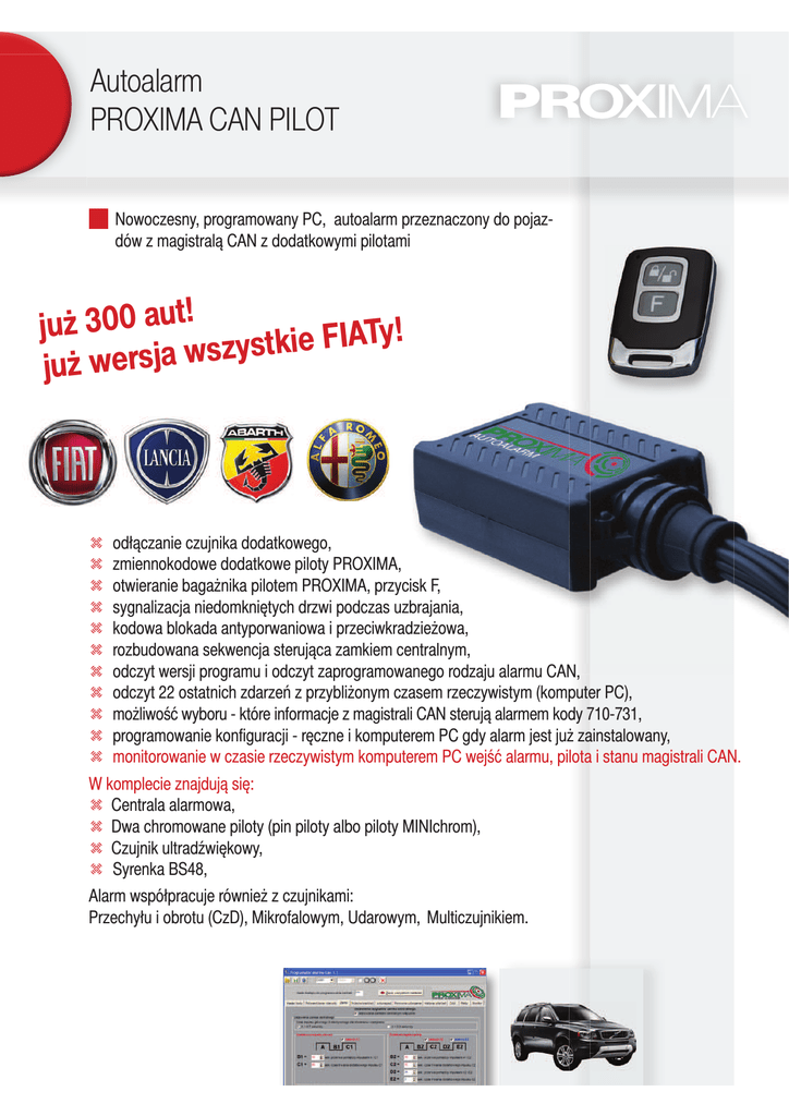Autoalarm PROXIMA CAN PILOT Nowoczesny, programowany PC, autoalarm przeznaczony do pojazdów z magistralą CAN z dodatkowymi pilotami już 300 aut! y! T A I F e i k t s y z s już wersja w t t t t t t t t t t t odłączanie czujnika dodatkowego, zmiennokodowe dodatkowe piloty PROXIMA, otwieranie bagażnika pilotem PROXIMA, przycisk cis isk F, sygnalizacja niedomkniętych drzwi podczas uzbrajania, zbbrajania, kodowa blokada antyporwaniowa i przeciwkradzieżowa, dz dzieżowa, rozbudowana sekwencja sterująca zamkiem centralnym, en entralnym, odczyt wersji programu i odczyt zaprogramowanego anego rodzaju alarmu CAN CAN, N, odczyt 22 ostatnich zdarzeń z przybliżonym czasem rzeczywistym (komputer PC), możliwość wyboru - które informacje z magistrali CAN sterują alarmem kody 710-731, programowanie konfiguracji - ręczne i komputerem PC gdy alarm jest już zainstalowany, monitorowanie w czasie rzeczywistym komputerem PC wejść alarmu, pilota i stanu magistrali CAN. W komplecie znajdują się: t Centrala alarmowa, t Dwa chromowane piloty (pin piloty albo piloty MINIchrom), t Czujnik ultradźwiękowy, t Syrenka BS48, Alarm współpracuje również z czujnikami: Przechyłu i obrotu (CzD), Mikrofalowym, Udarowym, Multiczujnikiem. www.proxima.pl