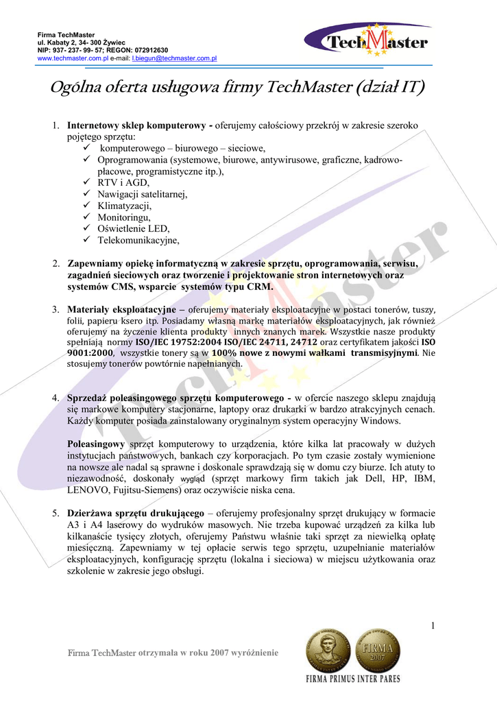 Firma TechMaster ul. Kabaty 2, 34- 300 Żywiec NIP: 937- 237- 99- 57; REGON: 072912630 www.techmaster.com.pl e-mail: [email protected] Ogólna oferta usługowa firmy TechMaster (dział IT) 1. Internetowy sklep komputerowy - oferujemy całościowy przekrój w zakresie szeroko pojętego sprzętu: komputerowego – biurowego – sieciowe, Oprogramowania (systemowe, biurowe, antywirusowe, graficzne, kadrowopłacowe, programistyczne itp.), RTV i AGD, Nawigacji satelitarnej, Klimatyzacji, Monitoringu, Oświetlenie LED, Telekomunikacyjne, 2. Zapewniamy opiekę informatyczną w zakresie sprzętu, oprogramowania, serwisu, zagadnień sieciowych oraz tworzenie i projektowanie stron internetowych oraz systemów CMS, wsparcie systemów typu CRM. 3. Materiały eksploatacyjne – oferujemy materiały eksploatacyjne w postaci tonerów, tuszy, folii, papieru ksero itp. Posiadamy własną markę materiałów eksploatacyjnych, jak również oferujemy na życzenie klienta produkty innych znanych marek. Wszystkie nasze produkty spełniają normy ISO/IEC 19752:2004 ISO/IEC 24711, 24712 oraz certyfikatem jakości ISO 9001:2000, wszystkie tonery są w 100% nowe z nowymi wałkami transmisyjnymi. Nie stosujemy tonerów powtórnie napełnianych. 4. Sprzedaż poleasingowego sprzętu komputerowego - w ofercie naszego sklepu znajdują się markowe komputery stacjonarne, laptopy oraz drukarki w bardzo atrakcyjnych cenach. Każdy komputer posiada zainstalowany oryginalnym system operacyjny Windows. Poleasingowy sprzęt komputerowy to urządzenia, które kilka lat pracowały w dużych instytucjach państwowych, bankach czy korporacjach. Po tym czasie zostały wymienione na nowsze ale nadal są sprawne i doskonale sprawdzają się w domu czy biurze. Ich atuty to niezawodność, doskonały wygląd (sprzęt markowy firm takich jak Dell, HP, IBM, LENOVO, Fujitsu-Siemens) oraz oczywiście niska cena. 5. Dzierżawa sprzętu drukującego – oferujemy profesjonalny sprzęt drukujący w formacie A3 i A4 laserowy do wydruków masowych. Nie trzeba kupować urządzeń za kilka lub kilkanaście tysięcy złotych, oferujemy Państwu właśnie taki sprzęt za niewielką opłatę miesięczną. Zapewniamy w tej opłacie serwis tego sprzętu, uzupełnianie materiałów eksploatacyjnych, konfigurację sprzętu (lokalna i sieciowa) w miejscu użytkowania oraz szkolenie w zakresie jego obsługi. 1 Firma TechMaster otrzymała w roku 2007 wyróżnienie Firma TechMaster ul. Kabaty 2, 34- 300 Żywiec NIP: 937- 237- 99- 57; REGON: 072912630 www.techmaster.com.pl e-mail: [email protected] 6. Serwis pogwarancyjny - naszym głównym zadaniem jest świadczenie szeroko pojętych usług związanych ze sprzętem komputerowym i drukującym, obejmującym naprawy m.in.: Komputerów stacjonarnych Monitorów Drukarek laserowych i atramentowych Laptopów Sprzętu audio-wideo Dokonujemy konserwacji i czyszczenia okresowego sprzętu drukującego Z poważaniem Leszek Biegun Specjalista ds. Obsługi Klienta TechMaster telefax (33)8611687 kom: 699290560 gg: 3252980 e-mail: [email protected] www.techmaster.com.pl g g : 3 2 5 2 9 8 0 2 Firma TechMaster otrzymała w roku 2007 wyróżnienie