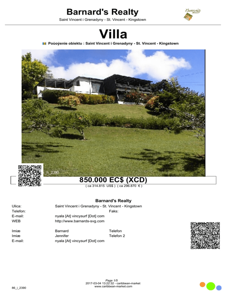 Barnard's Realty Saint Vincent i Grenadyny - St. Vincent - Kingstown Villa Poùoýenie obiektu : Saint Vincent i Grenadyny - St. Vincent - Kingstown 850.000 EC$ (XCD) ( ca 314.815 US$ ) ( ca 296.870 € ) Barnard's Realty Ulica: Telefon: E-mail: WEB Saint Vincent i Grenadyny - St. Vincent - Kingstown Faks: nyala [At] vincysurf [Dot] com http://www.barnards-svg.com Imiæ Imiæ E-mail: Barnard Jennifer nyala [At] vincysurf [Dot] com 86_i_2390 Telefon Telefon 2 Page 1/5 2017-03-04 13:22:32 - caribbean-market www.caribbean-market.com Barnard's Realty Saint Vincent i Grenadyny - St. Vincent - Kingstown Numer kodu Typ budynku Poùoýenie Materiaùy Property Address 86_i_2390 Villa Seafront Beton Queens Drive near Kingstown Numer kodu Nr referencyjny Status objektet Rok Powierzchnia dziaùki Firma Ýycie Kuchnia Sypialnie Zùy Opinie Toaleta 31853 m² Powierzchnia 1 1 3 3 Biznes Inne Usùugi Garaý Carport zadaszony taras Akcesoria Dzierýawa Taras Balkon Jetty Pokój Party Klimatyzacja Resort Ogród Pralnia Goràcy zadaszony taras ogrodzony / murem 86_i_2390 Page 2/5 2017-03-04 13:22:32 - caribbean-market www.caribbean-market.com po uzgodnieniu potrzebne Barnard's Realty Saint Vincent i Grenadyny - St. Vincent - Kingstown 86_i_2390 Page 3/5 2017-03-04 13:22:32 - caribbean-market www.caribbean-market.com Barnard's Realty Saint Vincent i Grenadyny - St. Vincent - Kingstown 86_i_2390 Page 4/5 2017-03-04 13:22:32 - caribbean-market www.caribbean-market.com Barnard's Realty Saint Vincent i Grenadyny - St. Vincent - Kingstown 86_i_2390 Page 5/5 2017-03-04 13:22:32 - caribbean-market www.caribbean-market.com