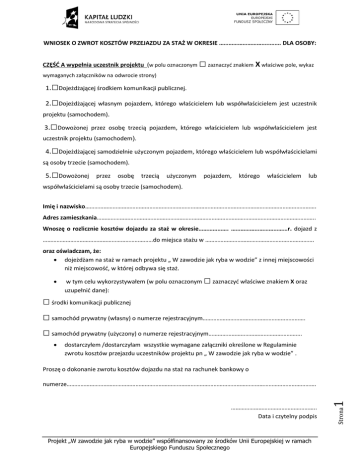 WNIOSEK O ZWROT KOSZTÓW PRZEJAZDU ZA STAŻ W OKRESIE …………………………..……. DLA OSOBY: CZĘŚĆ A wypełnia uczestnik projektu (w polu oznaczonym □ zaznaczyć znakiem X właściwe pole, wykaz wymaganych załączników na odwrocie strony) □Dojeżdżającej środkiem komunikacji publicznej. 2.□Dojeżdżającej własnym pojazdem, którego właścicielem lub współwłaścicielem jest uczestnik 1. projektu (samochodem). □Dowożonej przez osobę trzecią pojazdem, którego właścicielem lub współwłaścicielem jest 3. uczestnik projektu (samochodem). □Dojeżdżającej samodzielnie użyczonym pojazdem, którego właścicielem lub współwłaścicielami 4. są osoby trzecie (samochodem). □Dowożonej 5. przez osobę trzecią użyczonym pojazdem, którego właścicielem lub współwłaścicielami są osoby trzecie (samochodem). Imię i nazwisko……………………………………………………………………………………………………………………………………. Adres zamieszkania…………………………………………………………………………………………………………………………….. Wnoszę o rozlicznie kosztów dojazdu za staż w okresie………………. ………………………………r. dojazd z ………………………………………………………………do miejsca stażu w ……………………………………………….……………. oraz oświadczam, że: dojeżdżam na staż w ramach projektu „ W zawodzie jak ryba w wodzie” z innej miejscowości niż miejscowość, w której odbywa się staż. w tym celu wykorzystywałem (w polu oznaczonym uzupełnić dane): □ zaznaczyć właściwe znakiem X oraz □ środki komunikacji publicznej □ samochód prywatny (własny) o numerze rejestracyjnym…………………………………………………………. □ samochód prywatny (użyczony) o numerze rejestracyjnym……………………………………………………. dostarczyłem /dostarczyłam wszystkie wymagane załączniki określone w Regulaminie zwrotu kosztów przejazdu uczestników projektu pn „ W zawodzie jak ryba w wodzie” . Proszę o dokonanie zwrotu kosztów dojazdu na staż na rachunek bankowy o Projekt „W zawodzie jak ryba w wodzie” współfinansowany ze środków Unii Europejskiej w ramach Europejskiego Funduszu Społecznego Strona ……………………………………………….. Data i czytelny podpis 1 numerze………………………………………………………………………………………………………………………………………………. 1. Gdy uczestnik projektu dojeżdża środkiem komunikacji publicznej należy dołączyć: a) Bilety z trasy, na której podróżuje uczestnik (zwrot kosztów może być dokonany do wielokrotności tej kwoty). b) Zaświadczenie od przewoźnika publicznego środka transportu o koszcie przejazdu na danej trasie (załącznik nr 2 do „Regulaminu zwrotu kosztów przejazdu uczestników projektu „W zawodzie jak ryba w wodzie” na staż wakacyjny”). Projekt „W zawodzie jak ryba w wodzie” współfinansowany ze środków Unii Europejskiej w ramach Europejskiego Funduszu Społecznego Strona 3. Gdy uczestnik projektu jest dowożony przez osobę trzecią pojazdem, którego właścicielem lub współwłaścicielem jest uczestnik projektu (samochodem) należy dołączyć: a) Kserokopię prawa jazdy osoby dowożącej uczestnika projektu (poświadczona za zgodność z oryginałem). b) Kserokopię dowodu rejestracyjnego pojazdu uczestnika projektu (poświadczona za zgodność z oryginałem). c) Oświadczenie od przewoźnika publicznego środka transportu o najniższym koszcie przejazdu na danej trasie (załącznik nr 2 do „Regulaminu zwrotu kosztów przejazdu..”) d) Oświadczenie, opisujące sytuację uczestnika projektu, które potwierdza konieczność korzystania z takiej formy transportu (załącznik nr 4 do „Regulaminu zwrotu kosztów przejazdu…”) e) Oświadczenie osoby dowożącej o dowożeniu uczestnika na szkolenie (załącznik nr 3 do „Regulaminu zwrotu kosztów przejazdu…”) f) W przypadku, gdy uczestnik projektu jest współwłaścicielem pojazdu należy dołączyć oświadczenie użyczenia pojazdu podpisane przez drugiego współwłaściciela pojazdu (załącznik nr 6 do „Regulaminu zwrotu kosztów przejazdu…”) 2 2. Gdy uczestnik projektu dojeżdża własnym pojazdem, którego jest właścicielem lub współwłaścicielem należy dołączyć: a) Kserokopię prawa jazdy uczestnika projektu (poświadczona za zgodność z oryginałem). b) Kserokopię dowodu rejestracyjnego pojazdu uczestnika (poświadczona za zgodność z oryginałem). c) Oświadczenie od przewoźnika środka transportu o najniższym koszcie przejazdu na danej trasie (załącznik nr 2 do „Regulaminu zwrotu kosztów przejazdu…”) d) Oświadczenie opisujące sytuację uczestnika, które potwierdza konieczność skorzystania z takiej formy transportu (załącznik nr 4 do „Regulaminu zwrotu kosztów przejazdu…”) e) W przypadku, gdy uczestnik projektu jest współwłaścicielem pojazdu należy dołączyć oświadczenie użyczenia pojazdu podpisane przez drugiego współwłaściciela pojazdu (załącznik nr 6 do „Regulaminu zwrotu kosztów przejazdu…”) 4. Gdy uczestnik projektu dojeżdża samodzielnie użyczonym pojazdem, którego właścicielem lub współwłaścicielami są osoby trzecie (samochodem) należy dołączyć: a) Kserokopię prawa jazdy uczestnika projektu (poświadczona za zgodność z oryginałem). b) Kserokopię dowodu rejestracyjnego użyczonego pojazdu (poświadczona za zgodność z oryginałem). c) Oświadczenie od przewoźnika publicznego środka transportu o koszcie przejazdu na danej trasie (załącznik nr 2 do „Regulaminu zwrotu kosztów przejazdu…”) d) Oświadczenie, opisujące sytuację uczestnika projektu, które potwierdz