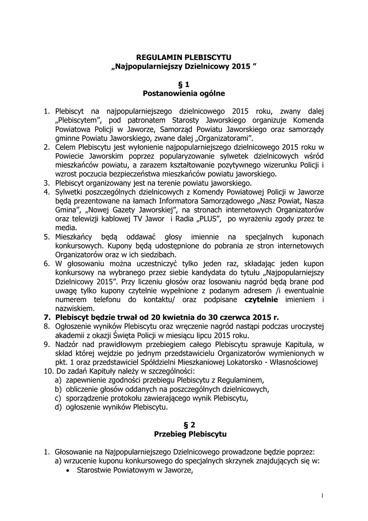 REGULAMIN PLEBISCYTU „Najpopularniejszy Dzielnicowy 2015 ” §1 Postanowienia ogólne 1. Plebiscyt na najpopularniejszego dzielnicowego 2015 roku, zwany dalej „Plebiscytem”, pod patronatem Starosty Jaworskiego organizuje Komenda Powiatowa Policji w Jaworze, Samorząd Powiatu Jaworskiego oraz samorządy gminne Powiatu Jaworskiego, zwane dalej „Organizatorami”. 2. Celem Plebiscytu jest wyłonienie najpopularniejszego dzielnicowego 2015 roku w Powiecie Jaworskim poprzez popularyzowanie sylwetek dzielnicowych wśród mieszkańców powiatu, a zarazem kształtowanie pozytywnego wizerunku Policji i wzrost poczucia bezpieczeństwa mieszkańców powiatu jaworskiego. 3. Plebiscyt organizowany jest na terenie powiatu jaworskiego. 4. Sylwetki poszczególnych dzielnicowych z Komendy Powiatowej Policji w Jaworze będą prezentowane na łamach Informatora Samorządowego „Nasz Powiat, Nasza Gmina”, „Nowej Gazety Jaworskiej”, na stronach internetowych Organizatorów oraz telewizji kablowej TV Jawor i Radia „PLUS”, po wyrażeniu zgody przez te media. 5. Mieszkańcy będą oddawać głosy imiennie na specjalnych kuponach konkursowych. Kupony będą udostępnione do pobrania ze stron internetowych Organizatorów oraz w ich siedzibach. 6. W głosowaniu można uczestniczyć tylko jeden raz, składając jeden kupon konkursowy na wybranego przez siebie kandydata do tytułu „Najpopularniejszy Dzielnicowy 2015”. Przy liczeniu głosów oraz losowaniu nagród będą brane pod uwagę tylko kupony czytelnie wypełnione z podanym adresem /i ewentualnie numerem telefonu do kontaktu/ oraz podpisane czytelnie imieniem i nazwiskiem. 7. Plebiscyt będzie trwał od 20 kwietnia do 30 czerwca 2015 r. 8. Ogłoszenie wyników Plebiscytu oraz wręczenie nagród nastąpi podczas uroczystej akademii z okazji Święta Policji w miesiącu lipcu 2015 roku. 9. Nadzór nad prawidłowym przebiegiem całego Plebiscytu sprawuje Kapituła, w skład której wejdzie po jednym przedstawicielu Organizatorów wymienionych w pkt. 1 oraz przedstawiciel Spółdzielni Mieszkaniowej Lokatorsko - Własnościowej 10. Do zadań Kapituły należy w szczególności: a) zapewnienie zgodności przebiegu Plebiscytu z Regulaminem, b) obliczenie głosów oddanych na poszczególnych dzielnicowych, c) sporządzenie protokołu zawierającego wynik Plebiscytu, d) ogłoszenie wyników Plebiscytu. §2 Przebieg Plebiscytu 1. Głosowanie na Najpopularniejszego Dzielnicowego prowadzone będzie poprzez: a) wrzucenie kuponu konkursowego do specjalnych skrzynek znajdujących się w: Starostwie Powiatowym w Jaworze, 1 Urzędach Miast: Jawor i Bolków, Urzędach Gmin: Męcinka, Paszowice, Wądroże Wielkie, Mściwojów, Spółdzielni Mieszkaniowej Lokatorsko-Własnościowej w Jaworze, Komendzie Powiatowej Policji w Jaworze, Komisariacie Policji w Bolkowie Redakcji „Nowej Gazety Jaworskiej” b) przesłanie kuponu na adres Starostwa Powiatowego w Jaworze, 59-400 Jawor, ul. Wrocławska 26. 2. Skrzynki do oddawania głosów przygotowane zostaną przez Starostwo Powiatowe w Jaworze i umieszczone w miejscach wyszczególnionych w § 2 pkt 1. 3. Po zakończeniu głosowania organizatorzy przekazują nienaruszone skrzynki do Starostwa Powiatowego w Jaworze, celem podliczenia przez Kapitułę oddanych głosów. §3 Nagrody 1. Dla trzech Policjantów – Dzielnicowych, którzy otrzymają w głosowaniu największą liczbę ważnie oddanych głosów przewidziane są nagrody. 2. Policjant – Dzielnicowy, który w głosowaniu uzyska najwięcej ważnie oddanych głosów zostanie Laureatem Plebiscytu i otrzyma tytuł „Najpopularniejszego Dzielnicowego 2015 roku”. 3. Nagrody zostaną ufundowane ze środków finansowych przekazanych przez samorząd powiatowy i samorządy gminne i wręczone podczas wspomnianej wyżej uroczystej akademii. 4. Wśród uczestników Plebiscytu zostaną wylosowane trzy nagrody rzeczowe ufundowane ze środków przekazanych przez samorząd powiatowy i samorządy gminne. 5. Losowanie nagród dla uczestników Plebiscytu odbędzie się również podczas akademii z okazji Święta Policji. §4 Postanowienia końcowe 1. Regulamin wchodzi w życie z dniem ogłoszenia Plebiscytu. Ogłoszenie zostanie opublikowane na stronach internetowych Organizatorów oraz w lokalnych mediach. 2. Organizatorzy zastrzegają sobie prawo dokonywania zmian w Regulaminie. 3. Wszelkie zmiany w Regulaminie będą niezwłocznie podlegały opublikowaniu. 4. W sprawach nieuregulowanych Regulaminem decyzje podejmuje Kapituła uwzględniając obowiązujące przepisy prawa. 2