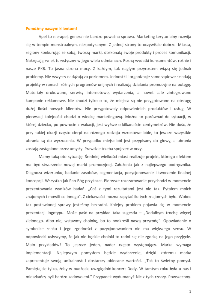 Pomóżmy naszym klientom! Apel to nie-apel, generalnie bardzo poważna sprawa. Marketing terytorialny rozwija się w tempie monstrualnym, niespotykanym. Z jednej strony to oczywiście dobrze. Miasta, regiony konkurując ze sobą, tworzą marki, doskonalą swoje produkty i proces komunikacji. Nakręcają rynek turystyczny w jego wielu odmianach. Rosną wydatki konsumentów, rośnie i nasze PKB. To jasna strona mocy. Z każdym, tak nagłym przyrostem wiążą się jednak problemy. Nie wszyscy nadążają za poziomem. Jednostki i organizacje samorządowe składają projekty w ramach różnych programów unijnych i realizują działania promocyjne na potęgę. Materiały drukowane, serwisy internetowe, wydarzenia, a nawet całe zintegrowane kampanie reklamowe. Nie chodzi tylko o to, że miejsca są nie przygotowane na obsługę dużej ilości nowych klientów. Nie przygotowały odpowiednich produktów i usług. W pierwszej kolejności chodzi o wiedzę marketingową. Można to porównać do sytuacji, w której dziecko, po powrocie z wakacji, jest wyższe o kilkanaście centymetrów. Nie dość, że przy takiej okazji często cierpi na różnego rodzaju wzrostowe bóle, to jeszcze wszystkie ubrania są do wyrzucenia. W przypadku miejsc ból jest przypisany do głowy, a ubrania zostają zastąpione przez umysły. Prawdzie trzeba spojrzeć w oczy. Mamy taką oto sytuację. Średniej wielkości miast realizuje projekt, którego efektem ma być stworzenie nowej marki promocyjnej. Założenia jak z najlepszego podręcznika. Diagnoza wizerunku, badanie zasobów, segmentacja, pozycjonowanie i tworzenie finalnej koncepcji. Wszystko jak Pan Bóg przykazał. Pierwsze rozczarowanie przychodzi w momencie prezentowania wyników badań. „Coś z tymi rezultatami jest nie tak. Pytałem moich znajomych i mówili co innego”. Z ciekawości można zapytać ilu tych znajomych było. Wobec tak postawionej sprawy jesteśmy bezradni. Kolejny problem pojawia się w momencie prezentacji logotypu. Może paść na przykład taka sugestia – „Dodałbym trochę więcej zielonego. Albo nie, wstawmy choinkę, bo to podkreśli naszą przyrodę”. Opowiadanie o symbolice znaku i jego zgodności z pozycjonowaniem nie ma większego sensu. W odpowiedzi usłyszymy, że jak nie będzie choinki to radni się nie zgodzą na jego przyjęcie. Mało przykładów? To jeszcze jeden, nader często występujący. Marka wymaga implementacji. Najlepszym pomysłem będzie wydarzenie, dzięki któremu marka zaprezentuje swoją unikalność i dostarczy obiecane wartości. „Tak to świetny pomysł. Pamiętajcie tylko, żeby w budżecie uwzględnić koncert Dody. W tamtym roku była u nas i mieszkańcy byli bardzo zadowoleni.” Przypadek wydumany? Nic z tych rzeczy. Powszechny. 1 Nie chciałbym przy tej okazji wytykać klientom samorządowym zarozumiałości i przekonania o własnej nieomylności. Jest to oczywiście przeszkoda, ale raczej nie główna. Rozwiązanie tego problemu leży po stronie usługodawców. Czy każdy z nas może w tym momencie swobodnie spojrzeć w lustro i rzucić kamieniem? Nie wydaje mi się. Pokusa zarobienia łatwych pieniędzy jest bardzo silna, a postawa odbiorców często jest dodatkowym usprawiedliwieniem. Przecież najważniejsze, żeby klient był zadowolony. Czy to nasza wina, że służby marketingowe miast nie dysponują odpowiednią wiedzą? Zresztą nie są jedyni. W obszarze przedsiębiorstw, szczególnie tych nie dużych, też zdarzają się takie przypadki. To wszystko prawda. Co więcej, moja doświadczenia szkoleniowe z pracownikami jednostek samorządowych jasno wskazują, że chęć zdobywania wiedzy zdecydowanie przegrywa zarówno z posiłkiem (standard unijny), jak i dowolnymi gadżetami typu długopis czy breloczek. Nie mówiąc już o magicznej godzinie 15.30, która powoduje pustki na sali. Każdy człowiek jest ułomny. W tym miejscu jedna ważna uwaga, żeby nie było. Nie twierdzę, że problem dotyczy wszystkich. Znam i współpracuję z przedstawicielami gmin i organizacji, których wiedza i umiejętności są bardzo wysokie. Moje sugestie nie dotyczą też, w większości, marketerów największych miast. Tam zazwyczaj wszystko jest w porządku. Pamiętajmy jednak, że mówimy o kategorii, w której, w sposób naturalny, grasuje tysiące klientów. Wspomniane przypadki potwierdzają jedynie regułę. Jest i aspekt dodatkowy. Polityczny. Budowanie marki miejsca to proces żmudny i wymagający cierpliwości. Na pewno dłuższy niż przeciętna kadencja burmistrza czy prezydenta. To jest niestety problem, bo perspektywa przeciętnego “władcy” gminy nie sięga dalej niż 4 lata wprzód. A w zasadzie dwa z kawałkiem, bo potem lepiej nic nie robić, żeby w coś nie wdepnąć. Dlatego na nośne i modne hasło w stylu “budujemy markę miasta” zainteresowani zawsze mówią zgodnie - TAK, byle szybko, najlepiej w tym miesiącu. Jeżeli włodarze zjednoczonej Europy naprawdę by nas lubili, najpierw przeznaczyliby pieniądze na edukację w zakresie marketingu terytorialnego, a nie kazali od razu realizować projekty promocyjne. Bo efekt jest taki, że rodzą się z tego wydarzenia kompletnie bezsensu. Bez pozytywnego wpływu na kapitał marki. Ale wszyscy się cieszą, bo pieniądze unijne wykorzystane i społeczność lokalna ma chwilę radości, a politycy chwały. Zresztą są tacy, którzy tworzą jednak marki w tempie błyskawicznym. Wygląda to tak: “Mamy markę” – ogłaszają władze gminy lub powiatu. Co to oznacza? Prosta sprawa. Najpewniej został właśnie rozstrzygnięty konkurs wśród lokalnych “grafików” na logo i hasło promocyjne. Nagrodą był zestaw DVD wartości 1 500 PLN. Tania sprawa ta marka. A to że społeczność lokalna zapytania o to cudo skieruje nas do najbliższego kantoru. Naprawdę nie ma znaczenia. Chyba władza wie lepiej. A najważniejsze, że konkurs udało się rozstrzygnąć przed wyborami. Będą punkty. 2 Skoro jednak nie możem
