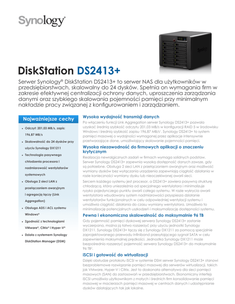 DiskStation DS2413+ Serwer Synology® DiskStation DS2413+ to serwer NAS dla użytkowników w przedsiębiorstwach, skalowalny do 24 dysków. Spełnia on wymagania firm w zakresie efektywnej centralizacji ochrony danych, uproszczenia zarządzania danymi oraz szybkiego skalowania pojemności pamięci przy minimalnym nakładzie pracy związanej z konfigurowaniem i zarządzaniem. Najważniejsze cechy ●● Odczyt: 201,03 MB/s, zapis: 196,87 MB/s ●● Skalowalność do 24 dysków przy użyciu Synology DX1211 ●● Technologia pasywnego chłodzenia procesora i nadmiarowość wentylatorów systemowych ●● Obsługa 2 sieci LAN z przełączaniem awaryjnym i agregacją łączy (Link Aggregation) ●● ●● Obsługa ADS i ACL systemu Po włączeniu funkcji Link Aggregation serwer Synology DS2413+ pozwala uzyskać średnią szybkość odczytu 201,03 MB/s w konfiguracji RAID 5 w środowisku Windows i średnią szybkość zapisu 196,87 MB/s1. Synology DS2413+ to system pamięci masowej o wydajności wymaganej przez aplikacje intensywnie przetwarzające dane, umożliwiający skalowanie pojemności pamięci. Wysoka niezawodność do firmowych aplikacji o znaczeniu krytycznym Realizacja newralgicznych zadań w firmach wymaga solidnych podstaw. Serwer Synology DS2413+ zapewnia wysoką dostępność danych zawsze, gdy są potrzebne. Obsługa 2 sieci LAN z przełączaniem awaryjnym oraz możliwość wymiany dysków bez wyłączania urządzenia zapewniają ciągłość działania w razie konieczności wymiany dysku lub nieoczekiwanej awarii sieci. Sercem każdego systemu jest procesor, a DS2413+ zawiera pasywną strukturę chłodzącą, która uniezależnia od specjalnego wentylatora i minimalizuje ryzyko pojedynczego punktu awarii całego systemu. W razie wykrycia awarii wentylatora wbudowany system nadmiarowości przyspiesza działanie wentylatorów funkcjonalnych w celu odpowiedniej wentylacji systemu i umożliwia ciągłość działania do czasu wymiany wentylatora. Umożliwia to minimalizację potencjalnych uszkodzeń i maksymalizację dostępności systemu. Windows® Pewna i ekonomiczna skalowalność do maksymalnie 96 TB Zgodność z technologiami Gdy pojemność pamięci dyskowej serwera Synology DS2413+ zostanie wyczerpana, można ją łatwo rozszerzyć przy użyciu jednostki Synology DX1211. Synology DS2413+ łączy się z Synology DX1211 za pomocą specjalnie zaprojektowanego przewodu Infiniband przesyłającego sygnał SATA w celu zapewnienia maksymalnej prędkości. Jednostka Synology DX1211 może bezpośrednio rozszerzyć pojemność serwera Synology DS2413+ do maksymalnie 96 TB2. VMware®, Citrix® i Hyper-V® ●● Wysoka wydajność transmisji danych Działa z systemem Synology DiskStation Manager (DSM) iSCSI i gotowość do wirtualizacji Dzięki obsłudze protokołu iSCSI w systemie DSM serwer Synology DS2413+ stanowi bezproblemowe rozwiązanie pamięci masowej dla serwerów wirtualizacji, takich jak VMware, Hyper-V i Citrix. Jest to doskonała alternatywa dla sieci pamięci masowych (SAN) do zastosowań w przedsiębiorstwach. Ekonomiczny interfejs iSCSI umożliwia użytkownikom z małych i średnich firm konsolidowanie pamięci masowej w macierzach pamięci masowej w centrach danych i udostępnianie dysków działających tak jak lokalne. Dopasowanie do środowiska biznesowego Integracja z usługą Windows ADS oraz LDAP umożliwia szybkie i proste wdrożenie serwera Synology DS2413+ w sieciowym środowisku biznesowym bez konieczności ponownego tworzenia kont użytkowników na serwerze Synology DS2413+. Funkcja folderu domowego użytkownika minimalizuje nakład pracy administratora potrzebnej do utworzenia prywatnych folderów udostępnionych dla wielu użytkowników. Rysunek 1) Współdziałanie ze środowiskiem w przedsiębiorstwie DS2413+ płynnie współdziała z domenami przedsiębiorstwa, wykorzystując dotychczasowe poświadczenia użytkowników. Obsługa protokołu Windows ACL w modelu DS2413+ zapewnia znacznie bardziej precyzyjną kontrolę dostępu i skuteczniejsze ustawienia uprawnień, umożliwiające informatykom ustawianie uprawnień do plików i folderów na serwerze DS2413+ za pomocą znanego interfejsu użytkownika systemu Windows. Uprawnienia w usłudze ACL systemu Windows zostaną zastosowane do wszystkich kanałów dostępu, w tym AFP, FTP, File Station, NFS i WebDAV. Bezpieczne uprawnienia zapewniają spokój i brak zagrożenia w postaci luk. Wszechstronne aplikacje biznesowe Synology DiskStation DS2413+ działa z cenionym, wielozadaniowym systemem operacyjnym Synology DiskStation Manager (DSM). Model DS2413+ oferuje wszechstronną kolekcję aplikacji biznesowych. Działające aplikacje można wybrać stosownie do wymagań środowiska firmowego. DS2413+ zastępuje kilka różnych tradycyjnych urządzeń sieciowych i udostępnia zaawansowane funkcje przeznaczone specjalnie dla grup roboczych i biur, takie jak ochrona antywirusowa, monitoring wideo, poczta e-mail dostępna w przeglądarce internetowej, VPN i usługi katalogowe LDAP. Aplikacjami zarządza się w Centrum pakietów — jest to portal udostępniający aplikacje w postaci gotowych do użycia pakietów. Rozwiązanie to zapewnia wysoki stopień integracji oprogramowania i umożliwia prostą instalację jednym kliknięciem. DS2413+ może być hostem dodatkowych, zatwierdzonych aplikacji internetowych PHP innych producentów, takich jak system zarządzania treścią, system zarządzania relacjami z klientami i system handlu elektronicznego. Umożliwia to funkcja Web Station z obsługą zawartości internetowej PHP/ MySQL®. Energooszczędna konstrukcja Serwer Synology DS2413+ został zaprojektowany i skonstruowany ze zwróceniem szczególnej uwagi na efektywne zużycie energii. W porównaniu z typowymi serwerami o przeciętnej pojemności serwer DS2413+ zużywa stosunkowo mało energii. Obsługa funkcji Wake On LAN/WAN i zaplanowanego włączania oraz wyłączania pozwala dodatkowo obniżyć zużycie en