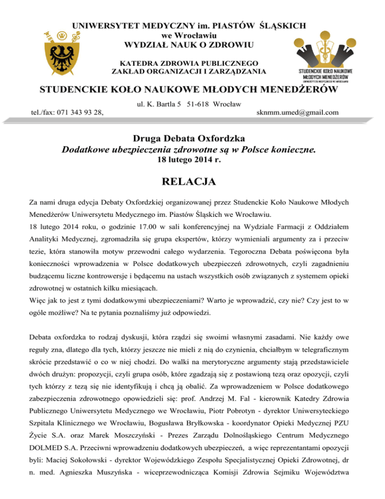 UNIWERSYTET MEDYCZNY im. PIASTÓW ŚLĄSKICH we Wrocławiu WYDZIAŁ NAUK O ZDROWIU KATEDRA ZDROWIA PUBLICZNEGO ZAKŁAD ORGANIZACJI I ZARZĄDZANIA STUDENCKIE KOŁO NAUKOWE MŁODYCH MENEDŻERÓW ul. K. Bartla 5 51-618 Wrocław tel./fax: 071 343 93 28, [email protected] Druga Debata Oxfordzka Dodatkowe ubezpieczenia zdrowotne są w Polsce konieczne. 18 lutego 2014 r. RELACJA Za nami druga edycja Debaty Oxfordzkiej organizowanej przez Studenckie Koło Naukowe Młodych Menedżerów Uniwersytetu Medycznego im. Piastów Śląskich we Wrocławiu. 18 lutego 2014 roku, o godzinie 17.00 w sali konferencyjnej na Wydziale Farmacji z Oddziałem Analityki Medycznej, zgromadziła się grupa ekspertów, którzy wymieniali argumenty za i przeciw tezie, która stanowiła motyw przewodni całego wydarzenia. Tegoroczna Debata poświęcona była konieczności wprowadzenia w Polsce dodatkowych ubezpieczeń zdrowotnych, czyli zagadnieniu budzącemu liczne kontrowersje i będącemu na ustach wszystkich osób związanych z systemem opieki zdrowotnej w ostatnich kilku miesiącach. Więc jak to jest z tymi dodatkowymi ubezpieczeniami? Warto je wprowadzić, czy nie? Czy jest to w ogóle możliwe? Na te pytania poznaliśmy już odpowiedzi. Debata oxfordzka to rodzaj dyskusji, która rządzi się swoimi własnymi zasadami. Nie każdy owe reguły zna, dlatego dla tych, którzy jeszcze nie mieli z nią do czynienia, chciałbym w telegraficznym skrócie przedstawić o co w niej chodzi. Do walki na merytoryczne argumenty stają przedstawiciele dwóch drużyn: propozycji, czyli grupa osób, które zgadzają się z postawioną tezą oraz opozycji, czyli tych którzy z tezą się nie identyfikują i chcą ją obalić. Za wprowadzeniem w Polsce dodatkowego zabezpieczenia zdrowotnego opowiedzieli się: prof. Andrzej M. Fal - kierownik Katedry Zdrowia Publicznego Uniwersytetu Medycznego we Wrocławiu, Piotr Pobrotyn - dyrektor Uniwersyteckiego Szpitala Klinicznego we Wrocławiu, Bogusława Bryłkowska - koordynator Opieki Medycznej PZU Życie S.A. oraz Marek Moszczyński - Prezes Zarządu Dolnośląskiego Centrum Medycznego DOLMED S.A. Przeciwni wprowadzeniu dodatkowych ubezpieczeń, a więc reprezentantami opozycji byli: Maciej Sokołowski - dyrektor Wojewódzkiego Zespołu Specjalistycznej Opieki Zdrowotnej, dr n. med. Agnieszka Muszyńska - wiceprzewodnicząca Komisji Zdrowia Sejmiku Województwa Dolnośląskiego i asystent w Zakładzie Alergologii w Katedrze Zdrowia Publicznego Uniwersytetu Medycznego we Wrocławiu, dr n. med. Jacek Klakocar - Dolnośląski Państwowy Wojewódzki Inspektor Sanitarny we Wrocławiu oraz dr Maciej Biardzki - Prezes Milickiego Centrum Medycznego sp. z o.o Każda strona debaty ma 45 minut na wygłoszenie swoich argumentów. Podział czasu pomiędzy poszczególnych członków drużyn jest narzucony odgórnie i wygląda następująco: 15 minut dostaje kapitan drużyny, a po 10 minut przypada na każdego członka ekip propozycji i opozycji. Nad dyskusją propozycji i opozycji czuwa marszałek, który dba o przestrzeganie dyscypliny czasowej i zachowanie kolejności wypowiedzi poszczególnych uczestników debaty. W tę rolę wcielił się dr Piotr Karniej - prodziekan ds. studentów Uniwersytetu Medycznego we Wrocławiu. W debacie oxfordzkiej bardzo dużą rolę odgrywa publiczność, której ostateczny werdykt decyduje o tym, czy zwyciężyli broniący tezy, czy jej oponenci. Ocenie powinna podlegać nie teza, ale argumenty i sztuka oratorska prezentowana przez obie strony. Widzowie głosują poprzez zajęcie odpowiedniego miejsca na sali, która podzielona jest na część zwolenników propozycji i opozycji. Znamy już reguły, którym podlega debata oxfordzka, wiemy kto reprezentuje poszczególne drużyny, pozostaje nam zatem usiąść głęboko w fotelach, zapiąć pasy i wskoczyć w wir argumentów za i przeciw konieczności wprowadzenia dodatkowych ubezpieczeń zdrowotnych w Polsce. „Jak nie wiadomo o co chodzi, to oczywiście chodzi o kasę” - prof. Andrzej M. Fal Po krótkim wprowadzeniu Marszałka Debaty, dr Piotra Karnieja, głos zabrał kapitan propozycji, prof. Andrzej Fal. Swoje piętnastominutowe wystąpienie rozpoczął od postawienia bardzo wywrotowej, w odbiorze społeczeństwa, tezy, że w Polsce nie istnieją kolejki do lekarzy. Według Profesora, ludzie ustawiają się w kolejki do pieniędzy, którymi dysponuje system opieki zdrowotnej i za pomocą których finansowane są usługi medyczne. - Mimo tego, co słyszymy w mediach, w Polsce nie ma kolejek do lekarzy. Kolejki są do pieniędzy. W systemie opieki zdrowotnej towarem deficytowym nie są lekarze, a pieniądze, za które można by sfinansować usługi świadczone przez lekarzy - mówi prof. Fal. Zdaniem kierownika Katedry Zdrowia Publicznego na Wrocławskim Uniwersytecie Medycznym żaden system ochrony zdrowia na świecie nie jest odpowiednio dofinansowany. Również NFZ nie dysponuje odpowiednią ilością środków, mimo że pula pieniężna płatnika z roku na rok się powiększa. Prof. Fal przekonuje, że wzrost składki zdrowotnej nie pomoże poprawić sytuacji naszego systemu i że konieczne jest wprowadzenie dodatkowego strumienia przepływu pieniądza. Tego typu rozwiązaniem mogłyby być fundusze pochodzące z dodatkowych ubezpieczeń zdrowotnych. - Budżet NFZ w ciągu ostatnich 10 lat wzrósł ponad dwukrotnie. Jednak pieniędzy wciąż brakuje i nie jest to żaden ewenement w skali światowej. Nawet w krajach bardziej rozwiniętych taka sytuacja ma miejsce. Zwiększenie składki zdrowotnej nie spowoduje poprawy sytuacji polskiego systemu, a wręcz przeciwnie, może mu zaszkodzić. Wprowadzenie nowego strumienia przepływu pieniądza może pomóc. Tego typu zastrzykiem finansowym może być wprowadzenie dodatkowych ubezpieczeń zdrowotnych - kontynuuje profesor Uniwersytetu Medycznego. Powiększenie zasobów pieniężnych w systemie opieki zdrowotnej dzięki wprowadzeniu dodatkowych ubezpieczeń zdrowotnych