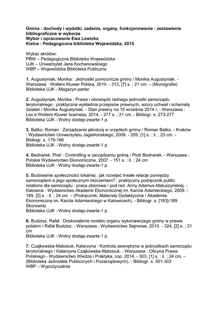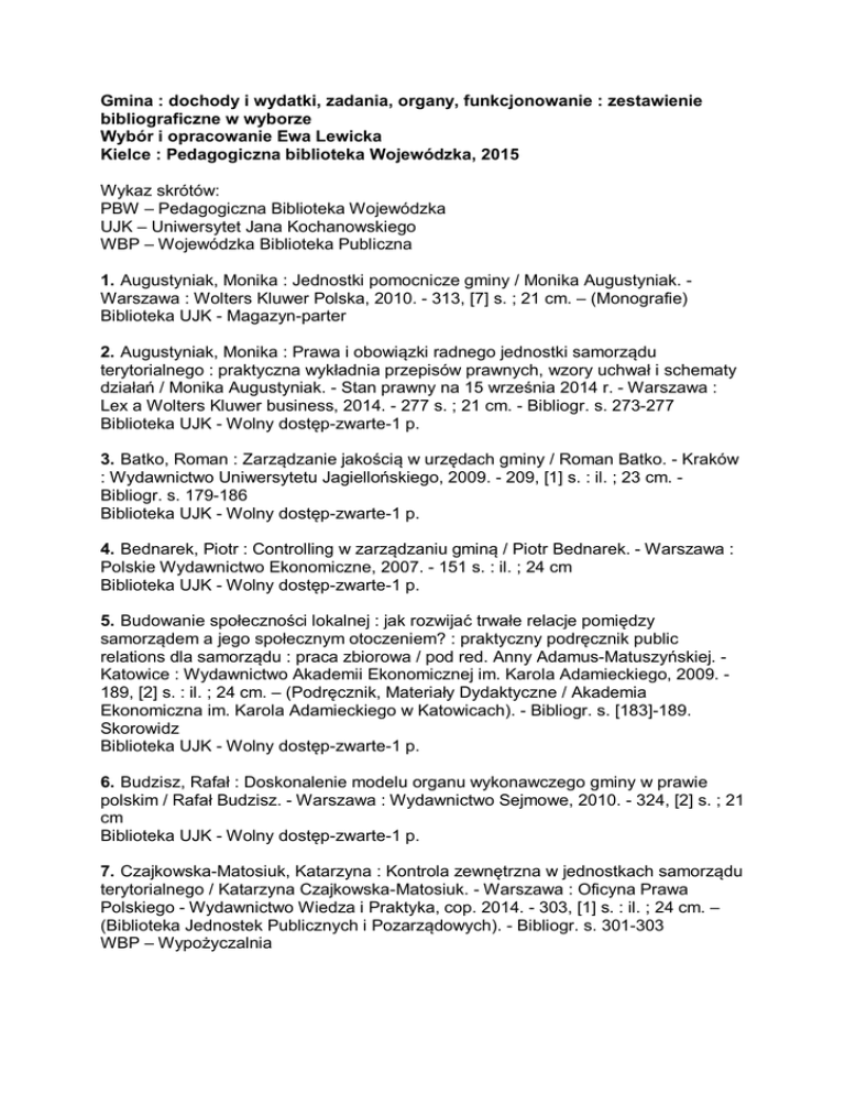 Gmina : dochody i wydatki, zadania, organy, funkcjonowanie : zestawienie bibliograficzne w wyborze Wybór i opracowanie Ewa Lewicka Kielce : Pedagogiczna biblioteka Wojewódzka, 2015 Wykaz skrótów: PBW – Pedagogiczna Biblioteka Wojewódzka UJK – Uniwersytet Jana Kochanowskiego WBP – Wojewódzka Biblioteka Publiczna 1. Augustyniak, Monika : Jednostki pomocnicze gminy / Monika Augustyniak. Warszawa : Wolters Kluwer Polska, 2010. - 313, [7] s. ; 21 cm. – (Monografie) Biblioteka UJK - Magazyn-parter 2. Augustyniak, Monika : Prawa i obowiązki radnego jednostki samorządu terytorialnego : praktyczna wykładnia przepisów prawnych, wzory uchwał i schematy działań / Monika Augustyniak. - Stan prawny na 15 września 2014 r. - Warszawa : Lex a Wolters Kluwer business, 2014. - 277 s. ; 21 cm. - Bibliogr. s. 273-277 Biblioteka UJK - Wolny dostęp-zwarte-1 p. 3. Batko, Roman : Zarządzanie jakością w urzędach gminy / Roman Batko. - Kraków : Wydawnictwo Uniwersytetu Jagiellońskiego, 2009. - 209, [1] s. : il. ; 23 cm. Bibliogr. s. 179-186 Biblioteka UJK - Wolny dostęp-zwarte-1 p. 4. Bednarek, Piotr : Controlling w zarządzaniu gminą / Piotr Bednarek. - Warszawa : Polskie Wydawnictwo Ekonomiczne, 2007. - 151 s. : il. ; 24 cm Biblioteka UJK - Wolny dostęp-zwarte-1 p. 5. Budowanie społeczności lokalnej : jak rozwijać trwałe relacje pomiędzy samorządem a jego społecznym otoczeniem? : praktyczny podręcznik public relations dla samorządu : praca zbiorowa / pod red. Anny Adamus-Matuszyńskiej. Katowice : Wydawnictwo Akademii Ekonomicznej im. Karola Adamieckiego, 2009. 189, [2] s. : il. ; 24 cm. – (Podręcznik, Materiały Dydaktyczne / Akademia Ekonomiczna im. Karola Adamieckiego w Katowicach). - Bibliogr. s. [183]-189. Skorowidz Biblioteka UJK - Wolny dostęp-zwarte-1 p. 6. Budzisz, Rafał : Doskonalenie modelu organu wykonawczego gminy w prawie polskim / Rafał Budzisz. - Warszawa : Wydawnictwo Sejmowe, 2010. - 324, [2] s. ; 21 cm Biblioteka UJK - Wolny dostęp-zwarte-1 p. 7. Czajkowska-Matosiuk, Katarzyna : Kontrola zewnętrzna w jednostkach samorządu terytorialnego / Katarzyna Czajkowska-Matosiuk. - Warszawa : Oficyna Prawa Polskiego - Wydawnictwo Wiedza i Praktyka, cop. 2014. - 303, [1] s. : il. ; 24 cm. – (Biblioteka Jednostek Publicznych i Pozarządowych). - Bibliogr. s. 301-303 WBP – Wypożyczalnia 8. Czołpińska, Ewa : Budżet i wieloletnia prognoza finansowa jednostek samorządu terytorialnego : od projektu do sprawozdania : praca zbiorowa / pod red. Joanny M. Salachny ; [aut. Ewa Czołpińska, Anna Ostrowska, Joanna M. Salachna]. - Gdańsk : Ośrodek Doradztwa i Doskonalenia Kadr, 2010. - 408 s. ; 24 cm + 1 dysk optyczny (CD-ROM). - Bibliogr. s. 405-408 WBP – Czytelnia, wypożyczalnia 9. Demokracja bezpośrednia w samorządzie terytorialnym / pod red. Marii Marczewskiej-Rytko i Stanisława Michałowskiego. - Lublin : Wydawnictwo Uniwersytetu Marii Curie-Skłodowskiej, 2012. - 466 s. : il. ; 24 cm. - Bibliogr. s. 450458 Biblioteka UJK - Wolny dostęp-zwarte-1 p. 10. Dolnicki, Bogdan : Samorząd terytorialny / Bogdan Dolnicki. - 4. wyd., stan prawny na 1 marca 2009 r. - Warszawa : Wolters Kluwer Polska, 2009. - 418 s. ; 24 cm. – (Seria Akademicka) 11. WBP – Wypożyczalnia 12. Doświadczenia i perspektywy rozwoju samorządu terytorialnego i zawodowego / red. nauk. Paweł Antkowiak. - Toruń : Wydawnictwo Adam Marszałek, 2014. - 210 s. : il. ; 23 cm. – (Polska i Europa Wobec Wyzwań Współczesnego Świata). - Bibliogr. przy rozdz. Biblioteka UJK - Wolny dostęp-zwarte-1 p. 13. Dziekański, Paweł : Marketing terytorialny : gmina i jej promocja = Teritorial marketing : gmina and its promotion / Paweł Dziekański, Antoni Olak, Sylwia Pytka. Koszyce : Multiprint ; Ostrowiec Świętokrzyski : Wyższa Szkoła Biznesu i Przedsiębiorczości, 2014. - 197, [1] s. : il. (w tym kolor.) ; 24 cm. - Bibliogr. s. 182191 Biblioteka UJK - Wolny dostęp-zwarte-1 p. 14. Encyklopedia samorządu terytorialnego dla każdego. Cz. 1, Ustrój / red. nauk. Małgorzata Stahl, Barbara Jaworska-Dębska. - Warszawa : Difin, 2010. - 310 s. ; 23 cm. Sygn. 248831 Czytelnia PBW 15. Encyklopedia samorządu terytorialnego dla każdego. Cz. 2, Zadania i kompetencje / red. nauk. Małgorzata Stahl, Barbara Jaworska-Dębska. - Warszawa : Difin, 2011. - 310 s. ; 23 cm Sygn. 249951 Czytelnia PBW 16. Fic, Daniel : Problemy zarządzania w samorządzie terytorialnym : aspekty instytucjonalizacji poza schematem / Daniel Fic. - Zielona Góra : Oficyna Wydawnicza Uniwersytetu Zielonogórskiego, 2011. - 426 s. : il. (w tym kolor.) ; 25 cm. - Bibliogr. s. 409-423 Biblioteka UJK - Wolny dostęp-zwarte-1 p. 17. Finanse w zarządzaniu rozwojem lokalnym / red. Joanna M. Salachna ; [aut. Leonard Etel et al.]. - Białystok : Białostocka Fundacja Kształcenia Kadr, 2009. - 235 s. : il. ; 24 cm. – (Kompetentna Gmina). - Bibliogr. s. 231-235 WBP – Wypożyczalnia 18. Finansowanie samorządu gminnego : studia przypadków / Sławomira Kańduła (red.). - Warszawa : CeDeWu Wydawnictwa Fachowe, 2012. - 145 s. : il. ; 24 cm. Bibliogr. przy rozdz. Sygn. 255537 : książka w opracowaniu PBW Sygn. 255538 : książka w opracowaniu PBW 19. Fogel, Piotr : Wskaźniki oceny polityki i gospodarki przestrzennej w gminach = Indicators of evaluation spatial policy and spatial management on local community level / Piotr Fogel. - Warszawa : Komitet Przestrzennego Zagospodarowania Kraju PAN, 2012. - 285, [11] s. , il. ; 21 cm. – (Biuletyn / Polska Akademia Nauk. Komitet Przestrzennego Zagospodarowania Kraju, ISSN 0079-3493 ; Z. 250). - Bibliogr. s. 261-[275] Biblioteka UJK - Wolny dostęp-czasopisma-2 p. 20. Formy współdziałania jednostek samorządu terytorialnego / red. nauk. Bogdan Dolnicki. -Stan prawny na 1 września 2012 r. - Warszawa : Wolters Kluwer Polska, 2012. - 567 s. : il. ; 21 cm. – (Monografie Lex) WBP – Wypożyczalnia 21. Gawroński, Henryk : Zarządzanie strategiczne w samorządach lokalnych / Henryk G