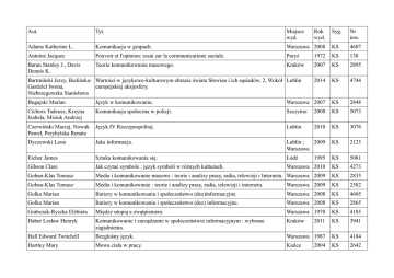 Aut. Tyt. Miejsce wyd. Adams Katherine L. Komunikacja w grupach. Antoine Jacques Baran Stanley J., Davis Dennis K. Syg. Nr inw. Warszawa 2008 KS 4607 Pouvoir et l'opinion: essai sur la communicatione sociale. Paryż 1972 KS 138 Teorie komunikowania masowego. Kraków 2007 KS 2895 2014 KS 4744 Bartmiński Jerzy, Bielińska- Wartości w językowo-kulturowym obrazie świata Słowian i ich sąsiadów. 2, Wokół Lublin Gardziel Iwona, europejskiej aksjosfery. Niebrzegowska Stanisława Rok wyd. Bugajski Marian Język w komunikowaniu. Warszawa 2007 KS 2848 Cichorz Tadeusz, Krzyna Izabela, Misiuk Andrzej Komunikacja społeczna w policji. Szczytno 2000 KS 5073 Czerwiński Maciej, Nowak Paweł, Przybylska Renata Język IV Rzeczpospolitej. Lublin 2010 KS 3076 Dyczewski Leon Jaka informacja. Lublin ; 2009 Warszawa KS 2125 Eicher James Sztuka komunikowania się. Łódź 1995 KS 5081 Gibson Clare Jak czytać symbole : język symboli w różnych kulturach. Warszawa 2010 KS 4273 Goban-Klas Tomasz Media i komunikowanie masowe : teorie i analizy prasy, radia, telewizji i Internetu. Warszawa 2009 KS 2835 Goban-Klas Tomasz Media i komunikowanie : teorie i analizy prasy, radia, telewizji i internetu. Warszawa 2009 KS 2582 Golka Marian Bariery w komunikowaniu i społeczeństwo (dez)informacyjne. Warszawa 2008 KS 4605 Golka Marian Bariery w komunikowaniu i społeczeństwo (dez) informacyjne. Warszawa 2008 KS 2865 Grabczak-Ryszka Elżbieta Między utopią a zwątpieniem. Warszawa 1970 KS 4185 Haber Lesław Henryk Komunikowanie i zarządzanie w społeczeństwie informacyjnym : wybrane zagadnienia. Kraków 2011 KS 3941 Hall Edward Twitchell Bezgłośny język. Warszawa 1987 KS 4184 Hartley Mary Mowa ciała w pracy. Kielce KS 2642 2004 Hartley Peter Komunikowanie interpersonalne. Wrocław 2006 KS 4574 Hess Agnieszka, Szymańska Pomost medialny : rola mediów w międzynarodowej komunikacji politycznej na Agnieszka przykładzie relacji polsko-niemieckich. Kraków 2009 KS 2030 Jan Paweł II O środkach komunikacji społecznej. Warszawa 1989 KS 2783 Karwatowska Małgorzata, Siwiec Adam Przeobrażenia w języku i komunikacji medialnej na przełomie XX i XXI wieku. Lublin 2010 KS 3991 Knapp Mark L. Komunikacja niewerbalna w interakcjach międzyludzkich. Wrocław [2008 KS ] 5012 Kocójowa Maria Zarządzanie i komunikowanie : tendencje rozwoju badań naukowych u progu XXI Kraków wieku. 1999 KS 2634 Kossecki Józef Granice manipulacji. Warszawa 1984 KS 2524 Leathers Dale G. Komunikacja niewerbalna : zasady i zastosowania. Warszawa 2009 KS 2914 McLuhan Marshall Wybór tekstów. Poznań 2001 KS 3671 McQuail Denis Sociology of mass communications : selected readings. Harmonds 1972 worth [etc.] KS 3499 McQuail Denis Teoria komunikowania masowego. Warszawa 2007 KS 2863 Mikułowski-Pomorski Jerzy, Valeriana : eseje o komunikowaniu między ludźmi. Bajka Zbigniew Kraków 1996 KS 2758 Morreale S. P., Spitzberg B. Komunikacja między ludźmi : motywacja, wiedza i umiejętności. H., Barge J. K. Warszawa 2011 KS 2913 Nęcki Zbigniew Kraków 1996 KS 5078 Niezgoda Marian, Com.unikowanie w zmieniającym się społeczeństwie. Świątkiewicz-Mośny Maria, Wagner Aleksandra Kraków 2010 KS 3943 Noga Henryk Modele komunikacji w procesie edukacyjnym : na przykładzie kształcenia ogólnotechnicznego. Kraków 2010 KS 2493 Ollivier Bruno Nauki o komunikacji : teoria i praktyka. Warszawa 2010 KS 3555 Komunikacja międzyludzka. Peeters Marguerite A. Globalizacja zachodniej rewolucji kulturowej : kluczowe pojęcia, mechanizmy działania. Warszawa 2010 KS 2024 Piasecka - Ostrowska Hanna Komunikatorzy : wpływ, wrażenie, wizerunek. Warszawa 2000 ; Bydgoszcz KS 2781 Piechota Magdalena, Stachyra Grażyna , Nowak Paweł Rozrywka w mediach i komunikacji społecznej: wybrane zagadnienia. Lublin 2012 KS 3075 Pisarek Walery Wstęp do nauki o komunikowaniu. Warszawa 2008 KS 4044 Pisarek Walery Wstęp do nauki o komunikowaniu. Warszawa 2008 KS 3554 Pisarek Walery O mediach i języku. Kraków 2007 KS 2614 Pisarek Walery Nowa retoryka dziennikarska. Kraków 2002 KS 2578 Pleszczyński Jan Epistemologia komunikacji medialnej : perspektywa ewolucyjna. Lublin 2013 KS 4057 Podkowińska Monika Komunikacja społeczna : tendencje, problemy, wyzwania. Warszawa 2014 KS 5057 Ranew-Sikora Dorota Analiza konwersacyjna jako metoda badania rozmów codziennych. Warszawa 2007 KS 3022 Rutkowski Mariusz, Naruszewicz-Duchlińska Alina Nowe zjawiska w języku tekście i komunikacji. Olsztyn 2006 KS 1955 Sajna Radosław Media w hispanoameryce w perspektywie komunikowania globalnego. Bydgoszcz 2013 KS 4392 Siciński Andrzej Technika a społeczeństwo : antologia. 2. Warszawa 1974 KS 4187 Siciński Andrzej Technika a społeczeństwo : antologia. 1. Warszawa 1974 KS 4186 Skowronek Bogusław Mediolingwistyka : wprowadzenie. Kraków 2013 KS 4051 Stasiuk-Krajewska Karina, Graszewicz Marek Literatura, kultura, komunikacja : księga pamiątkowa ku czci profesora Jerzego Jastrzębskiego w 60. rocznicę urodzin. Wrocław 2006 KS 2280 Steciąg Magdalena Norma a komunikacja. Wrocław 2009 KS 3273 Stewart John Robert Mosty zamiast murów : podręcznik komunikacji interpersonalnej. Warszawa 2012 KS 4606 Lublin KS 3045 Stępnik Krzysztof, Rajewski Komunikowanie się Polaków w latach 1944-1989. 2011 Maciej Stępnik Krzysztof, Rajewski Komunikowanie i komunikacja w dwudziestoleciu międzywojennym. Maciej Lublin 2010 KS 3011 Szostok Patrycja Komunikowanie lokalne w Polsce : o instrumentach polityki komunikacyjnej samorządów. Katowice 2013 KS 4525 Szwed Robert, Dyczewsk Leon, Szulich-Kałuża Justyna Tożsamość i komunikacja. Lublin 2011 KS 3918 Trzcińska Walentyna Skuteczne komunikowanie w administracji publicznej. Szczytno 2011 KS 4713 Wolny-Zmorzyński Kazimierz Komunikacja wizualna w prasie i w mediach elektronicznych. Warszawa 2013 KS 3993
