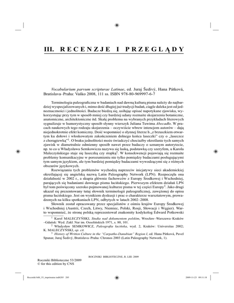 III. R E C E N Z J E I P R Z E G L Ą D Y Vocabularium parvum scripturae Latinae, ed. Juraj Šedivý, Hana Pátková, Bratislava–Praha: Vaško 2008, 111 ss. ISBN 978-80-969997-6-7 Terminologia paleograficzna w badaniach nad dawną kulturą pisma należy do najbardziej wyspecjalizowanych i, mimo dość długiej już tradycji badań, ciągle daleka jest od jednoznaczności i jednolitości. Badacze biedzą się, usiłując opisać napotykane zjawiska, wykorzystując przy tym w sposób mniej czy bardziej udany rozmaite skojarzenia botaniczne, anatomiczne, architektoniczne itd. Skalę problemu na wybranych przykładach literowych sygnalizuje w humorystyczny sposób słynny wierszyk Juliana Tuwima Abecadło. W pracach naukowych tego rodzaju skojarzenia – oczywiście wbrew intencjom autorów – dają niejednokrotnie efekt komiczny. Dość wspomnieć o słynnej literze h „z brzuszkiem otwartym ku dołowi i włoskowatym zakończeniem dolnego końca laseczki” czy o „laseczce z chorągiewką”1. O braku jednolitości może świadczyć chociażby określanie tych samych zjawisk w diametralnie odmienny sposób nawet przez badaczy o uznanym autorytecie, np. to co u Władysława Semkowicza nazywa się laską, podstawką czy szeryfem, u Karola Maleczyńskiego staje się laseczką czy stopką2. W konsekwencji pojawiają się rozmaite problemy komunikacyjne w porozumieniu nie tylko pomiędzy badaczami posługującymi tym samym językiem, ale tym bardziej pomiędzy badaczami wywodzącymi się z różnych obszarów językowych. Rozwiązaniu tych problemów wychodzą naprzeciw inicjatywy sieci akademickiej określającej się angielską nazwą Latin Paleography Network (LPN). Rozpoczęła ona działalność w 2002 r., a skupia głównie fachowców z Europy Środkowej i Wschodniej, parających się badaniami dawnego pisma łacińskiego. Pierwszym efektem działań LPN był tom poświęcony szeroko pojmowanej kulturze pisma w tej części Europy3. Jako drugi ukazał się prezentowany tutaj słownik terminologii paleograficznej, zawężonej do opisu pisma łacińskiego. Jest on wynikiem dyskusji i prac o charakterze warsztatowym, prowadzonych na kilku spotkaniach LPN, odbytych w latach 2002–2008. Słownik został opracowany przez specjalistów z ośmiu krajów Europy Środkowej i Wschodniej (Austrii, Czech, Litwy, Niemiec, Polski, Rosji, Słowacji i Węgier). Warto wspomnieć, że stronę polską reprezentował znakomity kodykolog Edward Potkowski 1 Karol MALECZYŃSKI, Studia nad dokumentem polskim, Wrocław–Warszawa–Kraków –Gdańsk: Wyd. Zakł. Nar im. Ossolińskich 1971, s. 80, 101. 2 Władysław SEMKOWICZ, Paleografia łacińska, wyd. 2, Kraków: Universitas 2002; K. MALECZYŃSKI, op. cit. 3 History of Written Culture in the “Carpatho-Danubian” Region I, ed. Hana Pátková, Pavel Spunar, Juraj Šedivý, Bratislava–Praha: Chronos 2003 (Latin Paleography Network, 1). Roczniki Biblioteczne 53/2009 © for this edition by CNS Roczniki bibl_53_imprimatur.indb285 285 ROCZNIKI BIBLIOTECZNE, R. LIII: 2009 2009-11-23 09:11:18 286 RECENZJE I PRZEGLĄDY wraz ze swymi współpracownikami z Uniwersytetu Warszawskiego – Jerzym Kaliszukiem i Jackiem Soszyńskim. Wśród autorów odnaleźć można takie autorytety paleograficzne, jak Ljudmila I. Kiseleva, Herrad Spilling, Pavel Spunar, Winfried Stelzer czy András Vizkelety. Kłopotliwej redakcji wielojęzycznego materiału podjęli się znani z licznych publikacji paleograficznych Juraj Šedivý ze Słowacji i Hana Pátková z Czech. Należy odnotować, że zgodnie z ideą słownika wstęp został opublikowany w kilku wersjach językowych, przy czym oprócz języków słownika (o czym dokładniej w dalszym ciągu), wprowadzono dodatkowo wersję angielską. Jak wynika ze wstępu, redaktorzy potraktowali swoją pracę jako wstępną przed przygotowaniem właściwego słownika i wprost zapraszają do dyskusji, które „przyczynią się do ulepszenia i poszerzenia drugiego wydania […] słownika” (s. 30). W dalszym ciągu nie ograniczę się tylko do omówienia Vocabularium, lecz zgodnie z tym zaproszeniem postaram się przedstawić garść uwag do ewentualnego wykorzystania w przyszłych pracach nad jego udoskonalaniem. Mimo skomplikowanego materiału słownikowego redaktorom udało się znakomicie rozwiązać problem jego uporządkowania, i to na dwóch zasadniczych płaszczyznach. Podstawę stanowi hasło. Każde hasło jest zbudowane zgodnie z jednolitym schematem i składa się z numeru (w systemie wielopoziomowym, w niektórych działach aż do piątego poziomu), ilustracji i różnojęzycznych terminów. Stawiając na prostotę słownika, zrezygnowano zupełnie z prób definiowania opisywanych zjawisk. Definicje z powodzeniem zastąpiono ilustracjami. W niektórych przypadkach odnoszą się one do kilku haseł – wówczas opisywane zjawiska są zakreślane bądź wskazywane strzałkami opatrzonymi odpowiednimi numerami haseł. Materiał ilustracyjny został zaczerpnięty bezpośrednio z rękopisów bądź wydawnictw albumowych. Starano się dobierać po dwie ilustracje, tak by dane zjawiska przedstawiać we wcześniejszym i późniejszym średniowieczu, chociaż w wielu przypadkach tej idei nie zrealizowano. Jako materiał ilustracyjny służyły na ogół zabytki języka łacińskiego, chociaż wykorzystywano też ilustracje tekstów w innych językach, których alfabety wywodzą się z pisma łacińskiego. Mamy zatem przykłady z języków: włoskiego – 2.1.2 (obustronnie wcięty), hiszpańskiego – 4.4.3 (czerwone znaki paragrafu), czeskiego – 5.2 (w lewo), francuskiego 10.1.1.1 (tępe zakończenie) i niemieckiego – 5.3 (pismo proste) i 15.2.1.4 (daszek). Natomiast za nieporozumienie należy uznać zilustrowanie hasła 2.4.2 (nakładanie się wierszy) przykładem późnonowożytnego pisma niemieckiego. Wprawdzie egzemplifikowane materiałem neograficznym zjawisko zostało przedstawione w sposób jednoznaczny, jednak jest to pew