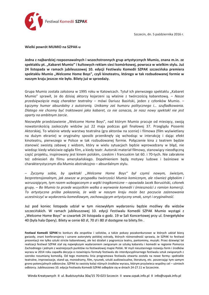 Szczecin, dn. 5 października 2016 r. Wielki powrót MUMIO na SZPAK-u Jedna z najbardziej rozpoznawalnych i wszechstronnych grup artystycznych Mumio, znana m.in. ze spektaklu pt. „Kabaret Mumio” i kultowych reklam sieci komórkowej, powraca w wielkim stylu. Już 24 listopada w ramach jubileuszowej 10. edycji Festiwalu Komedii SZPAK szczecińska premiera spektaklu Mumio „Welcome Home Boys”, czyli kinoteatru, którego w tak rozbudowanej formie w naszym kraju jeszcze nie było. Bilety już w sprzedaży. Grupa Mumio została założona w 1995 roku w Katowicach. Tytuł ich pierwszego spektaklu „Kabaret Mumio” sprawił, że do dzisiaj aktorzy kojarzeni są właśnie z twórczością kabaretową. – Nasze przedsięwzięcia mają charakter teatralny – mówi Dariusz Basiński, jeden z członków Mumio. – Łączymy humor absurdalny z autoironią. Unikamy zaś humoru politycznego i… szufladkowania. Dlatego nie chcemy być traktowani jako kabaret, co nie oznacza, że nasz nowy spektakl nie jest oparty na ambitnym żarcie. Niezwykłe przedstawienie „Welcome Home Boys”, nad którym Mumio pracuje od miesięcy, swoją nowatorskością zaskoczyło widzów już 22 maja podczas gali finałowej 37. Przeglądu Piosenki Aktorskiej. To właśnie wtedy warstwy teatralna (gra aktorów na scenie) i filmowa (film wyświetlany na dużym ekranie) w oryginalny sposób przeniknęły się wchodząc w interakcję i dając efekt kinoteatru, pierwszego w Polsce w tak rozbudowanej formie. Połączenie kina z teatrem będzie stanowić swoistą zabawę z widzem, który w wielu sytuacjach będzie wprowadzany w błąd, nie wiedząc kiedy właściwie ogląda film, a kiedy teatr. Autorski materiał filmowy, stanowiący nieodłączną część projektu, inspirowany jest kinem polskim, czeskim i francuskim lat 60. i 70-tych. Nie zabraknie też odniesień do filmu amerykańskiego. Dopełnieniem będą motywy ludowe i baśniowe w charakterystycznym dla Mumio abstrakcyjno – absurdalnym stylu. – Życzymy sobie, by spektakl „Welcome Home Boys“ był czymś nowym, świeżym, bezpretensjonalnym, jak zawsze w przypadku twórczości Mumio komicznym, ale również głębokim i wzruszającym, tym razem wzbogaconym o wątki tragikomiczne – opowiada Jacek Borusiński, członek grupy. – Bo Mumio to przede wszystkim walka o wyrwanie komedii i śmieszności z ramion komercji. To artystyczna próba pokazania, że widz w naszym kraju może bez poczucia zażenowania uczestniczyć w wydarzeniu komediowym, zachowującym artystyczny smak, sznyt i oryginalność. Już pod koniec listopada udział w tym niezwykłym wydarzeniu będzie możliwy dla widzów szczecińskich. W ramach jubileuszowej 10. edycji Festiwalu Komedii SZPAK Mumio wystąpi z „Welcome Home Boys” w czwartek 24 listopada o godz. 19 w Sali Koncertowej przy ul. Energetyków 40 (była hala Opery). Bilety w cenie 60 zł, 70 zł i 80 zł dostępne na bilety.fm . Festiwal Komedii SZPAK to konkurs dla zespołów i solistów, a także pokazy pozakonkursowe w których udział biorą gwiazdy, znani konferansjerzy i uznane autorytety polskiej estrady, których różnorodność sprawia, że SZPAK to festiwal prezentacji nie tylko sztuki stricte kabaretowej, ale też działań z pogranicza teatru, pantomimy, muzyki. Przez dziewięć lat realizacji festiwal SZPAK stał się największym wydarzeniem związanym ze sztuką kabaretu i komedii w regionie Pomorza Zachodniego i jednym z ważniejszych punktów na festiwalowej mapie Polski. W myśl nieustannego rozwoju form i środków wyrazu w 2014 roku zapadła decyzja o rozwinięciu formuły festiwalu do interdyscyplinarnego festiwalu sztuk związanych z szeroko rozumianą komedią. Od tego momentu linia programowa festiwalu otwarta została na nowe formy: spektakle teatralne, improwizacje, stand up, monodramy, film, rysunek, sztuki audiowizualne, literaturę, etc. poszerzając tym samym grono potencjalnych odbiorców. SZPAK to swoisty kolaż różnych środków wyrazu, którym przyświeca wspólny cel – uśmiech odbiorcy. Jubileuszowa 10. edycja Festiwalu Komedii SZPAK odbędzie się w dniach 24-27.11 w Szczecinie. Winda Kreatywnych II ul. Budziszyńska 30a/15 70-023 Szczecin II www.szpak.info.pl II [email protected] Więcej informacji: www.szpak.info.pl Marika Gołda rzeczniczka prasowa 10. Festiwalu Komedii SZPAK kom: (+48) 601 956 111 e-mail: [email protected] Winda Kreatywnych II ul. Budziszyńska 30a/15 70-023 Szczecin II www.szpak.info.pl II [email protected]