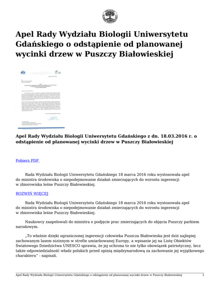 Apel Rady Wydziału Biologii Uniwersytetu Gdańskiego o odstąpienie od planowanej wycinki drzew w Puszczy Białowieskiej Apel Rady Wydziału Biologii Uniwersytetu Gdańskiego z dn. 18.03.2016 r. o odstąpienie od planowanej wycinki drzew w Puszczy Białowieskiej Pobierz PDF Rada Wydziału Biologii Uniwersytetu Gdańskiego 18 marca 2016 roku wystosowała apel do ministra środowiska o niepodejmowanie działań zmierzających do wzrostu ingerencji w zbiorowiska leśne Puszczy Białowieskiej. ROZWIŃ WIĘCEJ Rada Wydziału Biologii Uniwersytetu Gdańskiego 18 marca 2016 roku wystosowała apel do ministra środowiska o niepodejmowanie działań zmierzających do wzrostu ingerencji w zbiorowiska leśne Puszczy Białowieskiej. Naukowcy zaapelowali do ministra o podjęcie prac zmierzających do objęcia Puszczy parkiem narodowym. „To właśnie dzięki ograniczonej ingerencji człowieka Puszcza Białowieska jest dziś najlepiej zachowanym lasem nizinnym w strefie umiarkowanej Europy, a wpisanie jej na Listę Obiektów Światowego Dziedzictwa UNESCO sprawia, że jej ochrona to nie tylko obowiązek patriotyczny, lecz także odpowiedzialność władz polskich przed opinią międzynarodową za zachowanie jej wyjątkowego charakteru” - napisali. Apel Rady Wydziału Biologii Uniwersytetu Gdańskiego o odstąpienie od planowanej wycinki drzew w Puszczy Białowieskiej 1