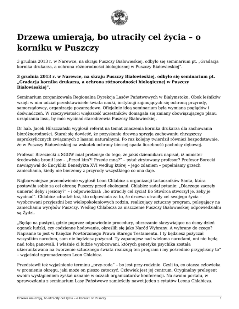Drzewa umierają, bo utraciły cel życia – o korniku w Puszczy 3 grudnia 2013 r. w Narewce, na skraju Puszczy Białowieskiej, odbyło się seminarium pt. „Gradacja kornika drukarza, a ochrona różnorodności biologicznej w Puszczy Białowieskiej”. 3 grudnia 2013 r. w Narewce, na skraju Puszczy Białowieskiej, odbyło się seminarium pt. „Gradacja kornika drukarza, a ochrona różnorodności biologicznej w Puszczy Białowieskiej”. Seminarium zorganizowała Regionalna Dyrekcja Lasów Państwowych w Białymstoku. Obok leśników wzięli w nim udział przedstawiciele świata nauki, instytucji zajmujących się ochroną przyrody, samorządowcy, organizacje pozarządowe. Oficjalnie ideą seminarium była wymiana poglądów i doświadczeń. W rzeczywistości większość uczestników domagała się zmiany obowiązującego planu urządzania lasu, by móc wycinać starodrzewia Puszczy Białowieskiej. Dr hab. Jacek Hilszczański wygłosił referat na temat znaczenia kornika drukarza dla zachowania bioróżnorodności. Starał się dowieść, że pozyskanie drewna sprzyja zachowaniu chrząszczy saproksylicznych związanych z lasami naturalnymi. Po raz kolejny twierdził również bezpodstawnie, że w Puszczy Białowieskiej na wskutek ochrony biernej spada liczebność pachnicy dębowej. Profesor Brzeziecki z SGGW miał pretensje do tego, że jakiś dziennikarz napisał, iż minister środowiska bronił lasy – „Przed kim?! Przede mną?” – pytał zirytowany profesor? Profesor Borecki nawiązywał do Encykliki Benedykta XVI według której – jego zdaniem – popełniamy grzech zaniechania, kiedy nie bierzemy z przyrody wszystkiego co ona daje. Najbarwniejsze przemówienie wygłosił Leon Chlabicz z organizacji tartaczników Santa, która postawiła sobie za cel obronę Puszczy przed ekologami. Chlabicz zadał pytanie: „Dlaczego zaczęły umierać dęby i jesiony?” – i odpowiedział: „bo utraciły cel życia! Bo Stwórca stworzył je, żeby je wycinać”. Chlabicz zdradził też, kto odpowiada za to, że drzewa utraciły cel swojego życia – wyobcowani przyjezdni bez wielopokoleniowych rodzin, realizujący sztuczny program, polegający na zaniechaniu wyrębów Puszczy. Według Chlabicza za niszczenie Puszczy Białowieskiej odpowiedzialni są Żydzi. „Będąc na pustyni, gdzie poprzez odpowiednie procedury, obrzezanie skrzywiające na ósmy dzień ogonek ludzki, czy codzienne hodowanie, określili się jako Naród Wybrany. A wybrany do czego? Napisane to jest w Księdze Powtórzonego Prawa Starego Testamentu. I ty będziesz pożyczał wszystkim narodom, sam nie będziesz pożyczał. Ty zapanujesz nad wieloma narodami, oni nie będą nad tobą panowali. I właśnie ci ludzie wyobcowani, których genetyka psychika została ukierunkowana na tworzenie sztucznego świata realizują ten program i my pośrednio przyjęliśmy to” – wyjaśniał zgromadzonym Leon Chlabicz. Przedstawił też wyjaśnienie terminu „przy-roda” – bo jest przy-rodzinie. Czyli to, co otacza człowieka w promieniu okręgu, jaki może on pieszo zatoczyć. Człowiek jest jej centrum. Oryginalny prelegent swoim wystąpieniem zyskał uznanie w oczach organizatorów konferencji. Na swoim portalu, w sprawozdaniu z seminarium Lasy Państwowe zamieściły nawet jeden z cytatów Leona Chlabicza. Drzewa umierają, bo utraciły cel życia – o korniku w Puszczy 1 Zwróciłem uwagę na to, że (jak powiedział kilka dni temu na antenie Radia Białystok wicedyrektor RDLP Marek Masłowski) walka z kornikiem z drukarzem w warunkach Puszczy Białowieskiej, gdzie obszary parku i rezerwatów (w których kornik nie jest kontrolowany) przeplatają się z lasem zagospodarowanym, jest z góry skazana na niepowodzenie, oraz że również w ostatnim czasie Komisja Europejska poinformowała o zamknięciu prowadzonego przez kilka lat postępowania dotyczącego Puszczy Białowieskiej ze względu na podpisanie Planu Urządzania Lasu gwarantującego ochronę lasów zagospodarowanych. W związku z powyższym zaapelowałem do leśników, by zastanowili się, czy warto prosić Ministra Środowiska o zgodę na działania, które z góry są skazane na niepowodzenie oraz wiążą się z ryzykiem konfliktu z Komisją Europejską. Zastępca dyrektora RDLP w Białymstoku – Marek Masłowski potwierdził, że problemem jest wynikająca z prawa konieczność walki z kornikiem drukarzem w Puszczy, która jedynie generuje koszty, a nie przynosi rezultatów. Adam Bohdan Czytaj również: ● ● Felieton. Pejsaty kornik niszczy Puszczę Białowieską (gazeta.pl, 09.12.2013) Konferencja kornikowa i aspekty nienaukowe (puszcza-bialowieska.blogspot.com, 03.12.2013) Drzewa umierają, bo utraciły cel życia – o korniku w Puszczy 2