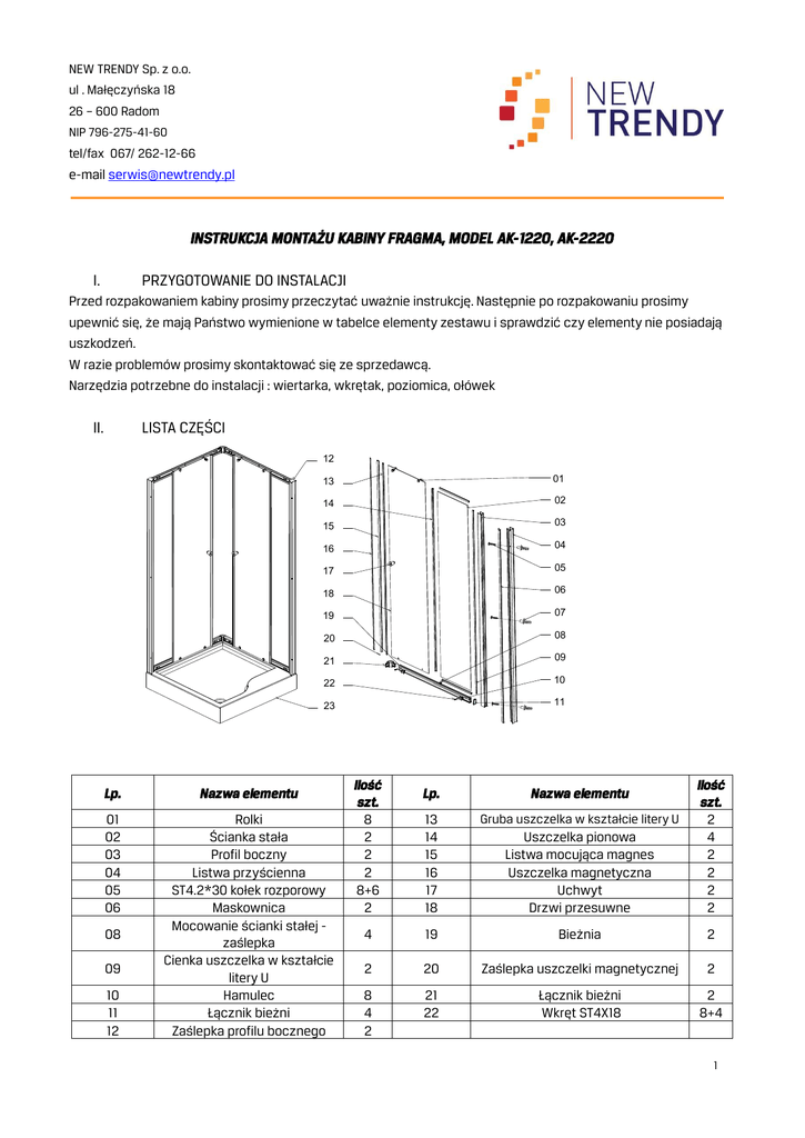 INSTRUKCJA MONTAŻU KABINY FRAGMA, MODEL AK-1220, AK-2220