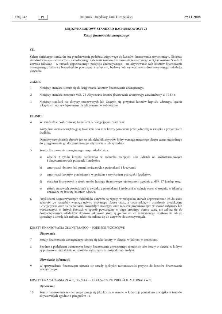 L 320/142 Dziennik Urzędowy Unii Europejskiej PL MIĘDZYNARODOWY STANDARD RACHUNKOWOŚCI 23 Koszty finansowania zewnętrznego CEL Celem niniejszego standardu jest przedstawienie podejścia księgowego do kosztów finansowania zewnętrznego. Niniejszy standard wymaga – w zasadzie – niezwłocznego zaliczenia kosztów finansowania zewnętrznego w ciężar kosztów. Standard zezwala jednakże – w ramach dopuszczonego podejścia alternatywnego – na aktywowanie tych kosztów finansowania zewnętrznego, które są bezpośrednio powiązane z nabyciem, budową lub wytworzeniem dostosowywanego składnika aktywów. ZAKRES 1 Niniejszy standard stosuje się do księgowania kosztów finansowania zewnętrznego. 2 Niniejszy standard zastępuje MSR 23 Aktywowanie kosztów finansowania zewnętrznego zatwierdzony w 1983 r. 3 Niniejszy standard nie dotyczy rzeczywistych lub dających się przypisać kosztów kapitału własnego, łącznie z kapitałem uprzywilejowanym niezaliczonym do zobowiązań. DEFINICJE 4 W standardzie posłużono się terminami o następującym znaczeniu: Koszty finansowania zewnętrznego są to odsetki oraz inne koszty poniesione przez jednostkę w związku z pożyczeniem środków. Dostosowywany składnik aktywów jest to taki składnik aktywów, który wymaga znacznego okresu czasu niezbędnego do przygotowania go do zamierzonego użytkowania lub sprzedaży. 5 6 Koszty finansowania zewnętrznego mogą składać się z: a) odsetek z tytułu kredytu bankowego w rachunku bieżącym oraz odsetek od krótkoterminowych i długoterminowych pożyczek i kredytów; b) amortyzacji dyskont lub premii związanych z pożyczkami i kredytami; c) amortyzacji kosztów poniesionych w związku z uzyskaniem pożyczek i kredytów; d) obciążeń finansowych z tytułu umów leasingu finansowego, ujmowanych zgodnie z MSR 17 Leasing; oraz e) różnic kursowych powstających w związku z pożyczkami i kredytami w walucie obcej, w stopniu, w jakim są uznawane za korektę kosztów odsetek. Przykładami dostosowywanych składników aktywów są zapasy, w przypadku których doprowadzenie ich do stanu zdatności do sprzedaży wymaga upływu znacznego okresu czasu, a także zakłady i urządzenia produkcyjne i energetyczne oraz nieruchomości. Pozostałych inwestycji oraz zapasów produkowanych w sposób rutynowy lub wytwarzanych w dużych ilościach w sposób powtarzalny w ciągu krótkiego okresu czasu nie zalicza się do dostosowywanych składników aktywów. Aktywów, które są gotowe do ich zamierzonego użytkowania lub do sprzedaży z chwilą ich nabycia, także nie zalicza się do aktywów dostosowywanych. KOSZTY FINANSOWANIA ZEWNĘTRZNEGO – PODEJŚCIE WZORCOWE Ujmowanie 7 Koszty finansowania zewnętrznego ujmuje się jako koszty w okresie, w którym je poniesiono. 8 Zgodnie z podejściem wzorcowym koszty finansowania zewnętrznego ujmuje się jako koszty w okresie, w którym są ponoszone, niezależnie od sposobu wykorzystania pożyczki lub kredytu. Ujawnianie informacji 9 W sprawozdaniu finansowym ujawnia się zasady (politykę) rachunkowości przyjęte do kosztów finansowania zewnętrznego. KOSZTY FINANSOWANIA ZEWNĘTRZNEGO – DOPUSZCZONE PODEJŚCIE ALTERNATYWNE Ujmowanie 10 Koszty finansowania zewnętrznego ujmuje się jako koszty w okresie, w którym je poniesiono, z wyjątkiem kosztów aktywowanych zgodnie z paragrafem 11. 29.11.2008 29.11.2008 Dziennik Urzędowy Unii Europejskiej PL 11 Koszty finansowania zewnętrznego, które można bezpośrednio przyporządkować nabyciu, budowie lub wytworzeniu dostosowywanego składnika aktywów, aktywuje się jako część ceny nabycia lub kosztu wytworzenia tego składnika aktywów. Kwotę kosztów finansowania zewnętrznego, która podlega aktywowaniu, ustala się zgodnie z niniejszym standardem. 12 Zgodnie z dopuszczonym podejściem alternatywnym koszty finansowania zewnętrznego, które można bezpośrednio przyporządkować nabyciu, budowie lub wytworzeniu składnika aktywów, włącza się do ceny nabycia lub kosztu wytworzenia tego składnika aktywów. Takie koszty finansowania zewnętrznego aktywuje się jako część ceny nabycia lub kosztu wytworzenia składnika aktywów, jeżeli jest prawdopodobne, że w przyszłości przyniosą jednostce korzyści ekonomiczne oraz cenę nabycia lub koszt wytworzenia można określić w wiarygodny sposób. Pozostałe koszty finansowania zewnętrznego ujmuje się jako koszt w okresie, w którym są ponoszone. Koszty finansowania zewnętrznego, które mogą być aktywowane 13 Kosztami finansowania zewnętrznego, które można bezpośrednio przyporządkować nabyciu, budowie lub wytworzeniu dostosowywanego składnika aktywów, są te koszty finansowania zewnętrznego, których można byłoby uniknąć, gdyby nie zostały poniesione nakłady na dostosowywany składnik aktywów. Jeżeli jednostka pożycza środki specjalnie w celu pozyskania określonego dostosowywanego składnika aktywów, koszty finansowania zewnętrznego odnoszące się bezpośrednio do tego składnika aktywów można z łatwością określić. 14 Trudność sprawiać może określenie bezpośredniego związku między określoną pożyczką lub kredytem a dostosowywanym składnikiem aktywów oraz ustalenie na tej podstawie, jakich pożyczek i kredytów można było uniknąć. Tego rodzaju trudność pojawia się na przykład w przypadku, kiedy działalność finansowa jednostki jest centralnie koordynowana. Trudności powstają także wówczas, gdy grupa kapitałowa posługuje się całym wachlarzem instrumentów dłużnych celem uzyskania środków o różnych stopach procentowych, a następnie pożycza uzyskane w ten sposób środki innym jednostkom w ramach tej samej grupy kapitałowej na różnych warunkach. Inne komplikacje powstają w związku z korzystaniem z pożyczek lub kredytów wyrażonych w walutach obcych lub powiązanych z walutami obcymi, jeśli grupa kapitałowa działa w gospodarce hiperinflacyjnej lub w przypadku zmian