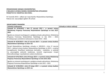 SPRAWOZDANIE ZARZĄDU WOJEWÓDZTWA Z REALIZACJI UCHWAŁ SEJMIKU WOJEWÓDZTWA OPOLSKIEGO PODJĘTYCH W I KWARTALE 2015 ROKU. W I kwartale 2015 r. odbyły się 3 sesje Sejmiku Województwa Opolskiego. Podczas ww. sesji podjęto ogółem 39 uchwał. DEPARTAMENT FINANSÓW Uchwały zrealizowane Uchwały w trakcie realizacji Uchwała Nr III/34/2015 z dnia 27 stycznia 2015 r. w sprawie zmiany Wieloletniej Prognozy Finansowej Województwa Opolskiego na lata 20152022. Zgodnie ze zmianami wynikającymi z podjętej uchwały uaktualniono: Wieloletnią Prognozę Finansową Województwa Opolskiego na lata 2015 – 2022, Przedsięwzięcia wieloletnie realizowane w latach 2015 – 2022. Uchwała Nr III/35/2015 z dnia 27 stycznia 2015 r. w sprawie zmiany budżetu Województwa Opolskiego na 2015 rok. Zarząd Województwa Opolskiego uchwałą nr 209/2015 z dnia 27 stycznia 2015 r. dokonał zmiany budżetu Województwa Opolskiego na 2015 r. w pełnej szczegółowości klasyfikacji budżetowej dochodów i wydatków, w podziale na poszczególne jednostki budżetowe, komórki organizacyjne Urzędu Marszałkowskiego i wyodrębnione zadania budżetowe. Uchwała Nr IV/41/2015 z dnia 24 lutego 2015 r. w sprawie zmiany Wieloletniej Prognozy Finansowej Województwa Opolskiego na lata 2015-2022. Zgodnie ze zmianami wynikającymi z podjętej uchwały uaktualniono: Wieloletnią Prognozę Finansową Województwa Opolskiego na lata 2015 – 2022. Uchwała Nr IV/42/2015 z dnia 24 lutego 2015 r. w sprawie zmiany budżetu Województwa Opolskiego na 2015 rok. 1 Zarząd Województwa Opolskiego uchwałą nr 315/2015 z dnia 24 lutego 2015 r. dokonał zmiany budżetu Województwa Opolskiego na 2014 r. w pełnej szczegółowości klasyfikacji budżetowej dochodów i wydatków, w podziale na poszczególne jednostki budżetowe, komórki organizacyjne Urzędu Marszałkowskiego i wyodrębnione zadania budżetowe. Uchwała Nr V/62/2015 z dnia 31 marca 2015 r. w sprawie zmiany Wieloletniej Prognozy Finansowej Województwa Opolskiego na lata 2015-2022. Zgodnie ze zmianami wynikającymi z podjętej uchwały uaktualniono: Wieloletnią Prognozę Finansową Województwa Opolskiego na lata 2015 – 2022, Przedsięwzięcia wieloletnie realizowane w latach 2015 – 2022. Uchwała Nr V/63/2015 z dnia 31 marca 2015 r. w sprawie zmiany budżetu Województwa Opolskiego na 2015 rok. Zarząd Województwa Opolskiego uchwałą nr 497/2015 z dnia 31 marca 2015 r. dokonał zmiany budżetu Województwa Opolskiego na 2015 r. w pełnej szczegółowości klasyfikacji budżetowej dochodów i wydatków, w podziale na poszczególne jednostki budżetowe, komórki organizacyjne Urzędu Marszałkowskiego i wyodrębnione zadania budżetowe. DEPARTAMENT KULTURY, SPORTU I TURYSTYKI Uchwały zrealizowane Uchwały w trakcie realizacji Uchwała Nr V/68/2015 zmieniająca uchwałę w sprawie „Programu Rozwoju Bazy Sportowej Województwa Opolskiego na lata 2013 -2018”. „Program Rozwoju Bazy Sportowej Województwa Opolskiego na lata 20132018” przyjęty w roku 2013 uchwałą nr XXIX/373/2013 Sejmiku Województwa Opolskiego z dnia 30 kwietnia 2013 r. został zmieniony uchwałami nr XLI/482/2013 Sejmiku Województwa Opolskiego w dniu 29 kwietnia 2014 r. oraz uchwałą nr V/68/2015 Sejmiku Województwa Opolskiego w dniu 31 marca 2015 r. 2 Zadania kontynuowane z lat poprzednich obejmują cztery inwestycje, w tym: jeden kompleks z halą sportową i krytą pływalnią, jedną halę sportową, modernizację pływalni oraz modernizację stadionu sportowego. Trzy projekty będą zakończone w roku bieżącym, zakończenie budowy kompleksu sportowego przewidziane jest na rok 2018. Nowe inwestycje to 14 projektów, w tym: modernizacja sztucznego lodowiska, budowa skateparku, remont przyszkolnej sali sportowej, modernizacja pływalni, szęść kompleksów boisk sportowych, trzy modernizacje boisk oraz zespół siłowni plenerowych. Z inwestycji nowo rozpoczętych 10 projektów zakończy się w roku 2015, pozostałe 4 w roku 2016. Jako zadania rezerwowe do uruchomienia w przypadku wolnych środków finansowych zakwalifikowano dwa zadani inwestycyjne. Są to remont hali sportowej oraz modernizacja boiska wielofunkcyjnego, przewidziane do ukończenia w roku 2015 i 2016. BIURO SKARBU WOJEWÓDZTWA Uchwały zrealizowane Uchwały w trakcie realizacji Uchwała Nr IV/46/2015 z dnia 24 lutego 2015 r. w sprawie wyrażenia zgody na zbycie w drodze darowizny nieruchomości Województwa Opolskiego na rzecz Gminy Gogolin. W trakcie przygotowywania jest uchwała Zarządu w sprawie wyrażenia zgody na zbycie w drodze darowizny na rzecz gminy Gogolin oraz uchwała Rady Gminy Gogolin wyrażająca zgodę na przyjęcie nieruchomości w formie darowizny od Województwa Opolskiego. 3 Następnie po podpisaniu przez obie strony protokołu uzgodnień zawarty zostanie akt notarialny. DEPARTAMENT ROLNICTWA I ROZWOJU WSI Uchwały zrealizowane Uchwały w trakcie realizacji Uchwała Nr IV/45/2015 z dnia 24 lutego 2015r. w sprawie określenia miejsca, warunków, czasu i sposobu ograniczenia populacji zwierząt na terenie miasta Kędzierzyn-Koźle. Uchwała została opublikowana w Dzienniku Urzędowym Województwa Opolskiego z dnia 4 marca 2015 r. pod poz. 500. Informacja o opublikowaniu ww. uchwały przesłano Zastępcy Prezydenta Miasta Kędzierzyn-Koźle przy piśmie nr DRW.I.7131.13.2014 z dnia 13 marca 2015 r. Uchwała Nr V/65/2015 z dnia 31 marca 2015r. w sprawie określenia ogólnej powierzchni przeznaczonej pod uprawy maku i konopi włóknistych oraz rejonizacji tych upraw w 2015 r. na terenie Województwa Opolskiego. Uchwała została opublikowana w Dzienniku Urzędowym Województwa Opolskiego z dnia 7 kwietnia 2015 r. pod poz. 861. Informację o opublikowaniu uchwały przesłano do gmin ujętych w przedmiotowej uchwale w dniu 10 kwietnia br. DEPARTAMENT OCHRONY ŚRODOWISKA Uchwały zrealizowane Uchwała Nr III/33/2015 z dnia 27 stycznia 2015 r. w sprawie przyjęcia „Programu Ochrony powietrza dla st