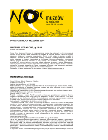 PROGRAM NOCY MUZEÓW 2014 MUZEUM UTRACONE, g.23.00 Poznań, plac Wolności Pokaz filmu Muzeum Utracone to niepowtarzalna okazja, by zobaczyć w ultranowoczesnej oprawie skarby kultury, które znajdowały się niegdyś w polskich zbiorach i które w wyniku zawieruch dziejowych przepadły bezpowrotnie. Część z nich udaje się jednak odnaleźć i odzyskać – ostatnio do kraju powróciły np. “Schody pałacowe" Guardiego zaginione podczas II wojny światowej z Muzeum Narodowego w Warszawie. Motywem przewodnim tegorocznej odsłony projektu Muzeum Utracone są losy kolekcji. Ich zawikłane i zaskakujące historie przybliży film, którego twórcy w tym roku sięgają odważnie do sztuki i kultury współczesnej. Zobaczymy zawirowania związane z powstawaniem kolekcji, próbami ukrycia obiektów w obliczu zbliżającej się wojny, dowiemy się, gdzie znajdowały się skrytki i jak okupanci je odkrywali, poznamy wiele ciekawostek związanych z losami danych zbiorów. Ciekawych już teraz zapraszamy do wirtualnego muzeum www.muzeumutracone.pl MUZEUM NARODOWE Gmach Główny Galeria Malarstwa i Rzeźby, Al. Marcinkowskiego 9 Gabinet Numizmatyczny, g.17.00-1.00 Różnorodność to bez wątpienia wizytówka Gabinetu Numizmatycznego. Oprócz monet, medali, plakiet i medalionów, w zasobach Gabinetu znajdują się także pieczęcie, ordery, odznaki i odznaczenia, pieniądz papierowy, akcje i obligacje, jak również wiele innych przedmiotów sklasyfikowanych pod wspólnym hasłem varia (dr Witold Garbaczewski, Agnieszka Murawska). Gabinet Rycin, g.17.00-1.00 Projekt – matryca – dzieło. Tajniki warsztatu graficznego, przedstawiony zostanie złożony problem powstawania dzieła graficznego od wstępnego projektu, przez matrycę, czyli płytę graficzną, aż do ukończonej odbitki. Na jednodniowej wystawie zaprezentowane zostaną przykłady grafik wraz z rysunkami i płytami, które posłużyły do ich wykonania. Galeria Sztuki Polskiej od XVI do XVIII w, g.19.00-20.00 ,,Ożywiamy trumniaki, czyli czemu służył portret trumienny". Czym był i czemu służył portret trumienny? Kto i w jakiej technice go wykonywał? Jak długo trwała tradycja jego stosowania? Na te i inne pytania będziemy mogli poznać odpowiedzi. Spotkaniu towarzyszyć będą warsztaty wyklejania puzzli z motywami portretów trumiennych na pudełkach od pizzy. Ważnym punktem programu będzie promocja tzw. "Duszy czyśćcowej" pochodzącej ze zbiorów Franciszka Starowieyskiego, polskiego grafika, malarza, rysownika i scenografa, jednego z największych kolekcjonerów dzieł sztuki w Polsce. Zabytek jest tegorocznym nabytkiem dla Galerii Sztuki Polskiej XVI-XVIII w. zakupionym dzięki dofinansowaniu ze środków Ministra Kultury i Dziedzictwa Narodowego. (Adriana Podmostko-Kłos). Galeria Sztuki Polskiej od końca XVIII wieku do 1945 roku, g.18.00 i 20.00 Jak w XIX wieku malowano widoki natury? Malarstwo pejzażowe jako odrębny i samodzielny gatunek sztuki pojawiło się w XVII wieku, przede wszystkim w sztuce holenderskiej i francuskiej, lecz dopiero wiek XIX przyniósł zrównanie jego znaczenia z obrazami uznawanymi dotąd za najważniejsze: o temacie historycznym, mitologicznym czy religijnym. Opowiemy o powodach tej emancypacji i sposobach ujmowania natury. O romantycznej wizji natury w dziełach Aleksandra Orłowskiego. O pejzażach Józefa Szermentowskiego i jego realistycznym "zapisie" obserwowanego świata. O kanonie impresjonistycznego widzenia i malowania w obrazach Władysława Podkowińskiego. I o indywidualnych wizjach natury w symbolistycznych dziełach Jacka Malczewskiego, Wojciecha Weissa i Ferdynanda Ruszczyca. Początek pejzażowej wędrówki: Krajobraz morski z 1820 roku Aleksandra Orłowskiego, sala romantyzmu, na III kondygnacji nowego gmachu Muzeum. dr Maria Gołąb Oblicza (portrety) epoki stanisławowskiej, g.19:00 i 21:00 Spotkanie w pierwszej, prezentującej malarstwo Oświecenia, przestrzeni Galerii Sztuki Polskiej, dotyczyć będzie eksponowanych tam portretów. Losy obrazów oraz ich bohaterów staną się częścią wykładu na temat znaczenia artystycznych przemian epoki, mecenatu Stanisława Augusta, a także historii kolekcji Muzeum Narodowego. Twórczość portretowa XVIII-wiecznych artystów obrazuje istotny fragment narodowych losów, przywołując kluczowe dla tego czasu postacie. Ich twarze są swoistymi znakami szczególnymi czasu narodzin nowoczesności. Spotkanie poświęcone będzie portretom mecenasów, artystów i bohaterów. Galeria tych twarzy stworzyć może szkic zbiorowego portretu polskiego oświecenia. dr Agnieszka Skalska Koło Naukowe Studentów Historii Sztuki, g.20:00-22.00 – spotkania przy obiektach Studenci spróbują przybliżyć zwiedzającym wizualne aspekty obrazów oraz dokonać ich analizy. Widzowie dowiedzą się m.in.: jaki przekaz niosą obrazy, kim były przedstawione na nich postaci i jakie role przypisał im artysta, jakie są cechy charakterystyczne danego stylu, jaką rolę dziełu sztuki przypisywano w okresie jego powstania oraz jak czytać sztukę niefiguratywną. Studenci przybliżą również sylwetki artystów oraz cechy charakterystyczne ich twórczości. ,,O Muzeum Książąt Czartoryskich w Gołuchowie", g.18.00-19.00 prezentacje: Muzeum Książąt Czartoryskich w Gołuchowie i jego pierwszy kustosz. Zamek w Gołuchowie, wzniesiony w połowie XVI wieku dla Rafała Leszczyńskiego, Izabella z Czartoryskich Działyńskia przebudowała w latach 1875-1885 w guście romantycznym. Przebudowany zamek pomieścił kolekcję dzieł sztuki zgromadzoną przez właścicielkę, po śmierci Izabelli (1899) , książę Witold Kazimierz Czartoryski, zatrudnił w 1911 stałego kustosza zbiorów, którym został Nikodem Pajzderski. Ewa Siejkowska-Askutja Zaproszenie do Gołuchowa Nikodema Pajzderskiego pierwszy przewodnik po zbiorach muzealnych. Przewodnik po Gołuchowie powstały w 1913 r. był dowodem twórczego rozwoju idei Izabelli z Czartoryskich Dział