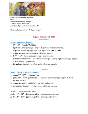 Centrum Aktywności Seniorów przy Parafii Miłosierdzia Bożego Kraków Nowy –Prokocim „Klub Zachęta „ ul. Jana Kurczaba 25 Motto : „Tyle jesteś wart ile dajesz innym” Zajęcia Październik 2016 Poniedziałek KLUB „Sport dla Seniora” 1. 830 - 1000 - Nordic Walking Spotkania przy parkingu - róg ul. Republiki Korczakowskiej. Zapisy u prowadzącego zajęcia p. Agatka tel.739 252 515 2. Aqua Aerobic - wejściówki wg listy na basenie. 3. 1430 – 1630 - Kurs komputerowy - kontynuacja – Szkoła Podstawowa 41 ul. Jerzmanowskiego. Zapisy u prowadzącego zajęcia – ilość miejsc ograniczona. 4. Zajęcia na basenie - wejściówki wg listy na basenie Wtorek Klub „SPORT DLA SENIORA” 1. godz. 915 – 1000 - gimnastyka 2. godz.1045 - 1100 - gimnastyka – zapisy u prowadzącego zajęcia p. Ania tel.722 102 173 3. Aqua Aerobic - wejściówki wg listy na basenie 4. Zajęcia na basenie - wejściówki wg listy na basenie Klub „Ucz się razem z nami „ godz. 1100 - 1200 - język angielski - grupa zaawansowana godz. 1200 – 1300 - język angielski - grupa podstawowa Środa KLUB „Podróże Małe i Duże” 5.10.2016 – środa Bazylika Mariacka, dzieje Rynku Krakowskiego. Zbiórka o godz. 1130 przed głównym wejściem do Bazyliki. 12.10.2016 – zwiedzamy kościoły Dominikanów i Franciszkanów, środa o godz.1100 koncert na altówkę, skrzypce, wiolonczelę i organy pt. „Sabat Mater” Vivaldiego w Kościele Św. Marcina ul. Grodzka cena wstępu 5 zł, po koncercie o godz.1230 zbiórka przed kościołem Dominikanów. 19.10.2016 – środa Spacer do Lasu Wolskiego – Kopiec Piłsudskiego, zbiórka pod Klubem „Zachęta” o godz.1000 przejazd komunikacją miejską. Można zabrać kije. W przypadku zapowiedzi brzydkiej pogody proszę o kontakt telefoniczny (najpóźniej we wtorek) z p. Bożenką (tel.698 805 592) i ustalenie spotkania alternatywnego. 26.10.2016 – środa Wzgórze Wawelskie, Katedra Wawelska zbiórka o godz.1000 przed Katedrą. Zajęcia plastyczne 1215 – 1345 - rysunek, malarstwo, florystyka, różne techniki zdobienia przedmiotów (np. de coupage) itp. Uczestnicy zajęć ustalą z prowadzącym program zajęć.(p. Angelika tel.509 820 372) Klub „SPORT DLA SENIORA” 1. Aqua - Aerobic - wejściówki wg listy na basenie 2. Zajęcia na basenie - wejściówki wg listy na basenie 1340 – 1540 - Kurs komputerowy - podstawowyzajęcia odbywają się w Szkole Podstawowej nr 41 ul. Jerzmanowskiego. Zapisy u prowadzącego zajęcia - ilość miejsc ograniczona. Czwartek KLUB „SPORT DLA SENIORA” 1. godz.830 - 1000 – „Nordic Wallking” – zbiórka pod Klubem „Zachęta” . 2. Aqua Aerobic - wejściówki wg listy na basenie 3. Zajęcia na basenie - wejściówki wg listy na basenie KULINARIA 1015 – 1100 - wymiana doświadczeń, przepisy, degustacja, zasady zdrowego żywienia KLUB „PODRÓŻE MAŁE I DUŻE” 1100- 1145 - wyjazdy pobytowe, wycieczki – informacja i zapisy SPOTKANIA KLUBOWE 1145 - 1400 - (kawa, herbata, gry planszowe, goście) spotkania te mogą odbywać się w każdy inny dzień po zawiadomieniu Koordynatora. Piątek KLUB „PODRÓŻE MAŁE I DUŻE” 7.10.2016 - wyjazd do Doliny Będkowskiej, przejazd komunikacją zbiorową, koszt przejazdu ok. 10 zł. Zbiórka o godz.1000 po Klubem „Zachęta” ul. Kurczaba 25, przewidywany powrót około godz.17tej. Można zabrać kije. 14.10.2016 – wycieczka do Tyńca, zwiedzanie kościoła + spacer. Zbiórka o godz.10tej pod Klubem „Zachęta” ul. Kurczaba 25, przejazd komunikacją miejską. KLUB „SPORT DLA SENIORA” 1. Aqua aerobic – wejściówki wg listy na basenie 2. Zajęcia na basenie - wejściówki wg listy na basenie WYJŚCIA DO TEATRÓW wg zapisów ogłoszonych odrębnym komunikatem. KOMUNIKAT W dniu 4.10.2016 wtorek w godz. 1015 - 1115 będą przyjmowane zapisy na aqua aerobic i basen. W dniu 6.10.2016 czwartek o godz. 1015 – 1100 w Klubie „Zachęta” ul. Kurczaba 25 odbędzie się zebranie wszystkich uczestników programu Centrum Aktywności Seniorów celem wyjaśnienia zasad obowiązujących beneficjentów – uczestników projektu, podsumowania dotychczasowej współpracy i ustalenia programu na przyszłość. Zapraszam serdecznie wszystkich zainteresowanych. Bardzo proszę korzystać ze strony internetowej www.dlaseniora.krakow.pl gdzie znajdą Państwo wszystkie informacje dotyczące zorganizowanych zajęć we wszystkich CAS-ach w Krakowie. Informacja o działalności Centrum Aktywności Seniora jest wywieszana na początku miesiąca na tablicy ogłoszeń na terenie Spółdzielni Mieszkaniowej i Klubu „Zachęta” oraz na stronie internetowej http://parafianprokocim.parafia.info.pl/ Wszelkie informacje dotyczące udziału w projekcie można uzyskać kierując pytania na e-maila do Koordynatora Projektu Małgorzaty Bielczyk [email protected] lub telefonicznie codziennie (za wyjątkiem dni wolnych od pracy) w godz. od 1000 – 1100 tel.500 77 22 86 Z poważaniem Koordynator Projektu Małgorzata Bielczyk