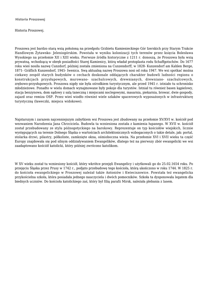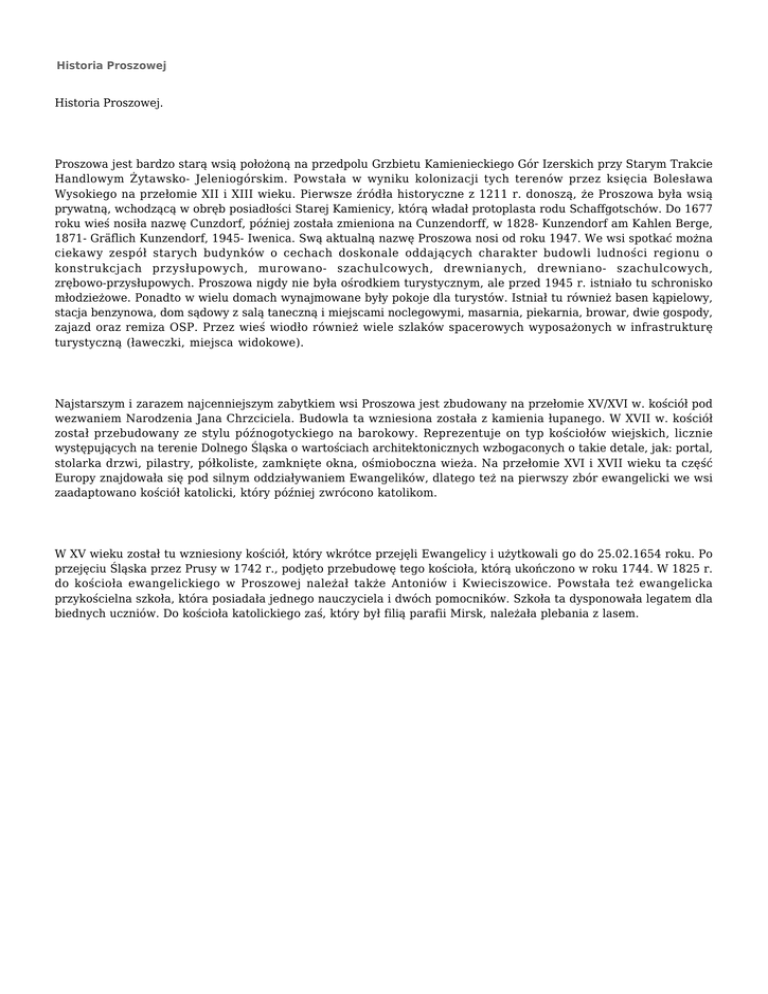 Historia Proszowej Historia Proszowej. Proszowa jest bardzo starą wsią położoną na przedpolu Grzbietu Kamienieckiego Gór Izerskich przy Starym Trakcie Handlowym Żytawsko- Jeleniogórskim. Powstała w wyniku kolonizacji tych terenów przez księcia Bolesława Wysokiego na przełomie XII i XIII wieku. Pierwsze źródła historyczne z 1211 r. donoszą, że Proszowa była wsią prywatną, wchodzącą w obręb posiadłości Starej Kamienicy, którą władał protoplasta rodu Schaffgotschów. Do 1677 roku wieś nosiła nazwę Cunzdorf, później została zmieniona na Cunzendorff, w 1828- Kunzendorf am Kahlen Berge, 1871- Gräflich Kunzendorf, 1945- Iwenica. Swą aktualną nazwę Proszowa nosi od roku 1947. We wsi spotkać można ciekawy zespół starych budynków o cechach doskonale oddających charakter budowli ludności regionu o konstrukcjach przysłupowych, murowano- szachulcowych, drewnianych, drewniano- szachulcowych, zrębowo-przysłupowych. Proszowa nigdy nie była ośrodkiem turystycznym, ale przed 1945 r. istniało tu schronisko młodzieżowe. Ponadto w wielu domach wynajmowane były pokoje dla turystów. Istniał tu również basen kąpielowy, stacja benzynowa, dom sądowy z salą taneczną i miejscami noclegowymi, masarnia, piekarnia, browar, dwie gospody, zajazd oraz remiza OSP. Przez wieś wiodło również wiele szlaków spacerowych wyposażonych w infrastrukturę turystyczną (ławeczki, miejsca widokowe). Najstarszym i zarazem najcenniejszym zabytkiem wsi Proszowa jest zbudowany na przełomie XV/XVI w. kościół pod wezwaniem Narodzenia Jana Chrzciciela. Budowla ta wzniesiona została z kamienia łupanego. W XVII w. kościół został przebudowany ze stylu późnogotyckiego na barokowy. Reprezentuje on typ kościołów wiejskich, licznie występujących na terenie Dolnego Śląska o wartościach architektonicznych wzbogaconych o takie detale, jak: portal, stolarka drzwi, pilastry, półkoliste, zamknięte okna, ośmioboczna wieża. Na przełomie XVI i XVII wieku ta część Europy znajdowała się pod silnym oddziaływaniem Ewangelików, dlatego też na pierwszy zbór ewangelicki we wsi zaadaptowano kościół katolicki, który później zwrócono katolikom. W XV wieku został tu wzniesiony kościół, który wkrótce przejęli Ewangelicy i użytkowali go do 25.02.1654 roku. Po przejęciu Śląska przez Prusy w 1742 r., podjęto przebudowę tego kościoła, którą ukończono w roku 1744. W 1825 r. do kościoła ewangelickiego w Proszowej należał także Antoniów i Kwieciszowice. Powstała też ewangelicka przykościelna szkoła, która posiadała jednego nauczyciela i dwóch pomocników. Szkoła ta dysponowała legatem dla biednych uczniów. Do kościoła katolickiego zaś, który był filią parafii Mirsk, należała plebania z lasem.