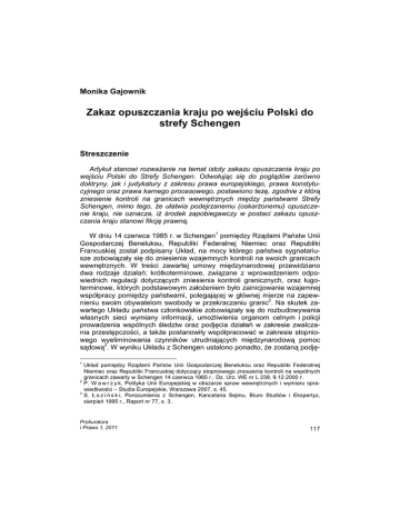 Zakaz opuszczania kraju po wejściu Polski do strefy Schengen Monika Gajownik Zakaz opuszczania kraju po wejściu Polski do strefy Schengen Streszczenie Artykuł stanowi rozwaŜanie na temat istoty zakazu opuszczania kraju po wejściu Polski do Strefy Schengen. Odwołując się do poglądów zarówno doktryny, jak i judykatury z zakresu prawa europejskiego, prawa konstytucyjnego oraz prawa karnego procesowego, postawiono tezę, zgodnie z którą zniesienie kontroli na granicach wewnętrznych między państwami Strefy Schengen, mimo tego, Ŝe ułatwia podejrzanemu (oskarŜonemu) opuszczenie kraju, nie oznacza, iŜ środek zapobiegawczy w postaci zakazu opuszczania kraju stanowi fikcję prawną. W dniu 14 czerwca 1985 r. w Schengen1 pomiędzy Rządami Państw Unii Gospodarczej Beneluksu, Republiki Federalnej Niemiec oraz Republiki Francuskiej został podpisany Układ, na mocy którego państwa sygnatariusze zobowiązały się do zniesienia wzajemnych kontroli na swoich granicach wewnętrznych. W treści zawartej umowy międzynarodowej przewidziano dwa rodzaje działań: krótkoterminowe, związane z wprowadzeniem odpowiednich regulacji dotyczących zniesienia kontroli granicznych, oraz ługoterminowe, których podstawowym załoŜeniem było zainicjowanie wzajemnej współpracy pomiędzy państwami, polegającej w głównej mierze na zapewnieniu swoim obywatelom swobody w przekraczaniu granic2. Na skutek zawartego Układu państwa członkowskie zobowiązały się do rozbudowywania własnych sieci wymiany informacji, umoŜliwienia organom celnym i policji prowadzenia wspólnych śledztw oraz podjęcia działań w zakresie zwalczania przestępczości, a takŜe postanowiły współpracować w zakresie stopniowego wyeliminowania czynników utrudniających międzynarodową pomoc sądową3. W wyniku Układu z Schengen ustalono ponadto, Ŝe zostaną podję1 2 3 Układ pomiędzy Rządami Państw Unii Gospodarczej Beneluksu oraz Republiki Federalnej Niemiec oraz Republiki Francuskiej dotyczący stopniowego znoszenia kontroli na wspólnych granicach zawarty w Schengen 14 czerwca 1985 r., Dz. Urz. WE nr L 239, 9.12.2000 r. P. W a w r z y k, Polityka Unii Europejskiej w obszarze spraw wewnętrznych i wymiaru sprawiedliwości – Studia Europejskie, Warszawa 2007, s. 45. S. Ł o z i ń s k i, Porozumienia z Schengen, Kancelaria Sejmu, Biuro Studiów i Ekspertyz, sierpień 1995 r., Raport nr 77, s. 3. Prokuratura i Prawo 1, 2011 117 M. Gajownik te dodatkowe działania, które będą miały na celu zapewnienie obywatelom duŜego poziomu bezpieczeństwa, a takŜe przyczynią się do zapobieŜenia nieuczciwej imigracji4. Na mocy uchwały Sejmu z dnia 20 grudnia 2007 r. Rzeczpospolita Polska przyjęła decyzję Rady Unii Europejskiej w sprawie stosowania „dorobku prawnego Schengen”5. Z dniem 21 grudnia 2007 r. zostały zniesione kontrole na wewnętrznych, lądowych granicach Rzeczypospolitej Polskiej z Republiką Czeską, Republiką Litewską, Republiką Federalną Niemiec i Republiką Słowacką6. Zniesienie kontroli na wewnętrznych granicach umoŜliwiło obywatelom polskim swobodne poruszanie się pomiędzy krajami Strefy Schengen, jak równieŜ ułatwiło w znaczący sposób opuszczenie kraju. Na skutek akcesji Polski do Schengen zarówno w doktrynie, jak i w praktyce zaczęto zastanawiać się nad kwestią, czy poddanie się regułom Acquis Schengen spowodowało zmianę istoty środka zapobiegawczego w postaci zakazu opuszczania kraju, którego celem jest zabezpieczenie prawidłowego toku postępowania zarówno przygotowawczego, jak i sądowego, poprzez uniemoŜliwienie podejrzanemu (oskarŜonemu) wyjazdu poza granice państwa7. P. Hofmański8 wyraził pogląd, Ŝe juŜ po wstąpieniu Polski do wspólnoty europejskiej skuteczność zakazu opuszczania kraju została osłabiona. W następstwie zaś dołączenia do Strefy Schengen procedura wzajemnego przekazywania pomiędzy państwami UE osób ściganych została w duŜym stopniu odformalizowana. Podobny pogląd wyraził S. Waltoś9, twierdząc, iŜ z chwilą dołączenia Polski do Strefy Schengen zakaz opuszczania kraju w praktyce stracił moc. Według autora swoboda podróŜowania po terytorium Unii Europejskiej (za wyjątkiem Wielkiej Brytanii i Irlandii) w znacznym stopniu ograniczyła skuteczność środka zapobiegawczego w postaci zakazu opuszczania kraju. ZauwaŜyć naleŜy, Ŝe kwestia dotycząca istoty środka zapobiegawczego w postaci zakazu opuszczania kraju po wejściu Polski do Strefy Schengen stanowi w procedurze karnej zagadnienie problemowe. Z jednej strony 4 P. W a w r z y k, Polityka Unii Europejskiej…, op. cit., s. 38. Na Acquis Schengen składają się Układ z Schengen podpisany w dniu 14 czerwca 1985 r. przez państwa Unii Gospodarczej Beneluksu, Republikę Federalną Niemiec i Republikę Francuską w sprawie stopniowego znoszenia kontroli na wspólnych granicach, Konwencja Wykonawcza do układu z Schengen podpisana w dniu 19 czerwca 1990 r., protokoły i akty przystąpienia innych państw członkowskich oraz oświadczenia i akty przyjęte przez Komitet Wykonawczy ustanowiony przez Konwencję, a takŜe przez organy, którym Komitet przyznał uprawnienia decyzyjne. 6 Monitor Polski z dnia 31 grudnia 2007 r., Nr 100. 7 R. A. S t e f a ń s k i, Środek zapobiegawczy zakazu opuszczania kraju, Prokuratura i Prawo 11–12, 1995, s. 42. 8 P. H o f m a ń s k i, E. S a d z i k, K. Z g r y z e k, Kodeks postępowania karnego, t. I: Komentarz do art. 1–296, pod red. P. H o f m a ń s k i e g o, Warszawa 2007, s. 1245. 9 S. W a l t o ś, Polskie prawo karne procesowe – zarys systemu, Warszawa 2008, s. 446. 5 118 Prokuratura i Prawo 1, 2011 Zakaz opuszczania kraju po wejściu Polski do strefy Schengen w postępowaniu karnym funkcjonują uregulowane w k.p.k. środki przymusu, w tym zakaz opuszczania kraju, z drugiej zaś Acquis Schengen znosi kontrole na wewnętrznych granicach państwa, przez co umoŜliwia podejrzanym (oskarŜonym) w 