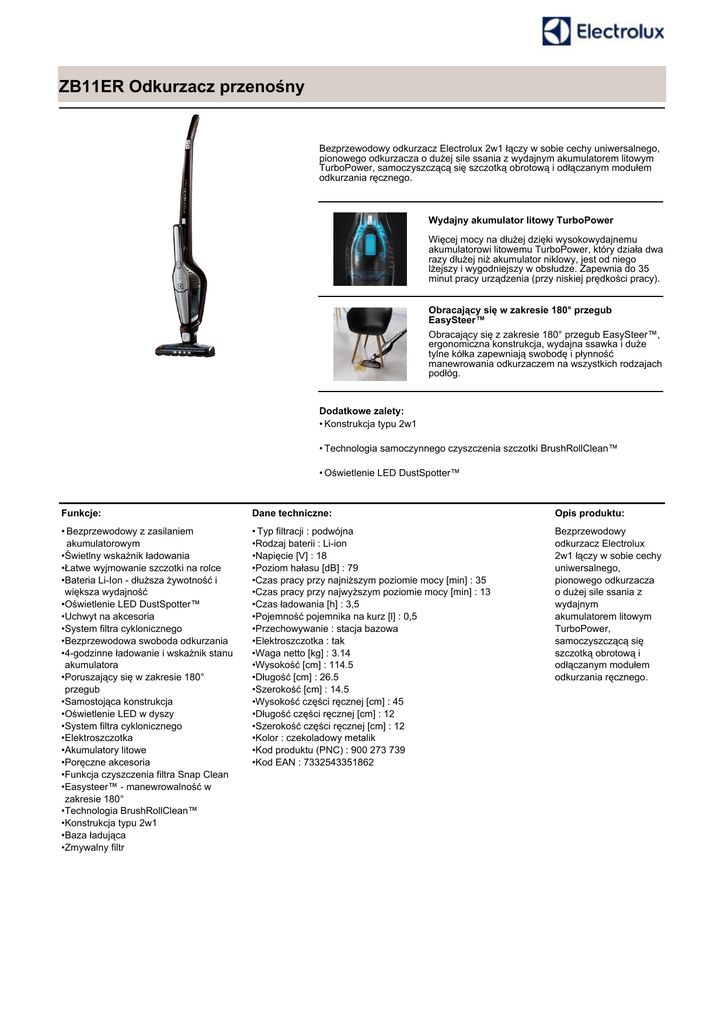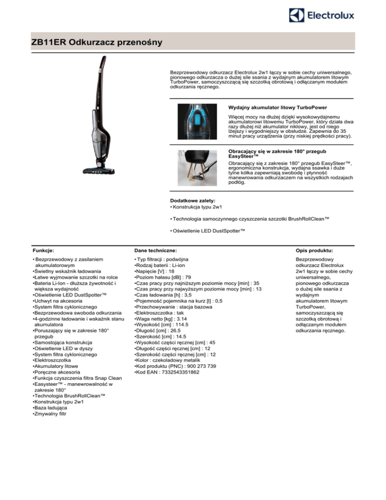ZB11ER Odkurzacz przenośny Bezprzewodowy odkurzacz Electrolux 2w1 łączy w sobie cechy uniwersalnego, pionowego odkurzacza o dużej sile ssania z wydajnym akumulatorem litowym TurboPower, samoczyszczącą się szczotką obrotową i odłączanym modułem odkurzania ręcznego. Wydajny akumulator litowy TurboPower Więcej mocy na dłużej dzięki wysokowydajnemu akumulatorowi litowemu TurboPower, który działa dwa razy dłużej niż akumulator niklowy, jest od niego lżejszy i wygodniejszy w obsłudze. Zapewnia do 35 minut pracy urządzenia (przy niskiej prędkości pracy). Obracający się w zakresie 180° przegub EasySteer™ Obracający się z zakresie 180° przegub EasySteer™, ergonomiczna konstrukcja, wydajna ssawka i duże tylne kółka zapewniają swobodę i płynność manewrowania odkurzaczem na wszystkich rodzajach podłóg. Dodatkowe zalety: • Konstrukcja typu 2w1 • Technologia samoczynnego czyszczenia szczotki BrushRollClean™ • Oświetlenie LED DustSpotter™ Funkcje: Dane techniczne: Opis produktu: • Bezprzewodowy z zasilaniem akumulatorowym •Świetlny wskaźnik ładowania •Łatwe wyjmowanie szczotki na rolce •Bateria Li-Ion - dłuższa żywotność i większa wydajność •Oświetlenie LED DustSpotter™ •Uchwyt na akcesoria •System filtra cyklonicznego •Bezprzewodowa swoboda odkurzania •4-godzinne ładowanie i wskaźnik stanu akumulatora •Poruszający się w zakresie 180° przegub •Samostojąca konstrukcja •Oświetlenie LED w dyszy •System filtra cyklonicznego •Elektroszczotka •Akumulatory litowe •Poręczne akcesoria •Funkcja czyszczenia filtra Snap Clean •Easysteer™ - manewrowalność w zakresie 180° •Technologia BrushRollClean™ •Konstrukcja typu 2w1 •Baza ładująca •Zmywalny filtr • Typ filtracji : podwójna •Rodzaj baterii : Li-ion •Napięcie [V] : 18 •Poziom hałasu [dB] : 79 •Czas pracy przy najniższym poziomie mocy [min] : 35 •Czas pracy przy najwyższym poziomie mocy [min] : 13 •Czas ładowania [h] : 3,5 •Pojemność pojemnika na kurz [l] : 0,5 •Przechowywanie : stacja bazowa •Elektroszczotka : tak •Waga netto [kg] : 3.14 •Wysokość [cm] : 114.5 •Długość [cm] : 26.5 •Szerokość [cm] : 14.5 •Wysokość części ręcznej [cm] : 45 •Długość części ręcznej [cm] : 12 •Szerokość części ręcznej [cm] : 12 •Kolor : czekoladowy metalik •Kod produktu (PNC) : 900 273 739 •Kod EAN : 7332543351862 Bezprzewodowy odkurzacz Electrolux 2w1 łączy w sobie cechy uniwersalnego, pionowego odkurzacza o dużej sile ssania z wydajnym akumulatorem litowym TurboPower, samoczyszczącą się szczotką obrotową i odłączanym modułem odkurzania ręcznego.