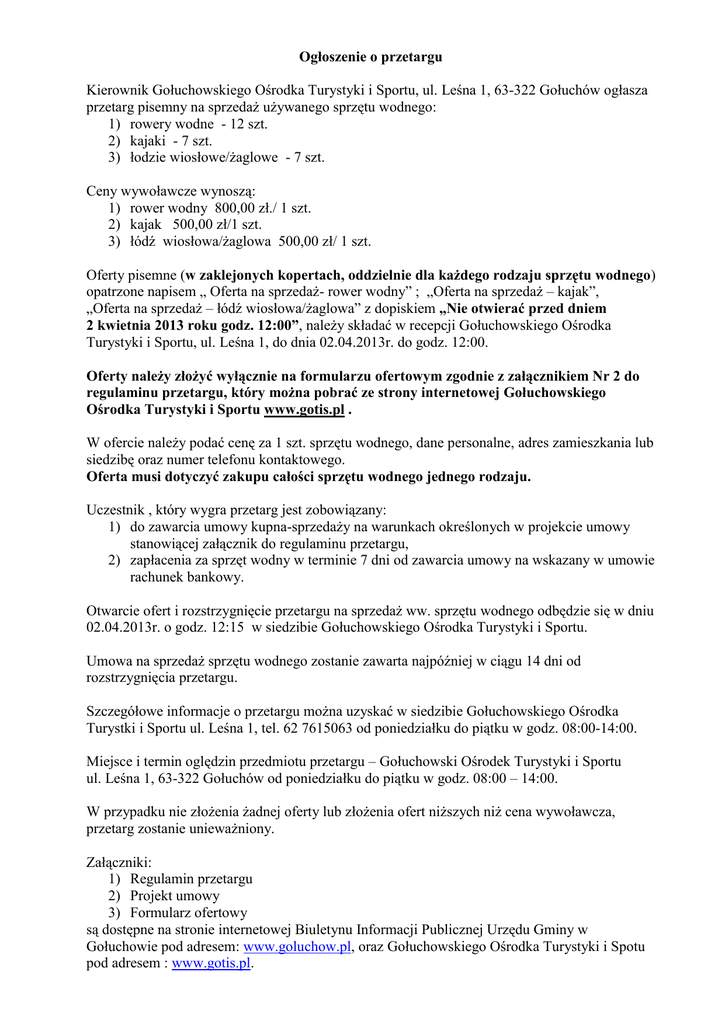 Ogłoszenie o przetargu Kierownik Gołuchowskiego Ośrodka Turystyki i Sportu, ul. Leśna 1, 63-322 Gołuchów ogłasza przetarg pisemny na sprzedaż używanego sprzętu wodnego: 1) rowery wodne - 12 szt. 2) kajaki - 7 szt. 3) łodzie wiosłowe/żaglowe - 7 szt. Ceny wywoławcze wynoszą: 1) rower wodny 800,00 zł./ 1 szt. 2) kajak 500,00 zł/1 szt. 3) łódź wiosłowa/żaglowa 500,00 zł/ 1 szt. Oferty pisemne (w zaklejonych kopertach, oddzielnie dla każdego rodzaju sprzętu wodnego) opatrzone napisem „ Oferta na sprzedaż- rower wodny” ; „Oferta na sprzedaż – kajak”, „Oferta na sprzedaż – łódź wiosłowa/żaglowa” z dopiskiem „Nie otwierać przed dniem 2 kwietnia 2013 roku godz. 12:00”, należy składać w recepcji Gołuchowskiego Ośrodka Turystyki i Sportu, ul. Leśna 1, do dnia 02.04.2013r. do godz. 12:00. Oferty należy złożyć wyłącznie na formularzu ofertowym zgodnie z załącznikiem Nr 2 do regulaminu przetargu, który można pobrać ze strony internetowej Gołuchowskiego Ośrodka Turystyki i Sportu www.gotis.pl . W ofercie należy podać cenę za 1 szt. sprzętu wodnego, dane personalne, adres zamieszkania lub siedzibę oraz numer telefonu kontaktowego. Oferta musi dotyczyć zakupu całości sprzętu wodnego jednego rodzaju. Uczestnik , który wygra przetarg jest zobowiązany: 1) do zawarcia umowy kupna-sprzedaży na warunkach określonych w projekcie umowy stanowiącej załącznik do regulaminu przetargu, 2) zapłacenia za sprzęt wodny w terminie 7 dni od zawarcia umowy na wskazany w umowie rachunek bankowy. Otwarcie ofert i rozstrzygnięcie przetargu na sprzedaż ww. sprzętu wodnego odbędzie się w dniu 02.04.2013r. o godz. 12:15 w siedzibie Gołuchowskiego Ośrodka Turystyki i Sportu. Umowa na sprzedaż sprzętu wodnego zostanie zawarta najpóźniej w ciągu 14 dni od rozstrzygnięcia przetargu. Szczegółowe informacje o przetargu można uzyskać w siedzibie Gołuchowskiego Ośrodka Turystki i Sportu ul. Leśna 1, tel. 62 7615063 od poniedziałku do piątku w godz. 08:00-14:00. Miejsce i termin oględzin przedmiotu przetargu – Gołuchowski Ośrodek Turystyki i Sportu ul. Leśna 1, 63-322 Gołuchów od poniedziałku do piątku w godz. 08:00 – 14:00. W przypadku nie złożenia żadnej oferty lub złożenia ofert niższych niż cena wywoławcza, przetarg zostanie unieważniony. Załączniki: 1) Regulamin przetargu 2) Projekt umowy 3) Formularz ofertowy są dostępne na stronie internetowej Biuletynu Informacji Publicznej Urzędu Gminy w Gołuchowie pod adresem: www.goluchow.pl, oraz Gołuchowskiego Ośrodka Turystyki i Spotu pod adresem : www.gotis.pl.