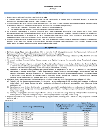 REGULAMIN PROMOCJI „Wakacje” §1 Czas trwania i Uczestnicy promocji 1. Promocja trwa od dnia 07.03.2016 r. do 31.07.2016 roku. 2. Z Promocji mogą skorzystać pełnoletnie osoby fizyczne, zamieszkałe w zasięgu Sieci na obszarach których, ze względów technicznych, możliwe jest korzystanie z Usług Dostawcy Usług. 3. Z Promocji mogą skorzystać Dotychczasowi Abonenci, przy czym przez Dotychczasowego Abonenta rozumie się Abonenta, który w momencie podpisania Umowy na Promocyjnych Warunkach w ramach niniejszej Promocji: a) związany jest z Dostawcą Usług inną, ważną Umową na świadczenie Usług, b) nie zalega względem Dostawcy Usług z płatnościami z jakiegokolwiek tytułu. 4. W przypadku skorzystania z niniejszej Promocji przez Dotychczasowych Abonentów suma miesięcznych Opłat (Opłat Abonamentowych oraz Opłaty Powiązanej) naliczanych w ramach skorzystania z niniejszej Promocji nie może być w żadnym z Okresów Rozliczeniowych wchodzących w Okres Zobowiązania mniejsza od sumy Opłat naliczanych bezpośrednio przed zawarciem Umowy na Warunkach Promocyjnych w ramach niniejszej Promocji. 5. Z Promocji mogą skorzystać Nowi Abonenci, przy czym przez Nowego Abonenta rozumie się Abonenta, którego w okresie dwóch miesięcy przed zawarciem Umowy na Promocyjnych Warunkach w ramach niniejszej Promocji nie łączyła z Dostawcą Usług żadna ważna Umowa na świadczenie usług, w tym telekomunikacyjnych. §2 Oferta i Ulgi 1. Za Paczkę Usług objętą promocją uważa się zbiór co najmniej dwóch Usług podstawowych, skonfigurowanych i oferowanych łącznie przez Dostawcę Usług, z których przynajmniej jedna stanowi Nową Usługę. Za Nową Usługę uważa się Usługę, z której Abonent nie korzystał w okresie 2 miesięcy u Dostawcy Usług do chwili zawarcia Umowy lub zmiany jej Warunków. 2. W ramach niniejszej Promocji Opłata Abonamentowa oraz Opłata Powiązana (w przypadku Usługi Telewizyjnej) ulegają obniżeniu: a) do 0 zł (zero złotych) wyłącznie na jedną z Usług: Telewizji lub Szerokopasmowego dostępu do Internetu. Obniżenie Opłaty, o którym mowa w zdaniu poprzedzającym, będzie obowiązywało od dnia zawarcia Umowy na Promocyjnych Warunkach Umowy w ramach niniejszej Promocji do końca wakacji, tj. 31 sierpnia 2016 roku; b) dodatkowo w ramach niniejszej Promocji po upływie terminu, o którym mowa w pkt. 2.a - w stosunku do usług objętych obniżeniem, o którym mowa w pkt. 3 - oraz od pierwszego pełnego miesiąca rozliczeniowego - w stosunku do usług nie objętych obniżeniem, o którym mowa w pkt. 3 - Abonent uzyskuje obniżenie Opłat Abonamentowych (i Opłat Powiązanych – w przypadku Usługi Telewizji), w stosunku do ceny cennikowej, do kwot podanych w Tabeli nr 1. Obniżenie Opłat, o którym mowa w zdaniu poprzedzającym, obowiązuje do końca Okresu Zobowiązania. 3. Obniżenie Opłaty Abonamentowej i Opłaty Powiązanej, o którym mowa w punkcie 2.a dotyczy nowo nabywanych Usług: a) Telewizji lub Szerokopasmowego dostępu do Internetu – w przypadku zawarcia lub przedłużenia Umowy na świadczenie tylko jednej z tych Usług. Dotyczy to tylko i wyłącznie pojedynczych, wybranych samodzielnie przez Abonenta, Usług podstawowych. b) Szerokopasmowego dostępu do Internetu – w przypadku zawarcia lub przedłużenia Umowy na świadczenie Usług Telewizji i Szerokopasmowego dostępu do Internetu. Dotyczy to tylko i wyłącznie skonfigurowanych i oferowanych przez Dostawcę Usług paczek Usług. c) Telewizji – w przypadku zawarcia lub przedłużenia Umowy na świadczenie Usługi Telewizji i Usługi Telefonii Stacjonarnej. Dotyczy to tylko i wyłącznie skonfigurowanych i oferowanych przez Dostawcę Usług paczek Usług. 4. W poniższej tabeli zostały określone Usługi i Paczki Usług objęte niniejszą promocją wraz z informacją dotyczącą opłat, o których mowa w pkt. 2: Tabela nr 1 Łączna Opłata Opłaty Abonamentowe i Abonamentowa i Opłata Lp Nazwa Usługi lub Paczki Usług Opłaty Powiązane do Powiązana po 31.08.2016 r. 31.08.2016 r. do końca Okresu Zobowiązania 1 TV cyfrowa Pakiet Stalowy HD 0,00 zł 5,90 zł 2 TV cyfrowa Pakiet Srebrny HD 0,00 zł 29,90 zł 3 TV cyfrowa Pakiet Złoty HD 0,00 zł 49,90 zł 4 TV cyfrowa Pakiet Platyna HD 0,00 zł 64,90 zł 5 Internet 10Mb 0,00 zł 35,00 zł 6 Internet 30Mb 0,00 zł 39,00 zł 7 Internet 50Mb 0,00 zł 50,00 zł 8 9 10 11 12 13 14 15 16 17 18 19 20 21 22 23 24 25 26 27 28 Internet 100Mb Internet 150Mb TV cyfrowa Pakiet Srebrny HD / TEL – Plan Domowy 50 TV cyfrowa Pakiet Srebrny HD / TEL - Domowy 250 TV cyfrowa Pakiet Srebrny HD / TEL - Domowy Bez Limitu TV cyfrowa Pakiet Złoty HD / TEL - Domowy 50 TV cyfrowa Pakiet Złoty HD / TEL - Domowy 250 TV cyfrowa Pakiet Złoty HD / TEL - Domowy Bez Limitu TV cyfrowa Pakiet Platynowy HD / TEL - Domowy 50 TV cyfrowa Pakiet Platynowy HD / TEL - Domowy 250 TV cyfrowa Pakiet Platynowy HD / TEL - Domowy Bez Limitu TV cyfrowa Pakiet Srebrny HD / Internet 10Mb TV cyfrowa Pakiet Srebrny HD / Internet 30Mb TV cyfrowa Pakiet Srebrny HD / Internet 50Mb TV cyfrowa Pakiet Złoty HD / Internet 30Mb TV cyfrowa Pakiet Złoty HD / Internet 50Mb TV cyfrowa Pakiet Złoty HD / Internet 100Mb TV cyfrowa Pakiet Platynowy HD / Internet 30Mb TV cyfrowa Pakiet Platynowy HD / Internet 50Mb TV cyfrowa Pakiet Platynowy HD / Internet 100Mb TV cyfrowa Pakiet Platynowy HD / Internet 150Mb 0,00 zł 0,00 zł 0 zł / 15,00 zł 0 zł /20,00 zł 0 zł /25,00 zł 0 zł /15,00 zł 0 zł /20,00 zł 0 zł /25,00 zł 0 zł /15,00 zł 0 zł /20,00 zł 0 zł /25,00 zł 29,90 zł / 0 zł 29,90 zł / 0 zł 29,90 zł / 0 zł 44,90 zł /0 zł 44,90 zł / 0 zł 44,90 zł / 0 zł 59,90 zł / 0 zł 59,90 zł / 0 zł 59,90 zł / 0 zł 59,90 zł / 0 zł 55,00 zł 70,00 zł 39,90 zł 49,90 zł 54,90 zł 59,90 zł 64,90 zł 69,90 zł 74,90 zł 79,90 zł 84,90 zł 49,90 zł 59,90 zł 64,90 zł 74,90 zł 79,90 zł 84,90 zł 89,90 zł 94,90 zł 99,90 zł 109,90 zł 5. Wysok