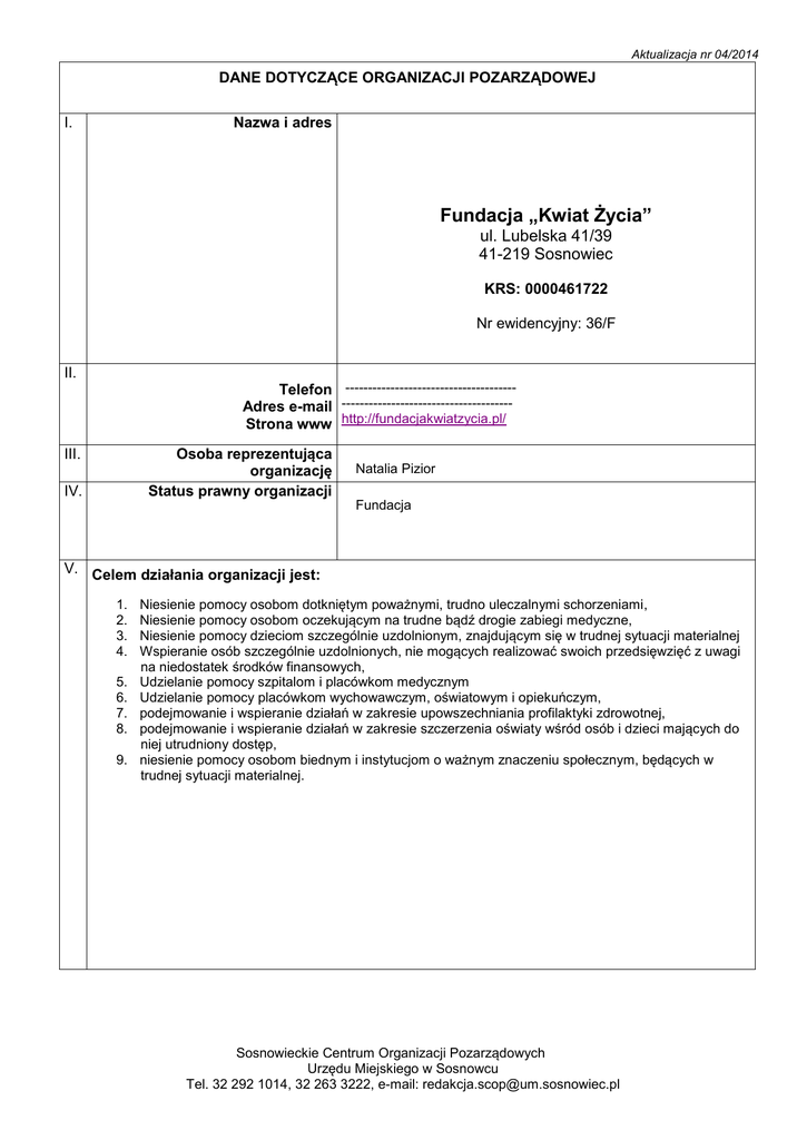 Aktualizacja nr 04/2014 DANE DOTYCZĄCE ORGANIZACJI POZARZĄDOWEJ Nazwa i adres I. Fundacja „Kwiat Życia” ul. Lubelska 41/39 41-219 Sosnowiec KRS: 0000461722 Nr ewidencyjny: 36/F II. Telefon -------------------------------------Adres e-mail -------------------------------------Strona www http://fundacjakwiatzycia.pl/ Osoba reprezentująca organizację Status prawny organizacji III. IV. Natalia Pizior Fundacja V. Celem działania organizacji jest: 1. 2. 3. 4. 5. 6. 7. 8. 9. Niesienie pomocy osobom dotkniętym poważnymi, trudno uleczalnymi schorzeniami, Niesienie pomocy osobom oczekującym na trudne bądź drogie zabiegi medyczne, Niesienie pomocy dzieciom szczególnie uzdolnionym, znajdującym się w trudnej sytuacji materialnej Wspieranie osób szczególnie uzdolnionych, nie mogących realizować swoich przedsięwzięć z uwagi na niedostatek środków finansowych, Udzielanie pomocy szpitalom i placówkom medycznym Udzielanie pomocy placówkom wychowawczym, oświatowym i opiekuńczym, podejmowanie i wspieranie działań w zakresie upowszechniania profilaktyki zdrowotnej, podejmowanie i wspieranie działań w zakresie szczerzenia oświaty wśród osób i dzieci mających do niej utrudniony dostęp, niesienie pomocy osobom biednym i instytucjom o ważnym znaczeniu społecznym, będących w trudnej sytuacji materialnej. Sosnowieckie Centrum Organizacji Pozarządowych Urzędu Miejskiego w Sosnowcu Tel. 32 292 1014, 32 263 3222, e-mail: [email protected]