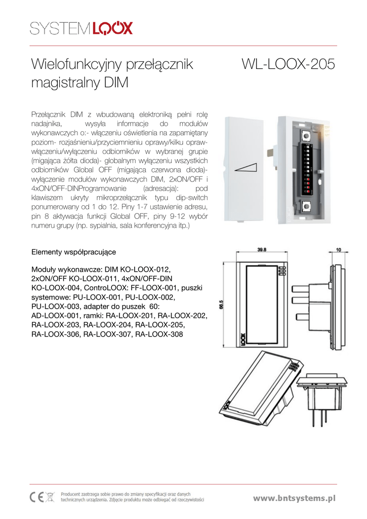 Wielofunkcyjny przełącznik magistralny DIM Przełącznik DIM z wbudowaną elektroniką pełni rolę nadajnika, wysyła informacje do modułów wykonawczych o:- włączeniu oświetlenia na zapamiętany poziom- rozjaśnieniu/przyciemnieniu oprawy/kilku oprawwłączeniu/wyłączeniu odbiorników w wybranej grupie (migająca żółta dioda)- globalnym wyłączeniu wszystkich odbiorników Global OFF (migająca czerwona dioda)wyłączenie modułów wykonawczych DIM, 2xON/OFF i 4xON/OFF-DINProgramowanie (adresacja): pod klawiszem ukryty mikroprzełącznik typu dip-switch ponumerowany od 1 do 12. Piny 1-7 ustawienie adresu, pin 8 aktywacja funkcji Global OFF, piny 9-12 wybór numeru grupy (np. sypialnia, sala konferencyjna itp.) Elementy współpracujące Moduły wykonawcze: DIM KO-LOOX-012, 2xON/OFF KO-LOOX-011, 4xON/OFF-DIN KO-LOOX-004, ControLOOX: FF-LOOX-001, puszki systemowe: PU-LOOX-001, PU-LOOX-002, PU-LOOX-003, adapter do puszek ᴓ60: AD-LOOX-001, ramki: RA-LOOX-201, RA-LOOX-202, RA-LOOX-203, RA-LOOX-204, RA-LOOX-205, RA-LOOX-306, RA-LOOX-307, RA-LOOX-308 WL-LOOX-205 Wielofunkcyjny przełącznik magistralny DIM Dane techniczne sposób montażu wersja kolorystyczna wymiary (szer. wys. gł.) napięcie zasilające wbudowane oświetlenie sposób adresowania ilość adresów kategoria Powered by TCPDF (www.tcpdf.org) szybkozłącze biały 39,8 x 66,7 x 42 mm 230V~ LED dip-switch 128 x 16 grup IP 40 WL-LOOX-205